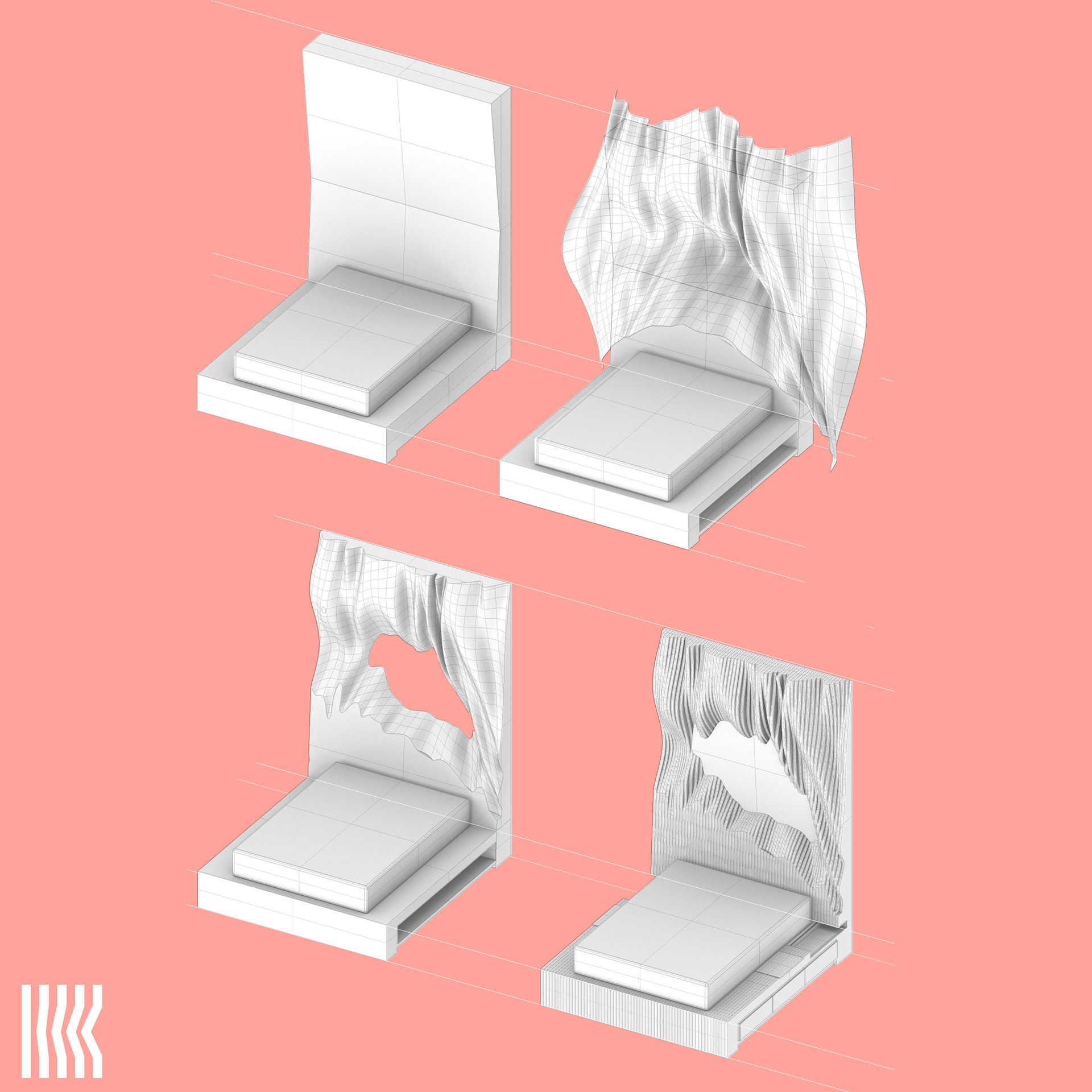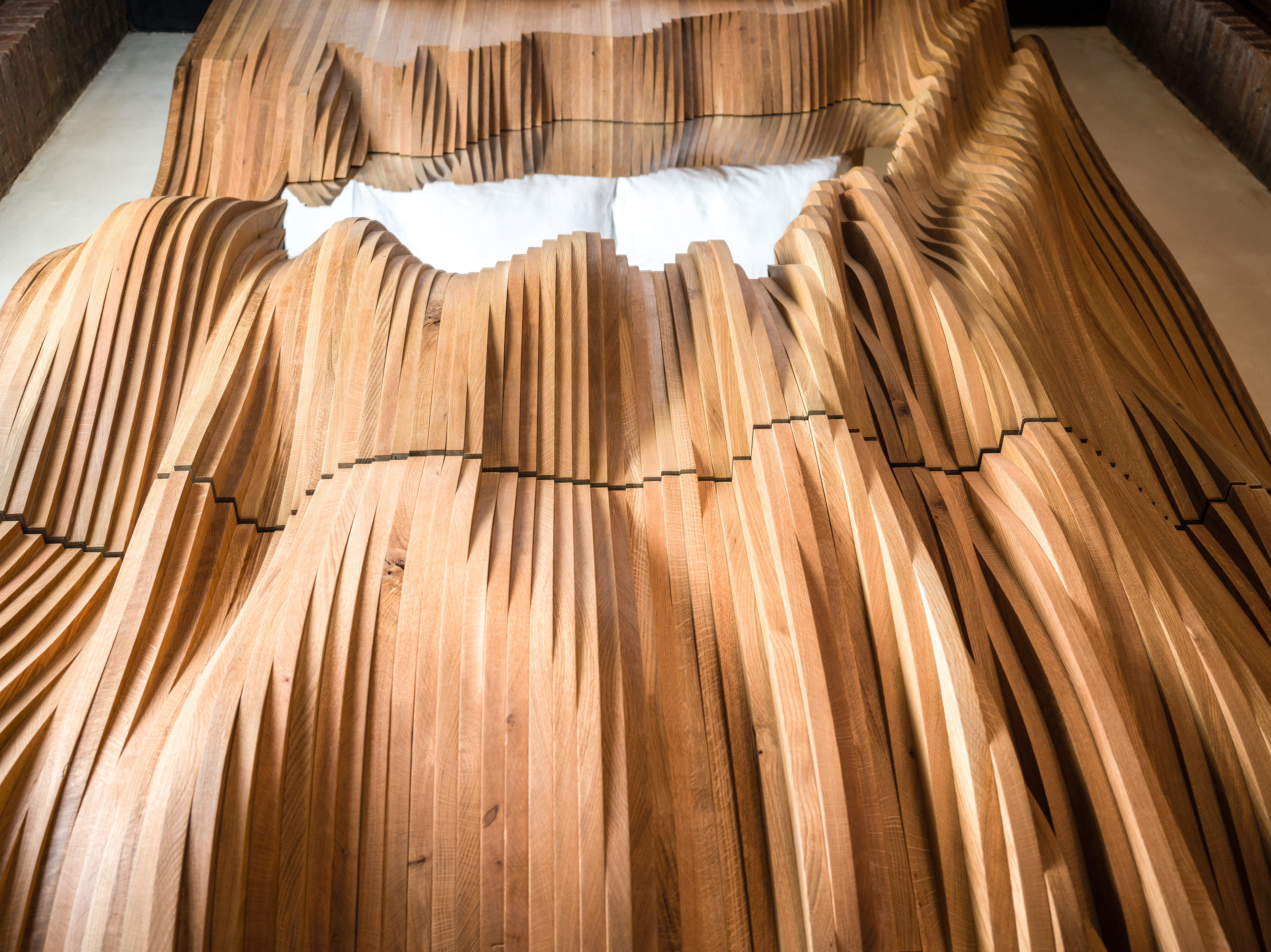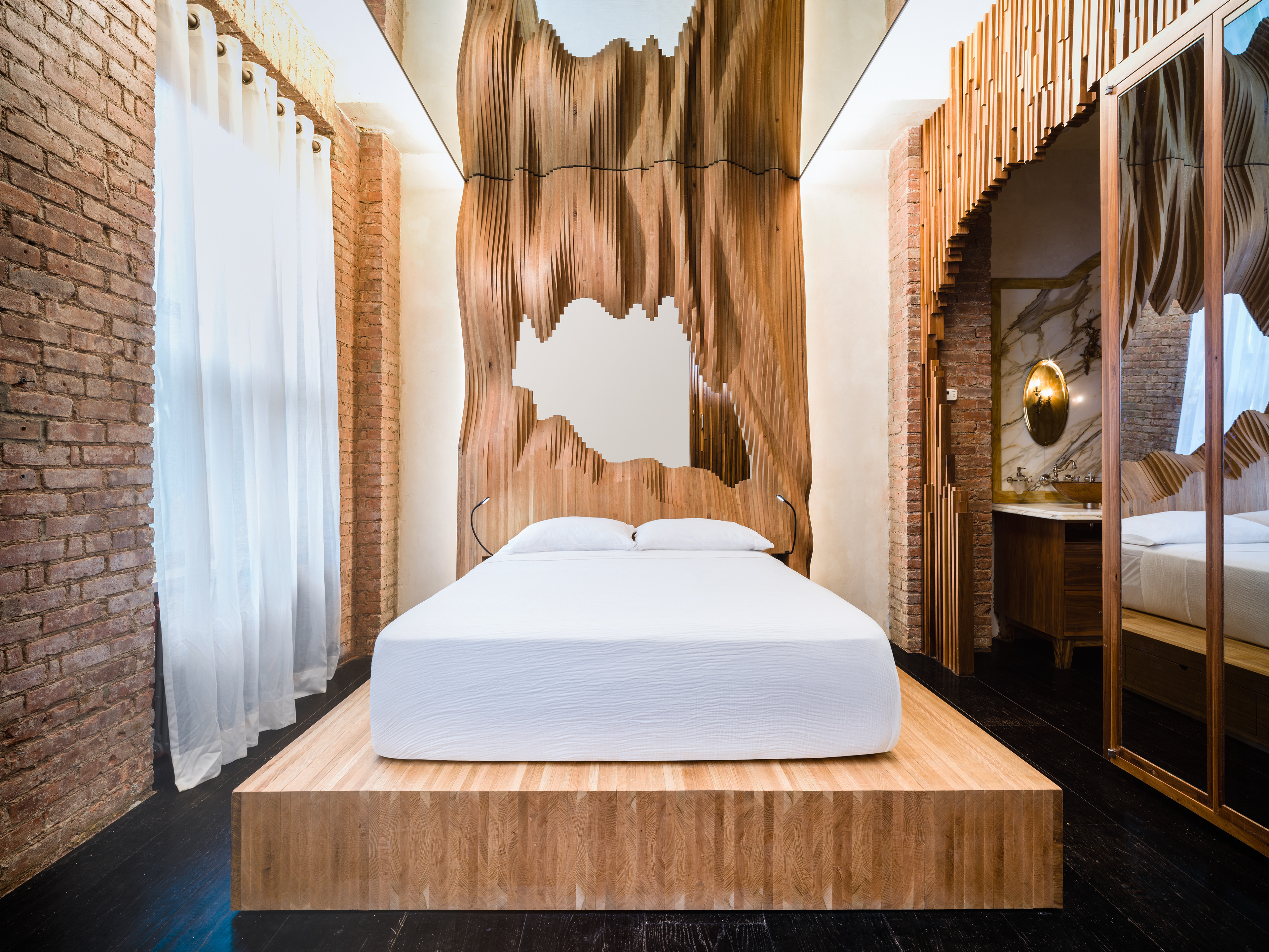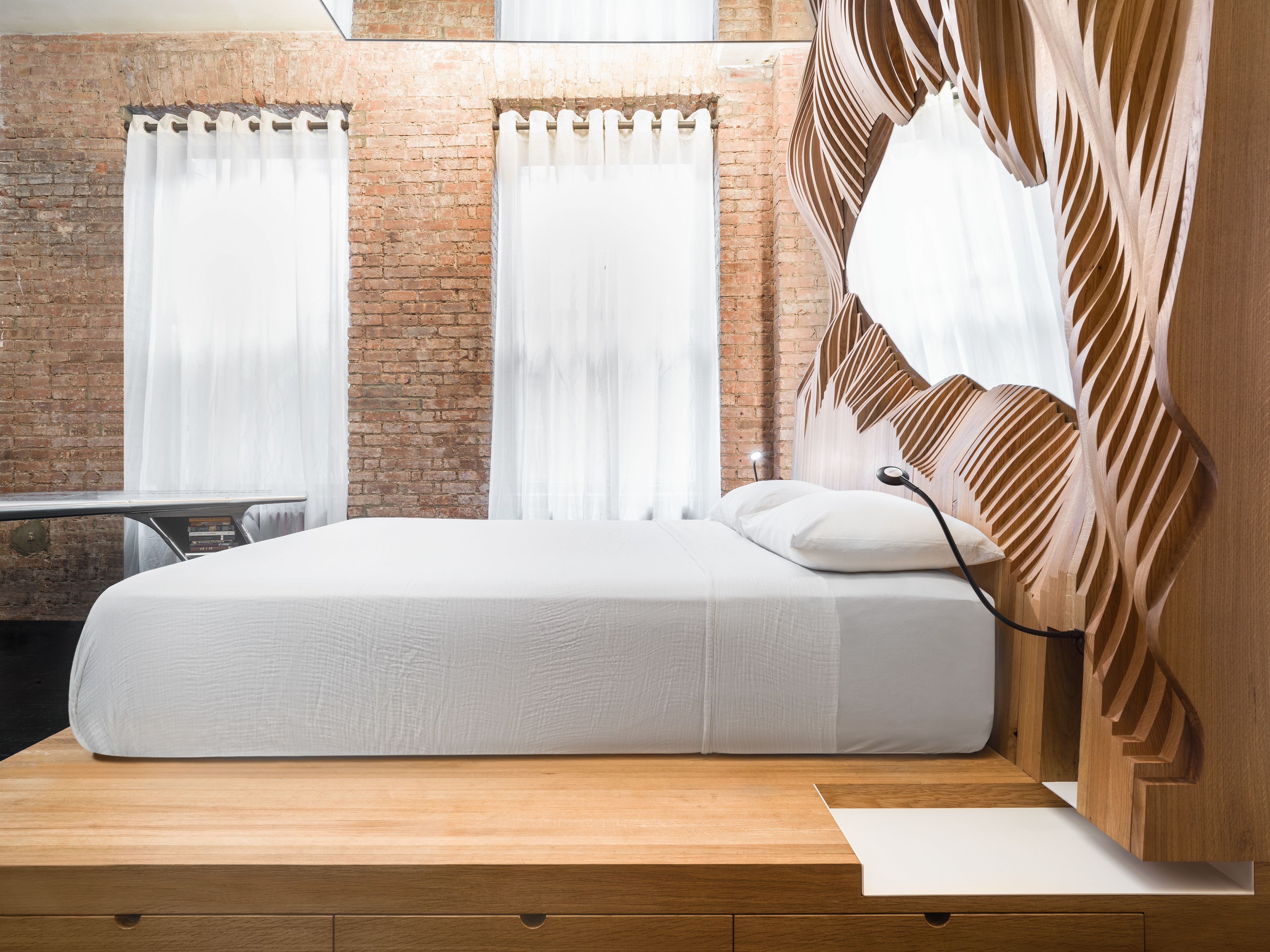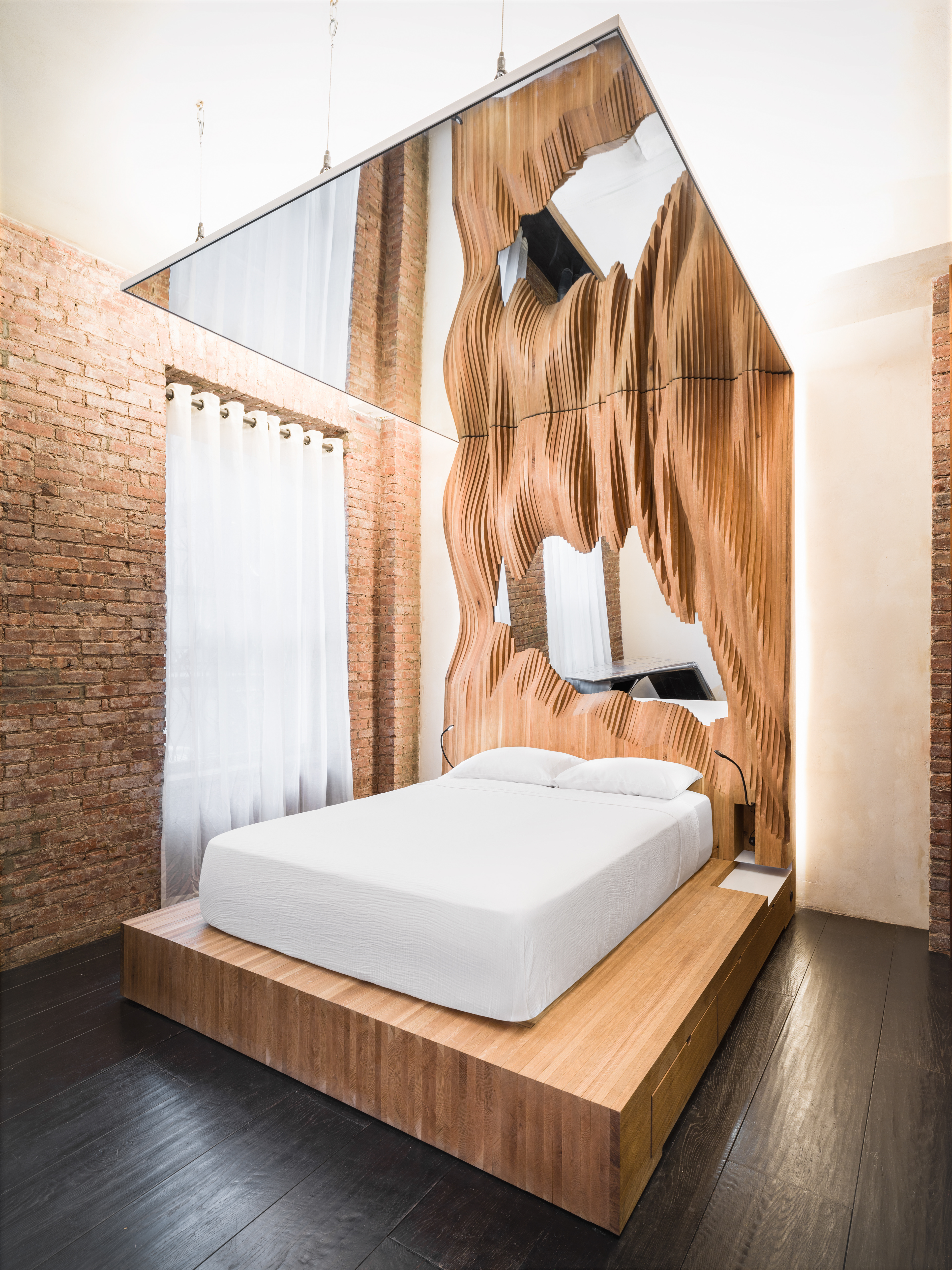 Fabric Bed is a sculptural bed installation that applies an architectural approach to furniture, creating a fluid gesture in hardwood. Commissioned by chef Frank Prisinzano and Arina Prisinzano for their NoHo home, the desire for balancing hardness and softness was one of the drivers for the piece. The execution resulted in forms inspired by draped fabric translated into thick slabs of white-oak. The 10’ tall headboard and platform was subtractively designed where the wood contours flow into a large mirror surface. The effect is reflected in a single piece of 8’x 6’ mirror suspended overhead, amplifying the effect and making the small bedroom feel larger. Fabric Bed also houses a range of functions including integrated lighting for the space, pivoting reading lights, flexible storage that converts into dining surfaces, and a sound system nested within the base.