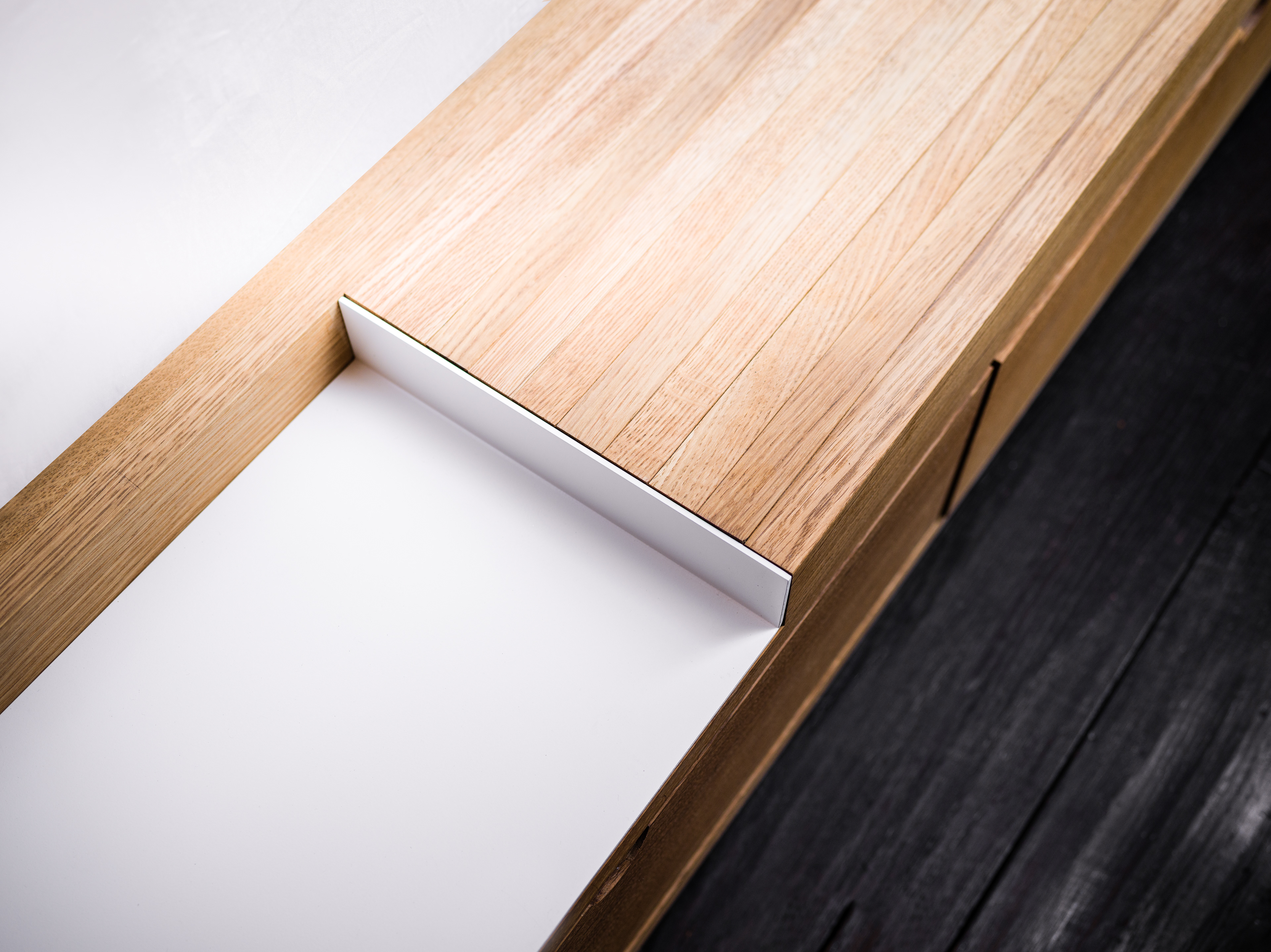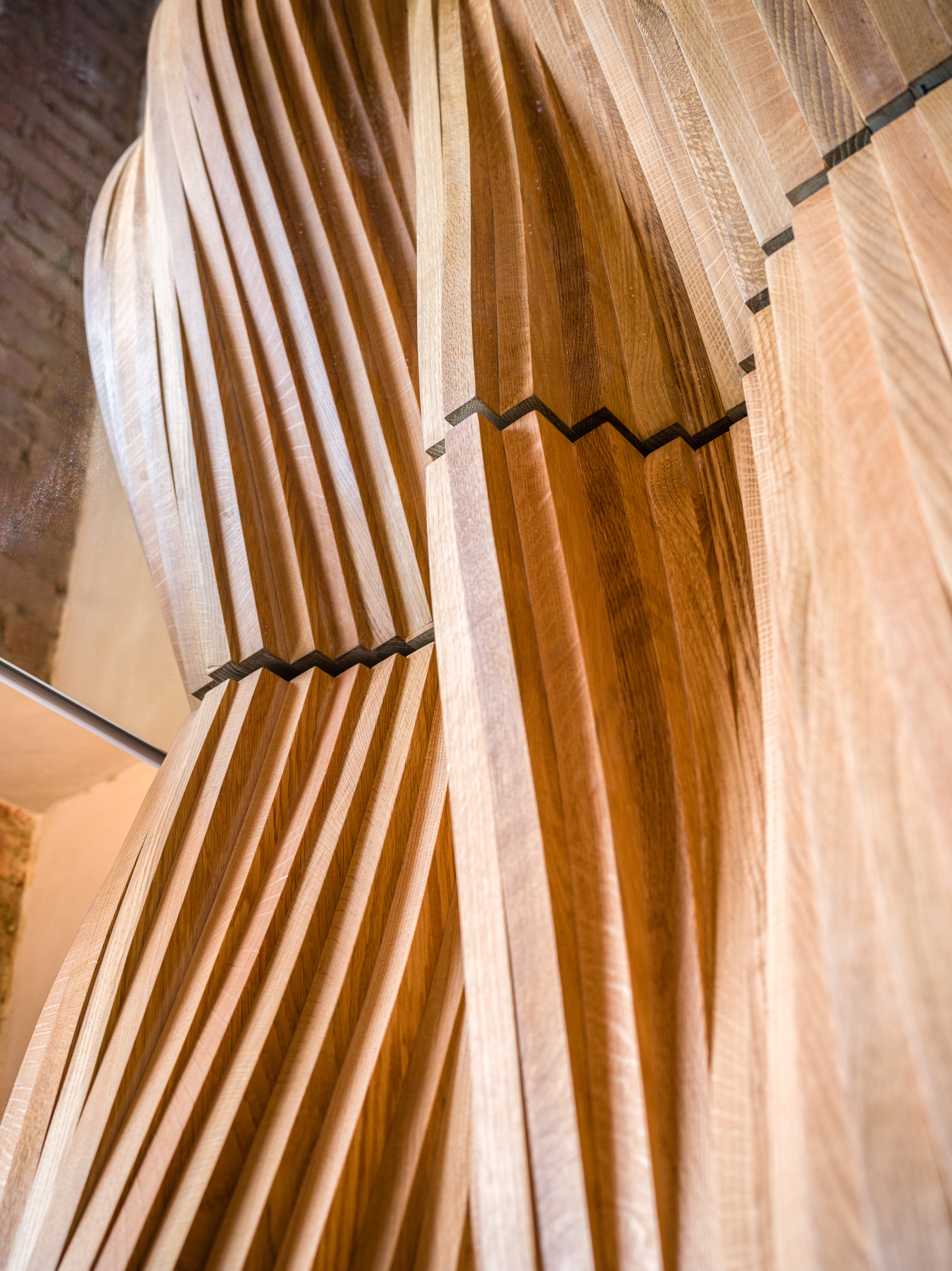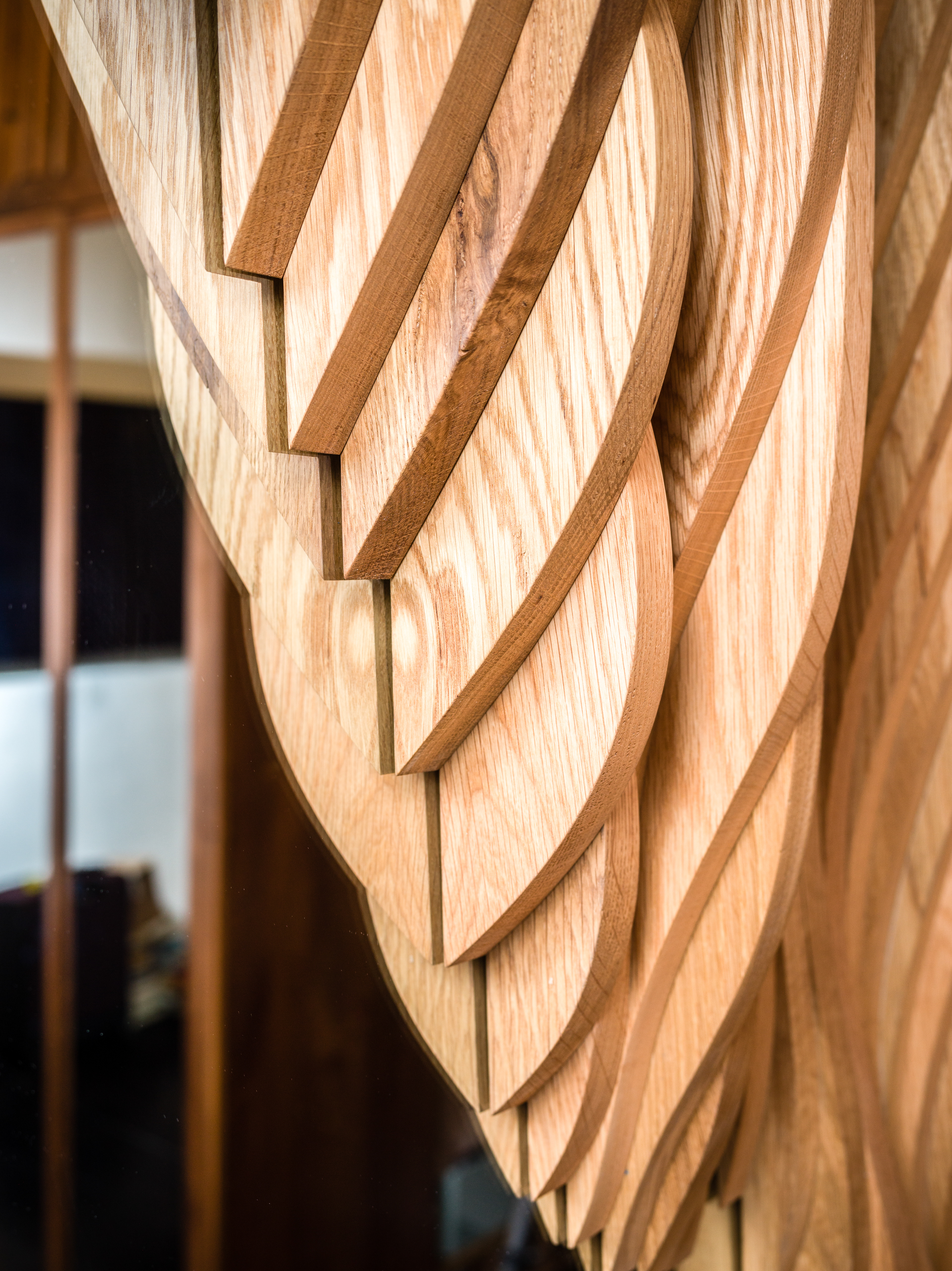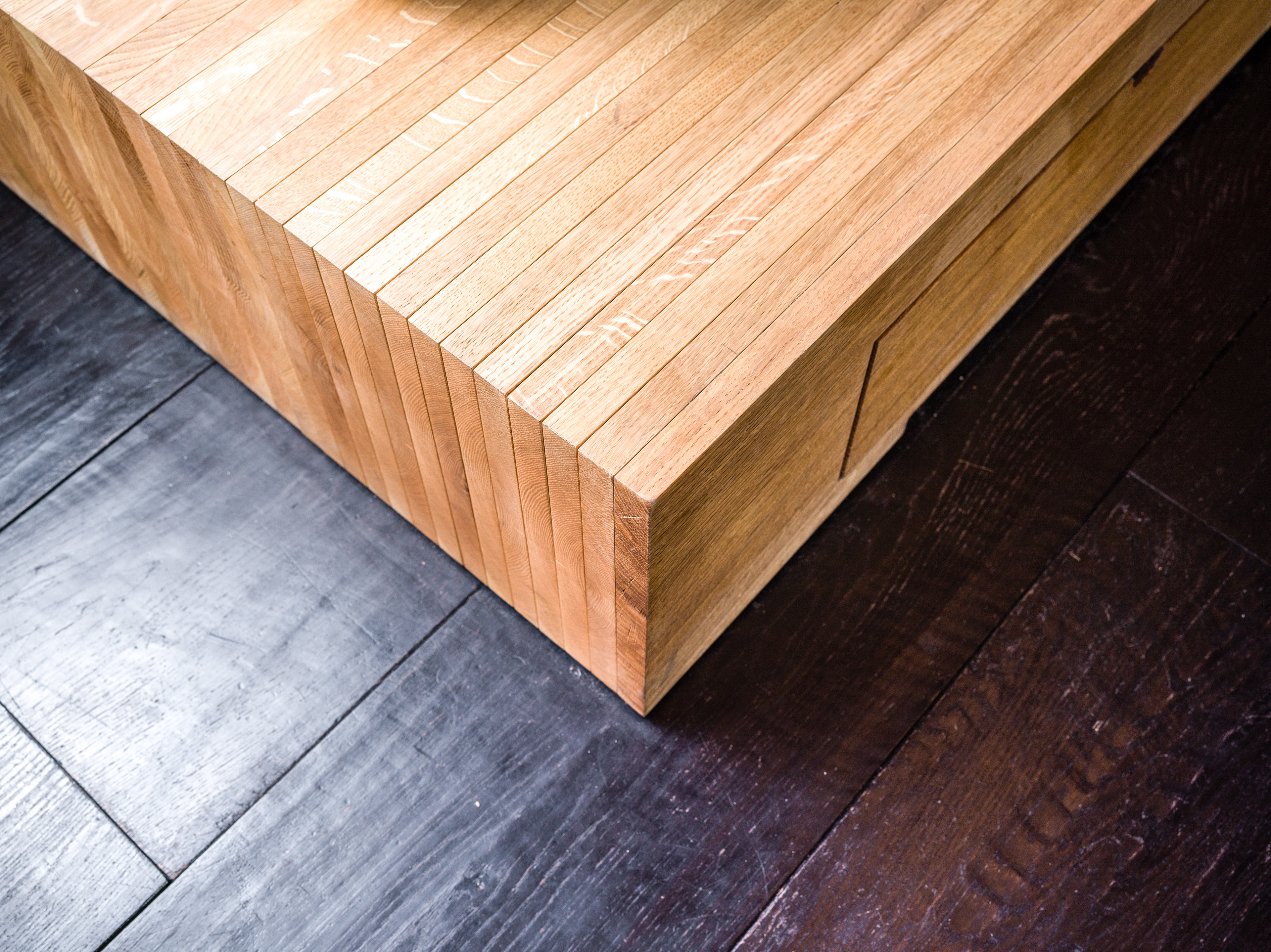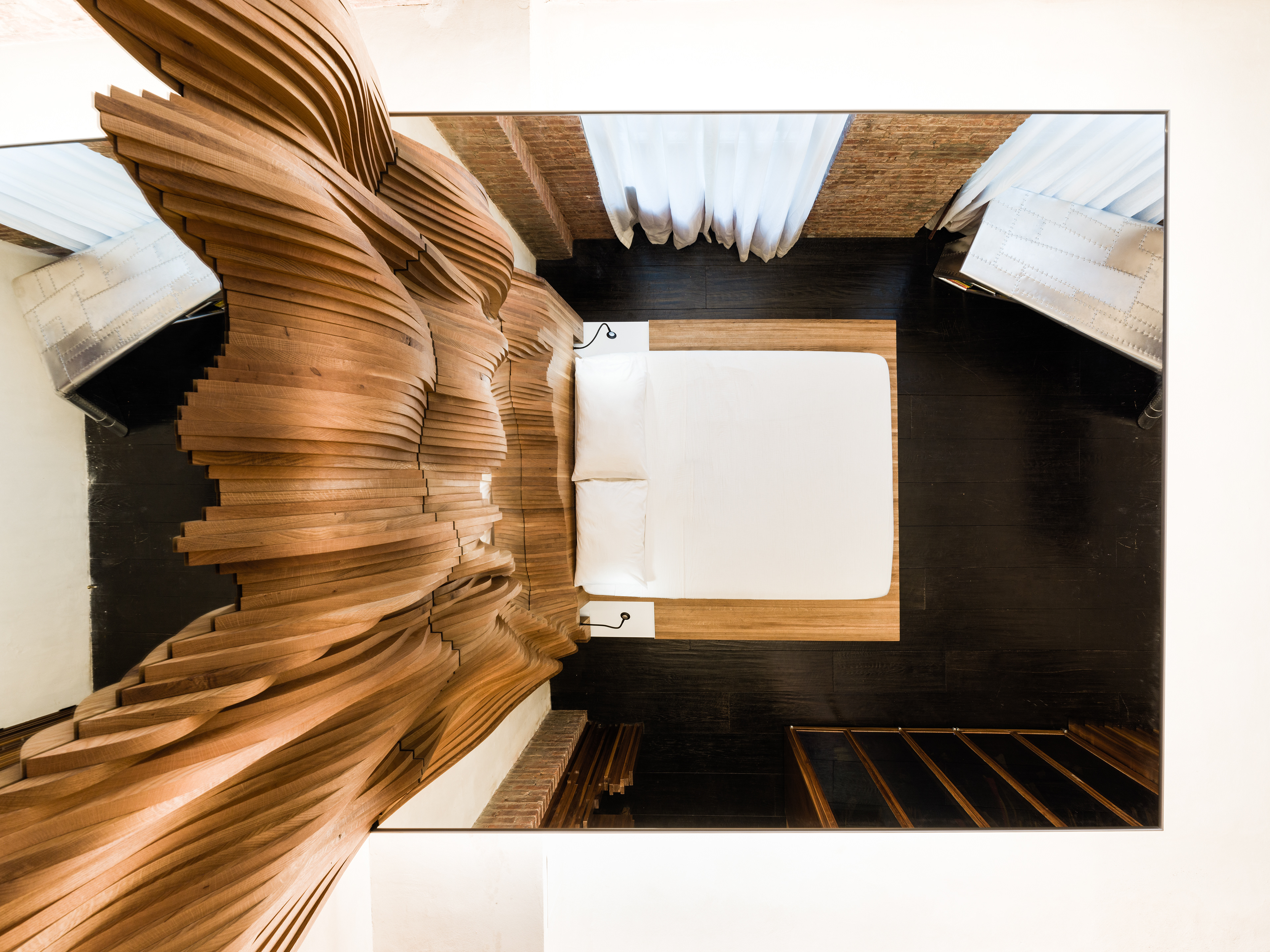 Fabric Bed is a sculptural bed installation that applies an architectural approach to furniture, creating a fluid gesture in hardwood. Commissioned by chef Frank Prisinzano and Arina Prisinzano for their NoHo home, the desire for balancing hardness and softness was one of the drivers for the piece. The execution resulted in forms inspired by draped fabric translated into thick slabs of white-oak. The 10’ tall headboard and platform was subtractively designed where the wood contours flow into a large mirror surface. The effect is reflected in a single piece of 8’x 6’ mirror suspended overhead, amplifying the effect and making the small bedroom feel larger. Fabric Bed also houses a range of functions including integrated lighting for the space, pivoting reading lights, flexible storage that converts into dining surfaces, and a sound system nested within the base.