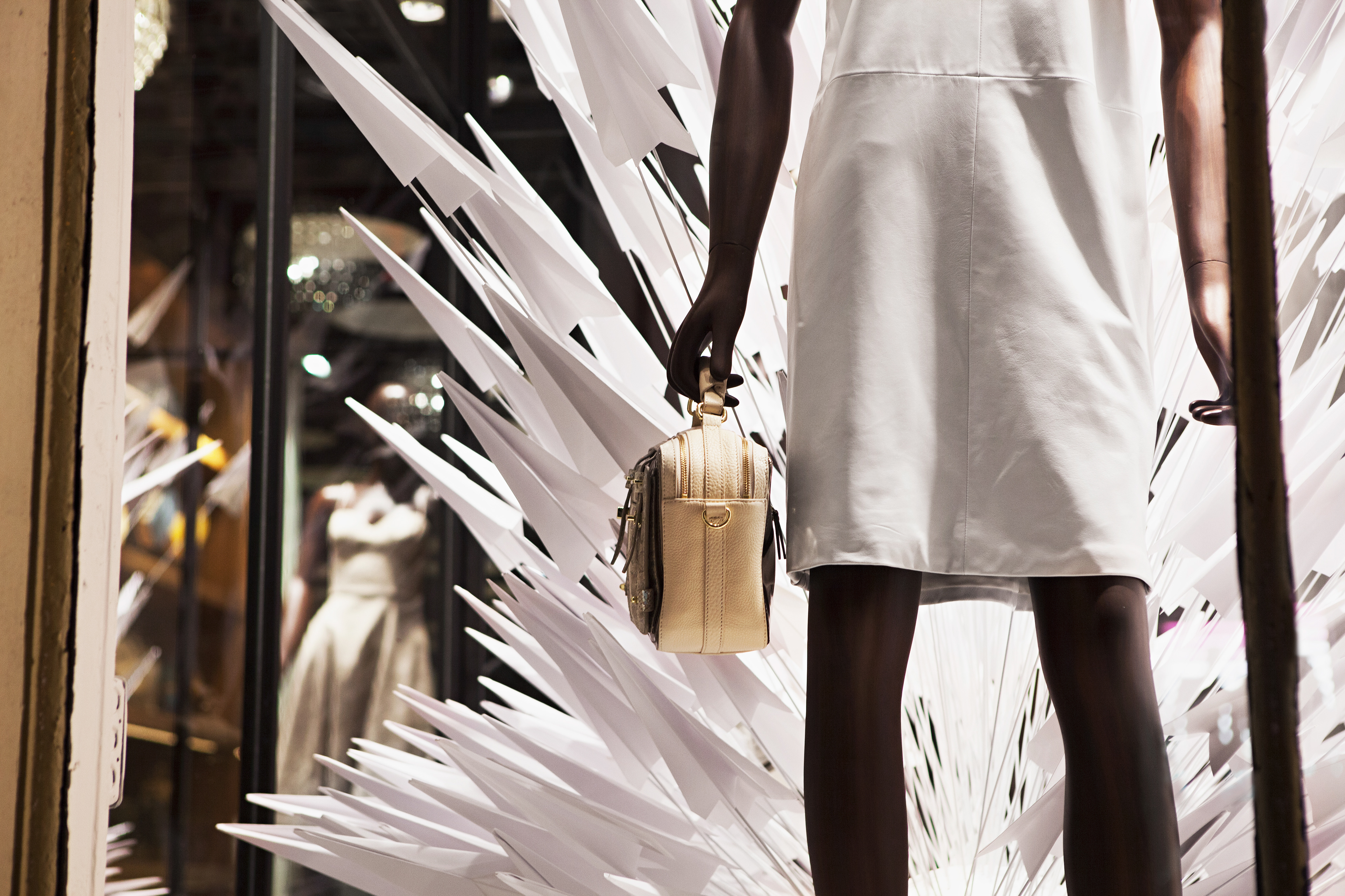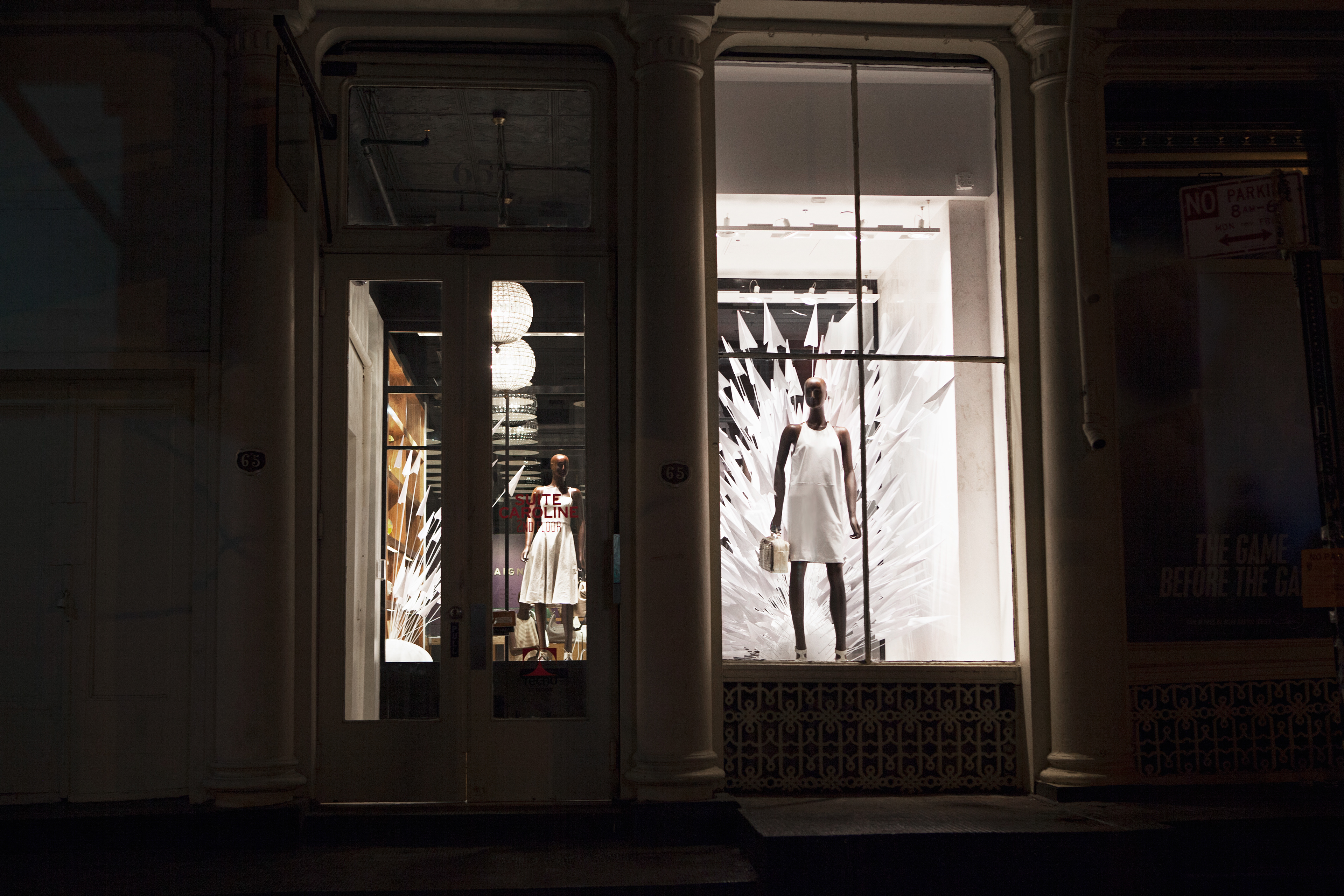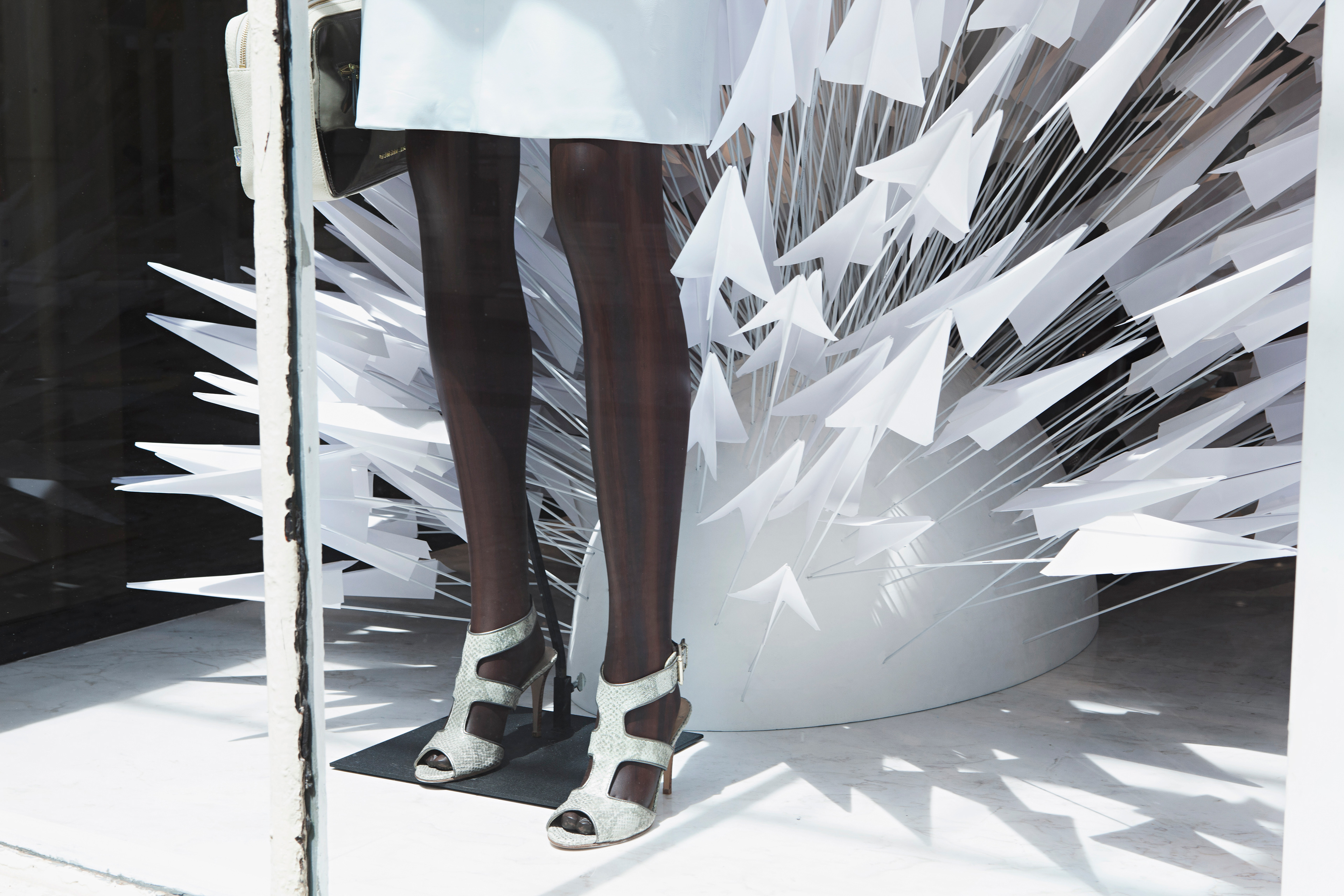A polar array of over 600 paper airplanes within a storefront window display for the fashion brand Etienne Aigner in Soho, NYC.