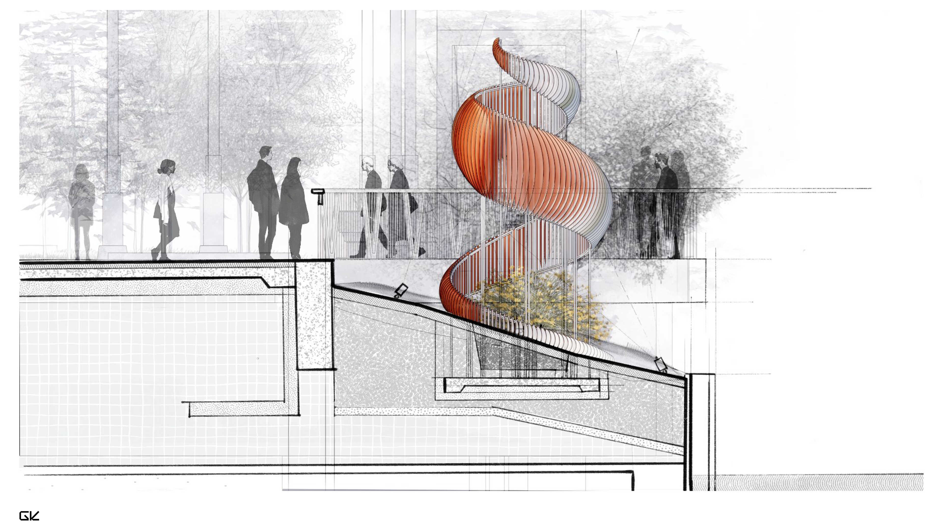 The form was shaped through a deep iterative process: sculptural studies, environmental modeling, and careful analysis of site lines, movement, and material performance. Every detail—from the taper of the spiral to the moiré effect between vertical fins—was calibrated for presence, transparency, and transformation. The design team worked fluidly across conceptual and technical realms, allowing engineering constraints and artistic intuition to inform one another in equal measure. The result is a form that feels inevitable in its setting, yet constantly surprising in its experience.