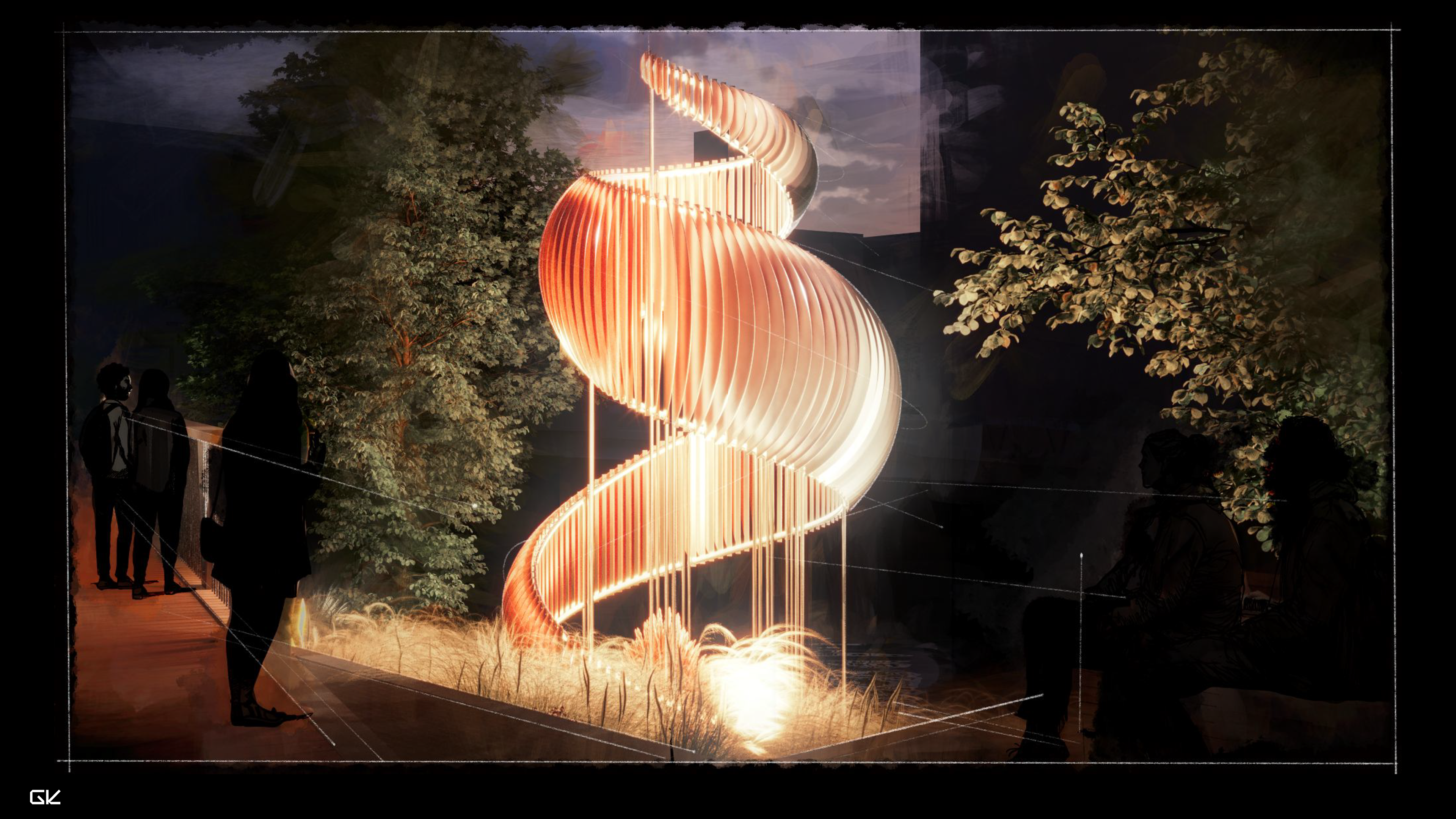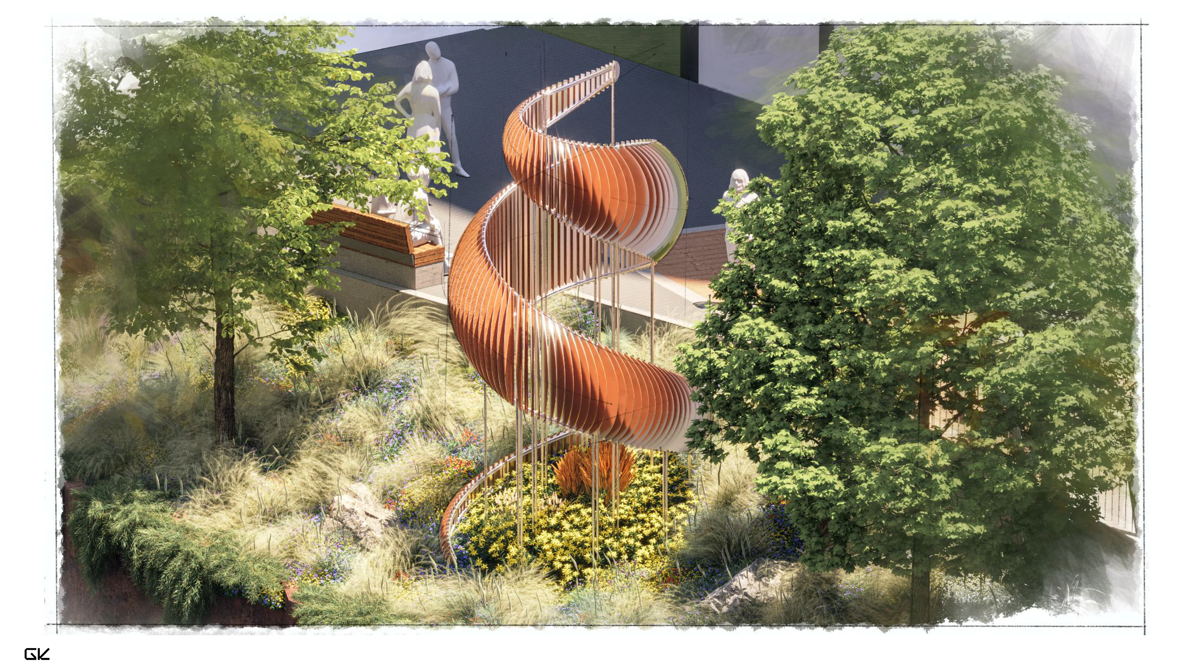 HORIZON is a site-specific architectural sculpture proposed for Nevins Landing, along the Gowanus Canal—a place defined by transformation, tension, and layered history. Rising in a sinuous spiral, the work emerges from the landscape like an unearthed industrial relic, creating a striking formal dialogue between the neighborhood’s gritty past and its evolving future. The piece is designed not as an object placed within a space, but as a material gesture born from it—connecting community, context, and change through a single expressive form. With alternating finishes of weathered steel and mirror-polished chrome, the sculpture captures the literal and symbolic reflections of Gowanus as it grows and redefines itself.