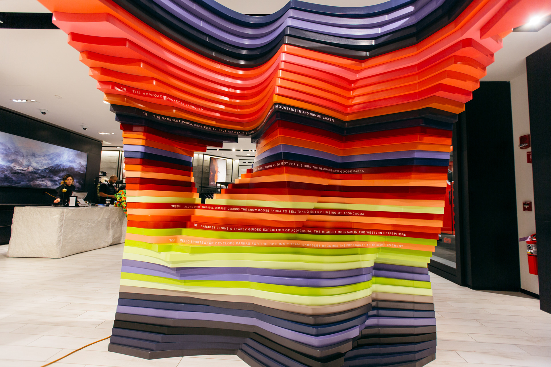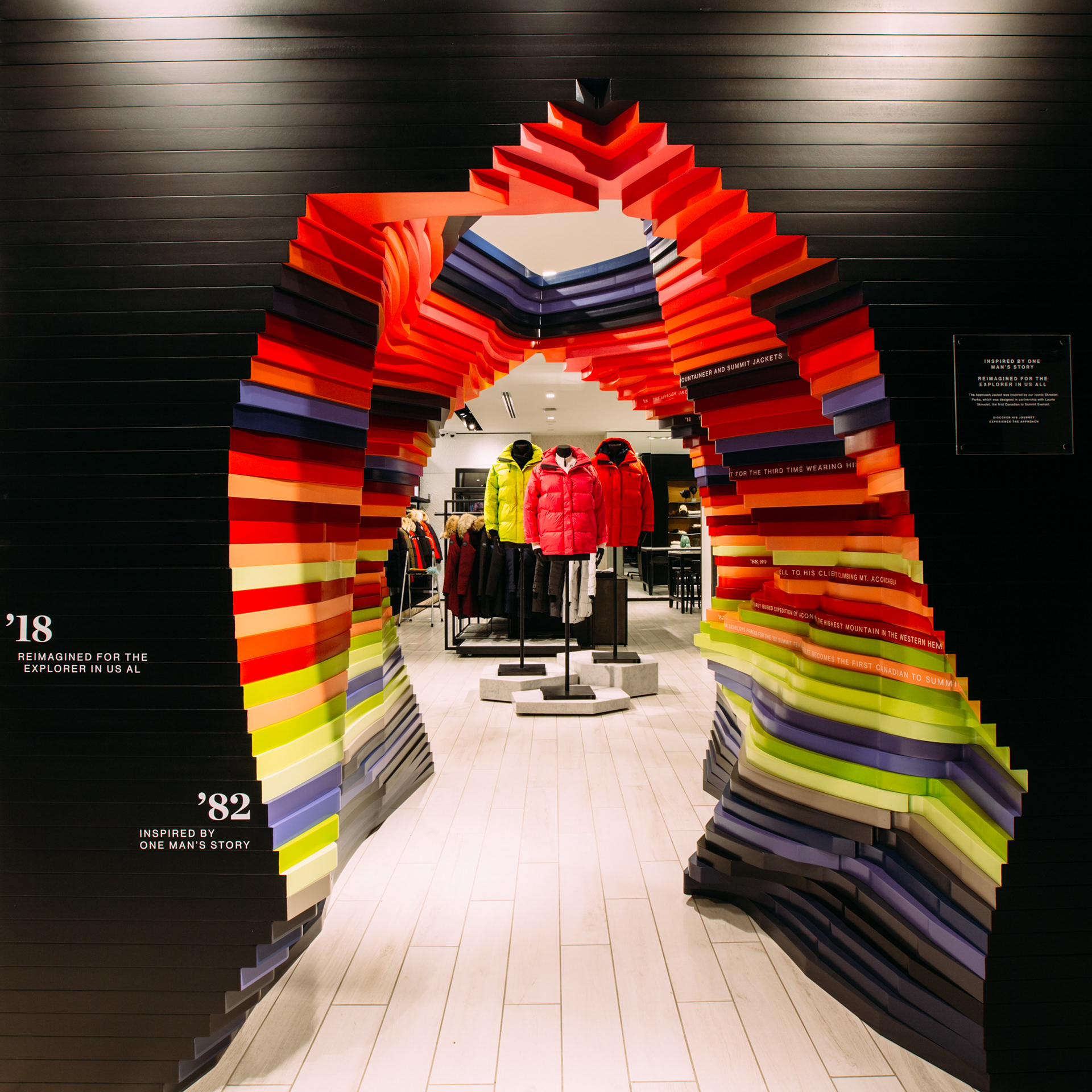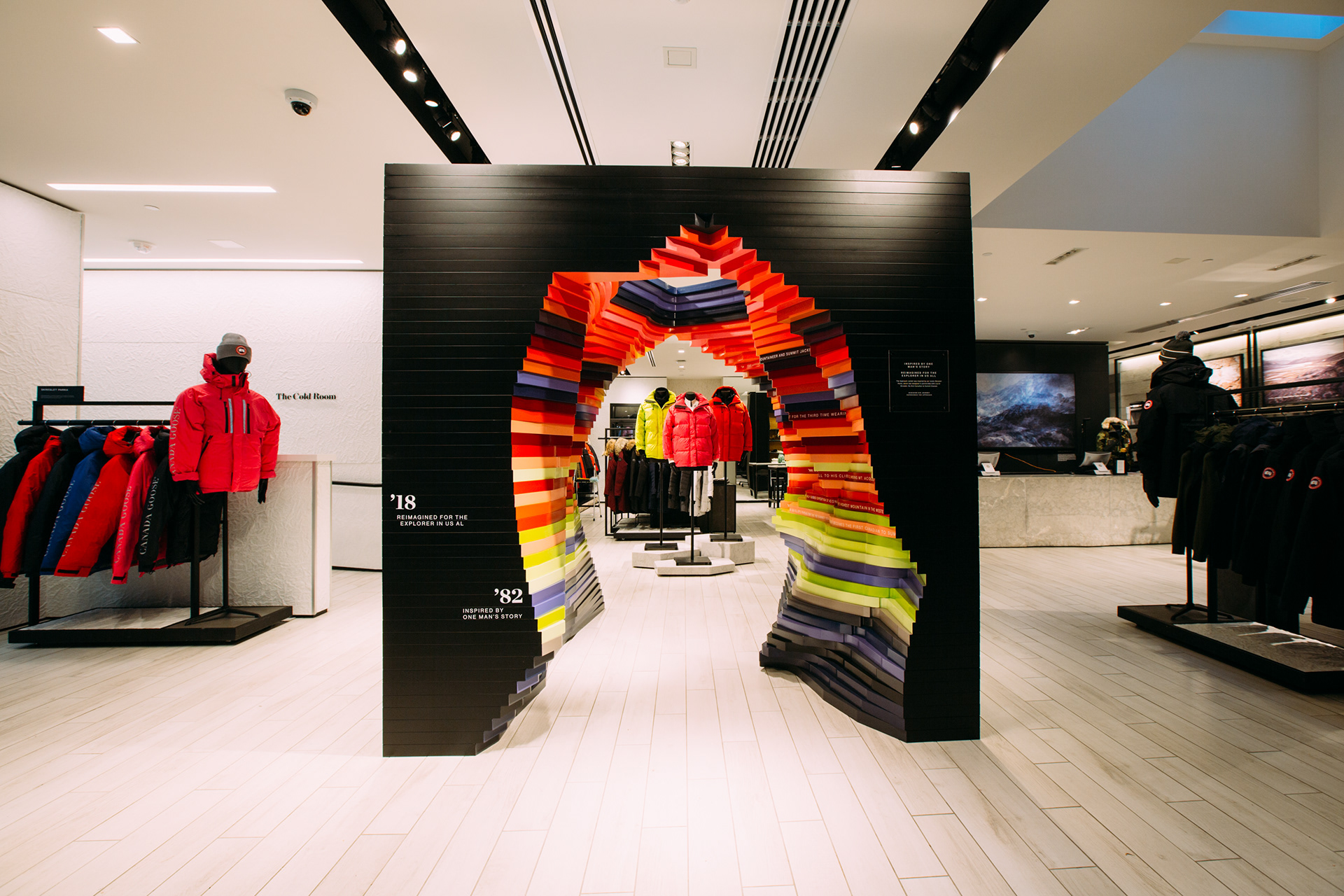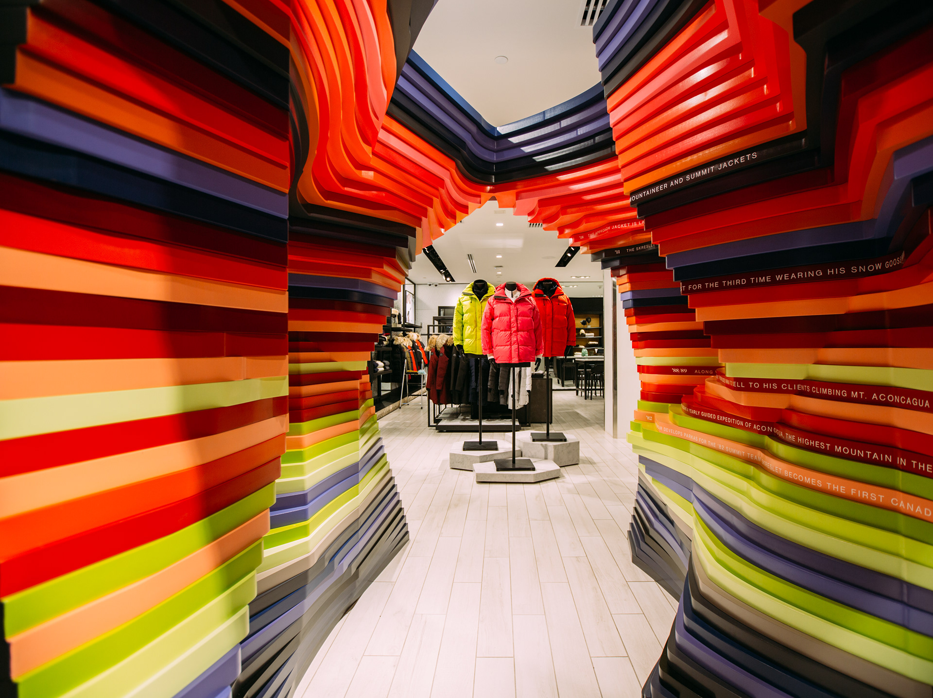 A psychedelic architectural gateway inspired by the abstracted form of an ice cave. The project was designed and built for Canada Goose stores in Toronto and Boston. The installation was conceived as an organic form subtracted from a black cubic volume to create a path into the store. The installation is composed of stacked layers of painted 2-inch thick high-density foam. The colorful strata correspond to the colorways of a new line of jackets for the "Approach" campaign. The layers integrate messaging to tell the story of the history of Canada Goose.