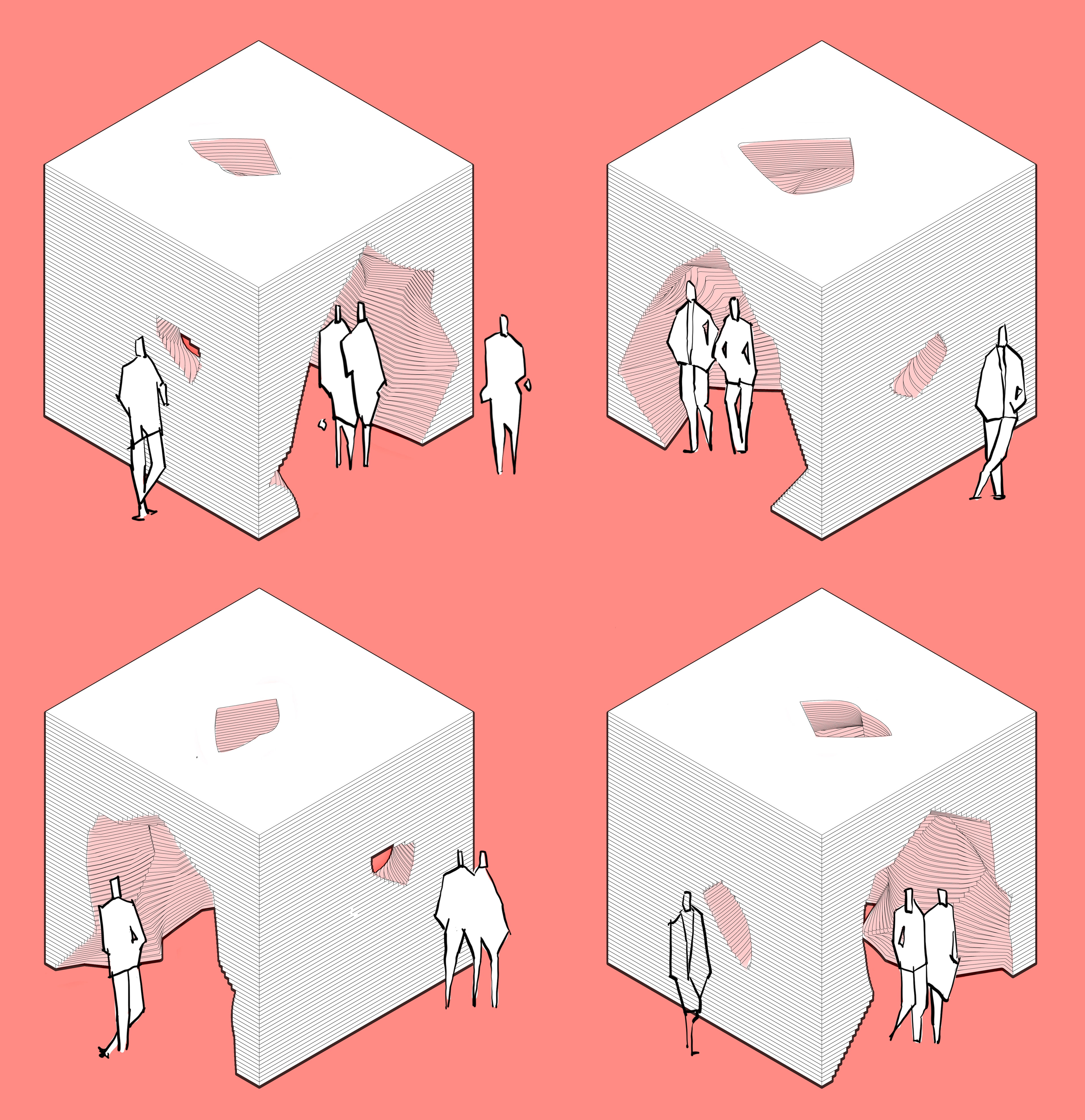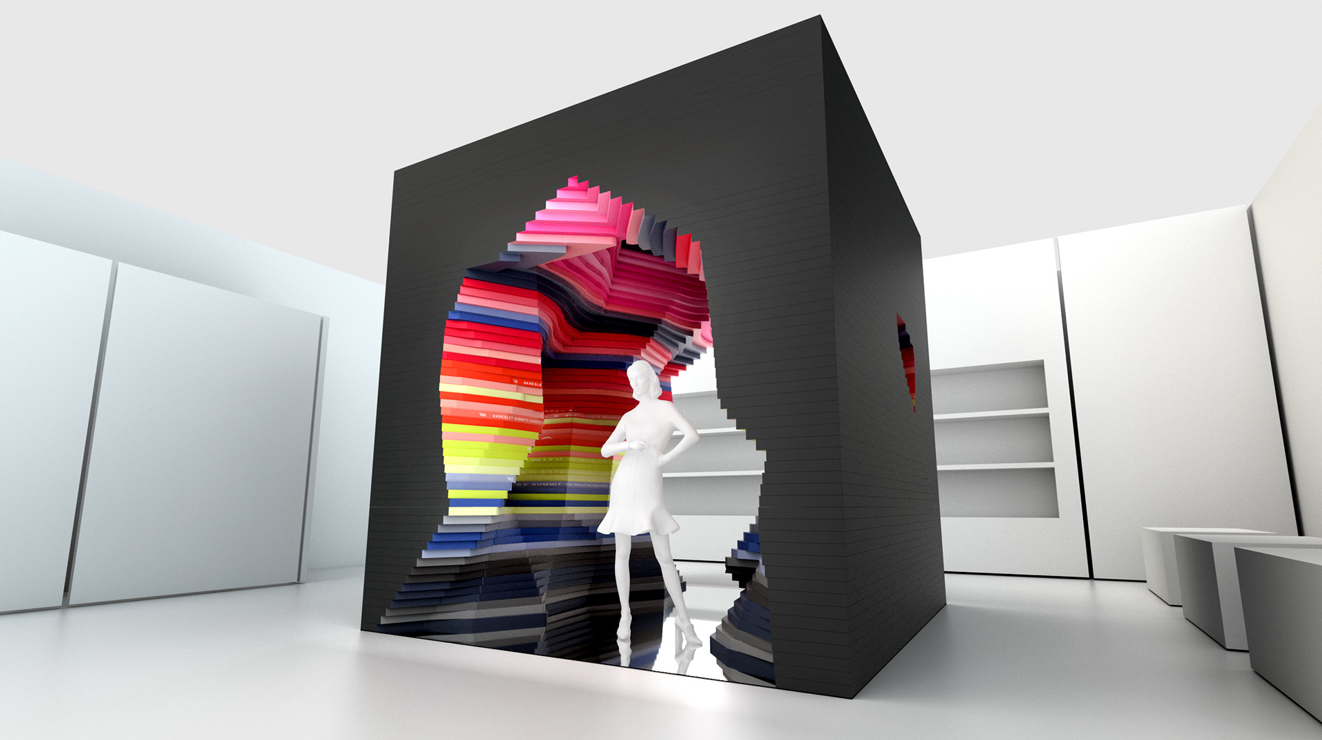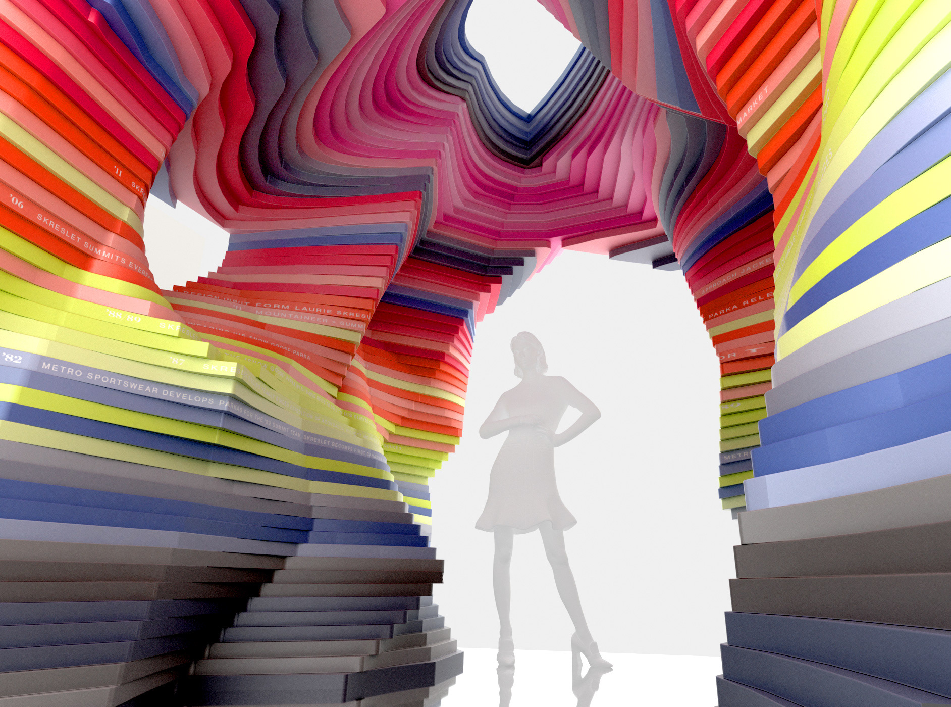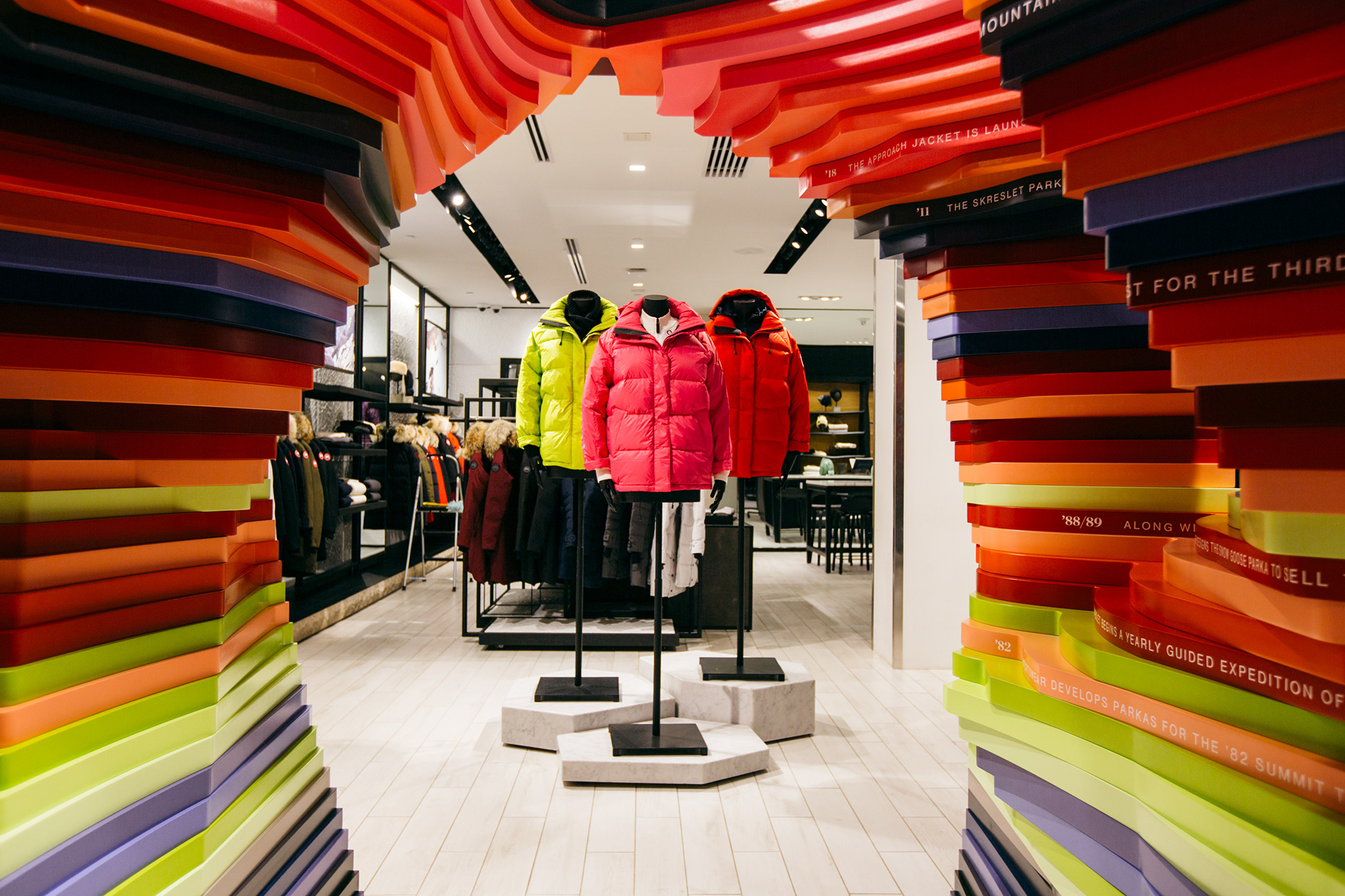 A psychedelic architectural gateway inspired by the abstracted form of an ice cave. The project was designed and built for Canada Goose stores in Toronto and Boston. The installation was conceived as an organic form subtracted from a black cubic volume to create a path into the store. The installation is composed of stacked layers of painted 2-inch thick high-density foam. The colorful strata correspond to the colorways of a new line of jackets for the "Approach" campaign. The layers integrate messaging to tell the story of the history of Canada Goose.
