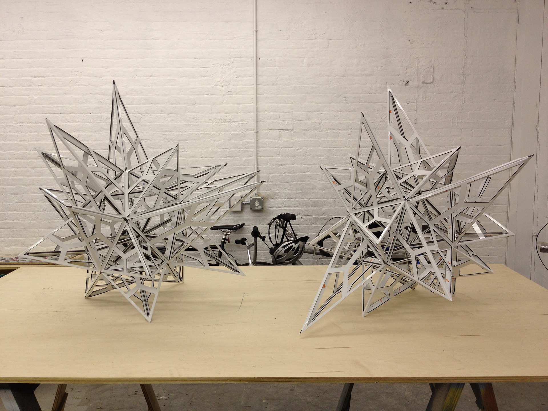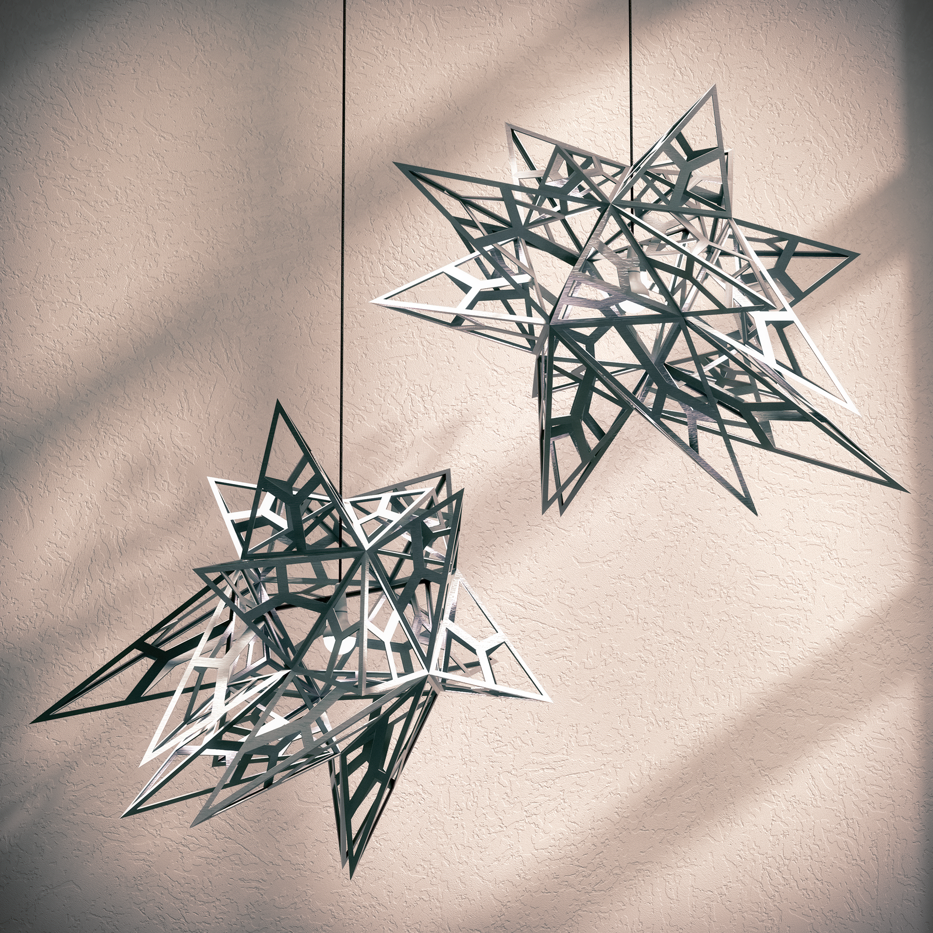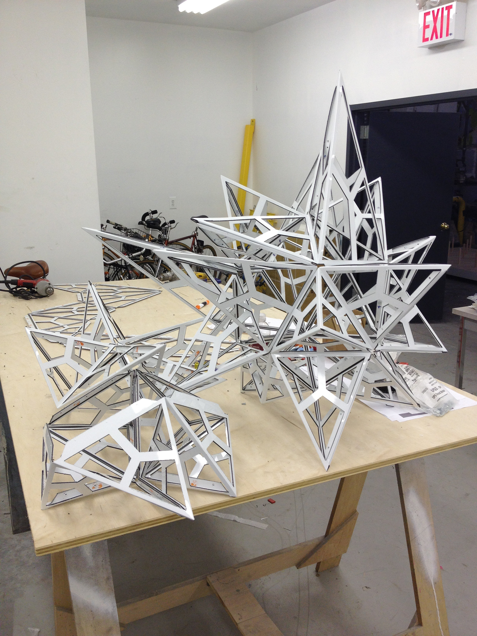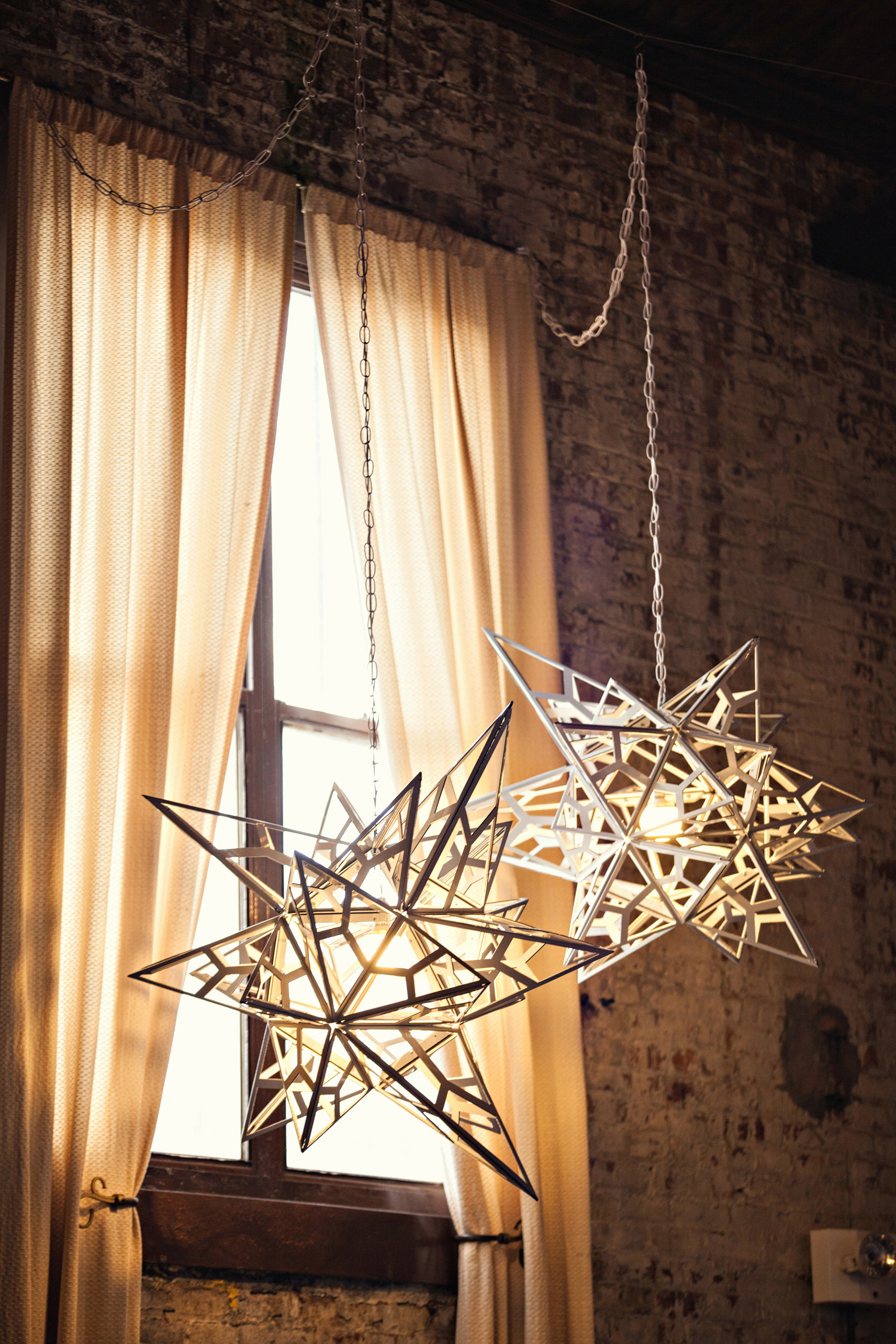 Componentized hanging chandeliers, made from folded CNC'd white aluminum, white rivets, chain, and incandescent source.