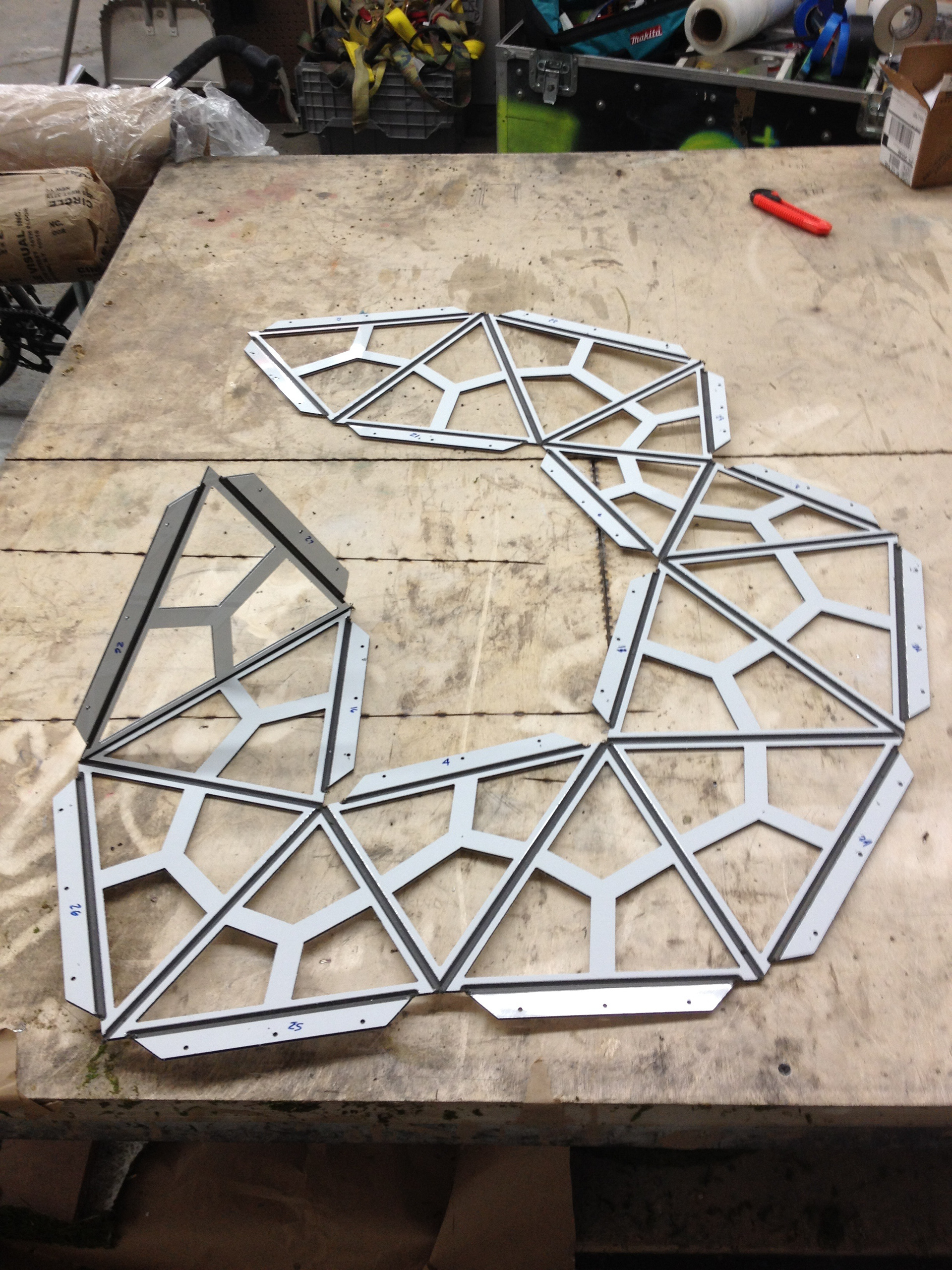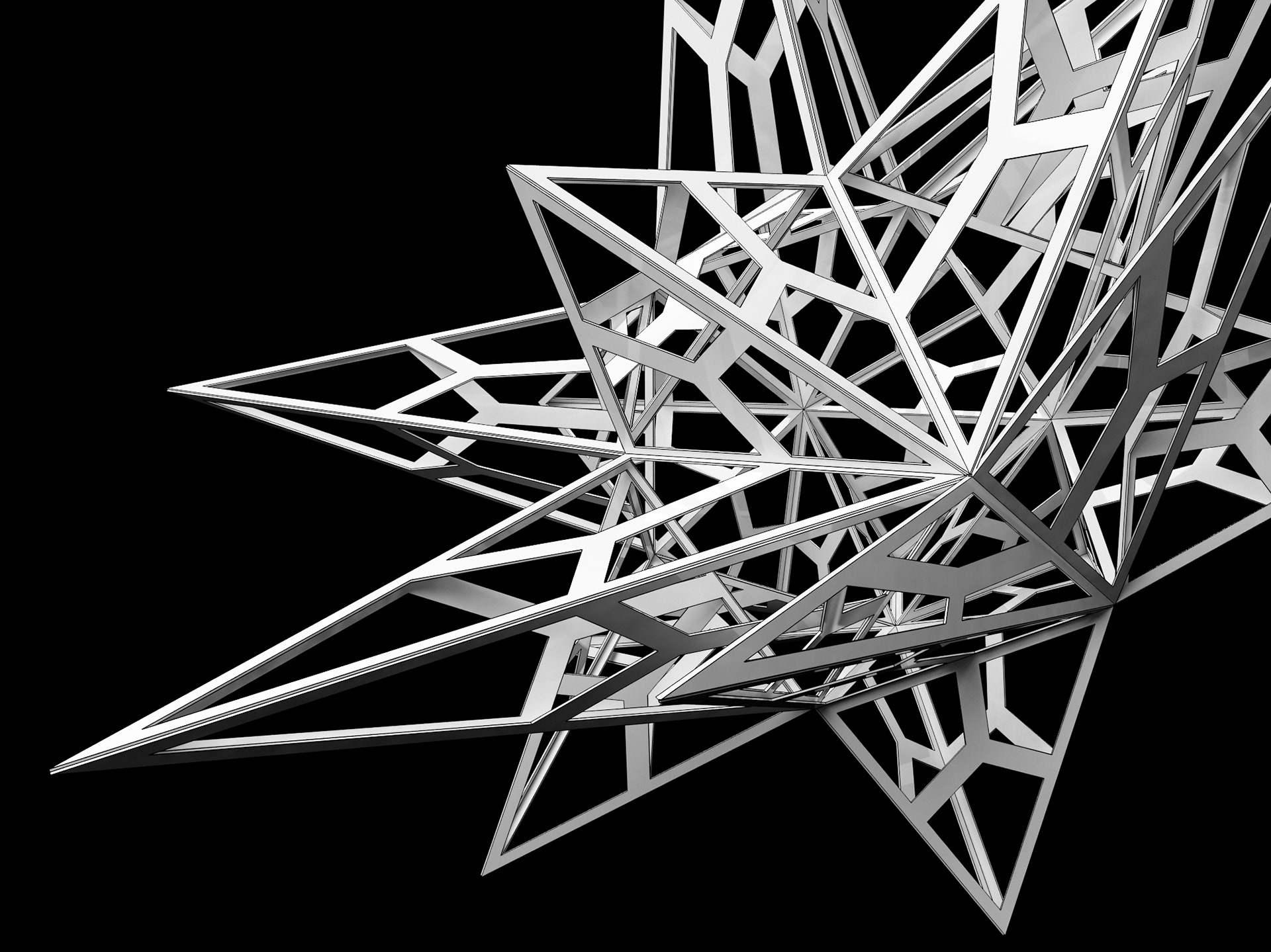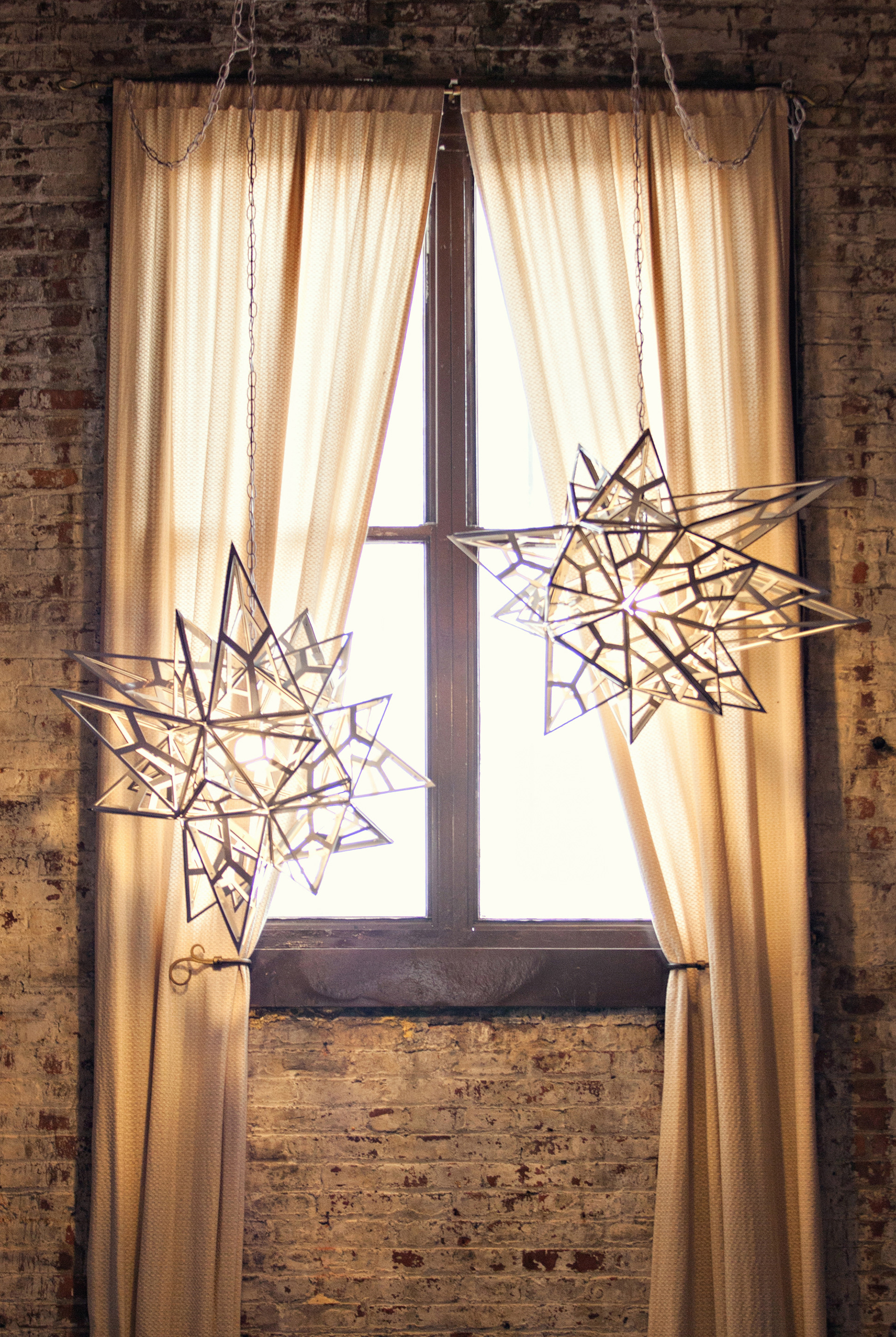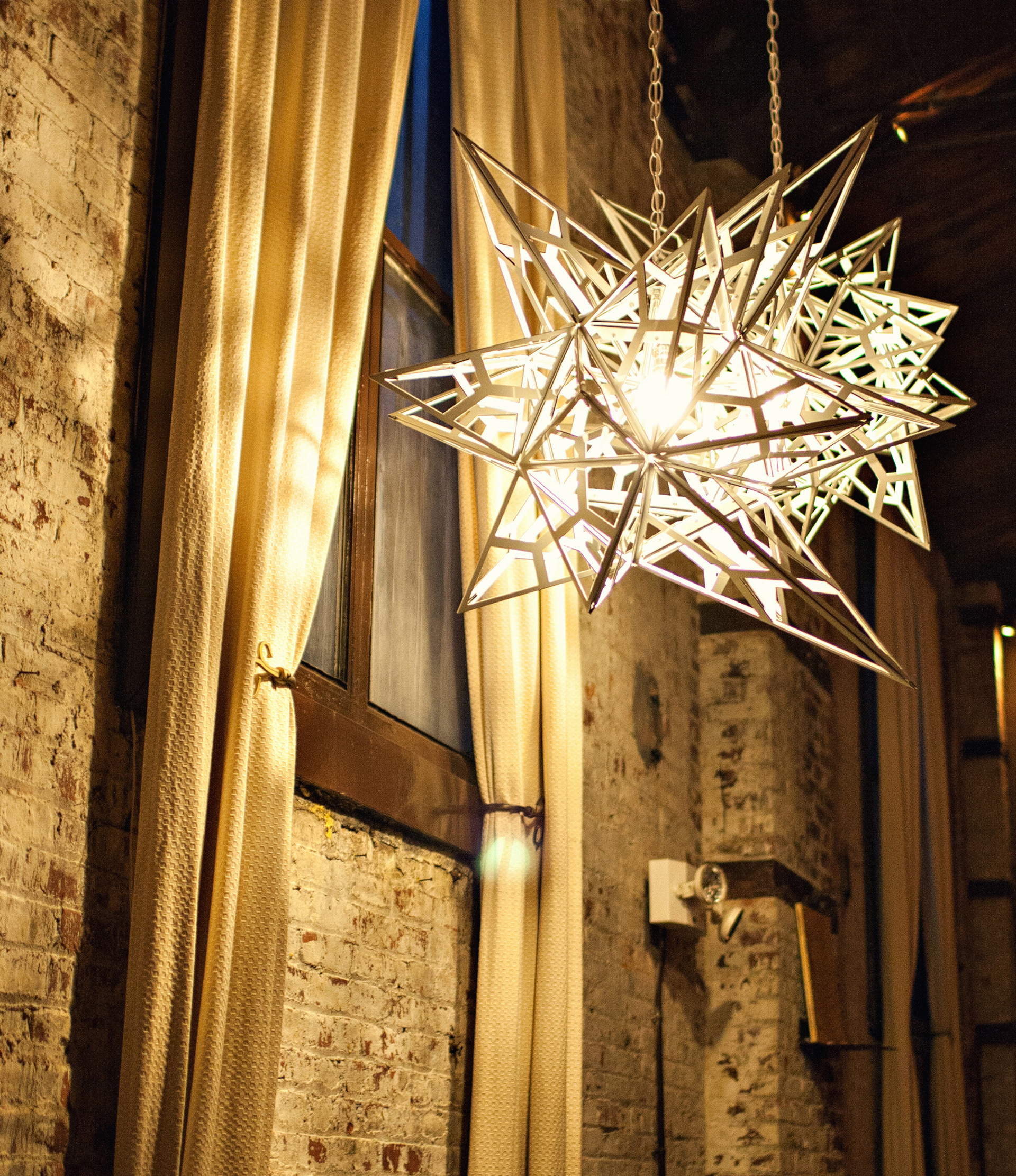 Componentized hanging chandeliers, made from folded CNC'd white aluminum, white rivets, chain, and incandescent source.