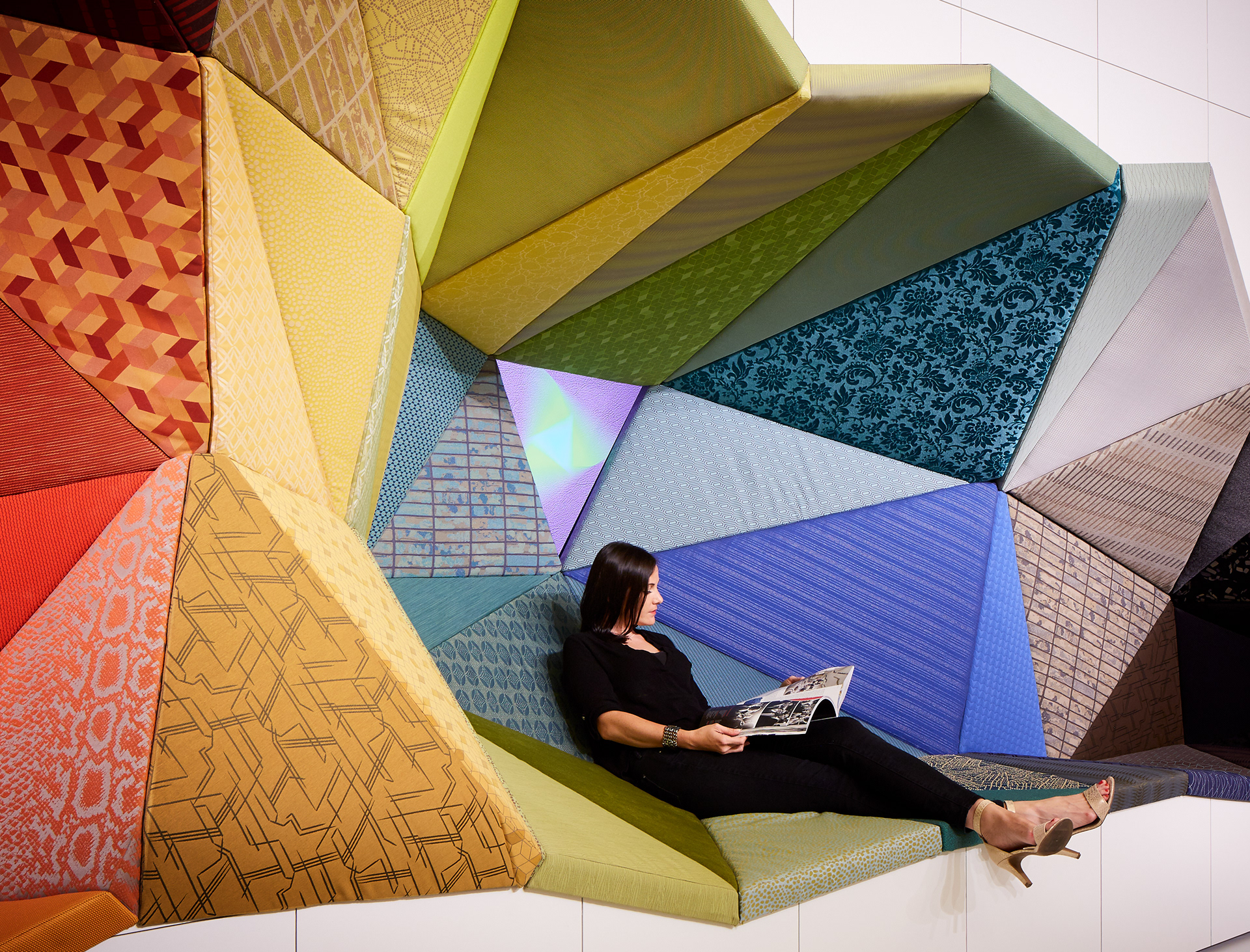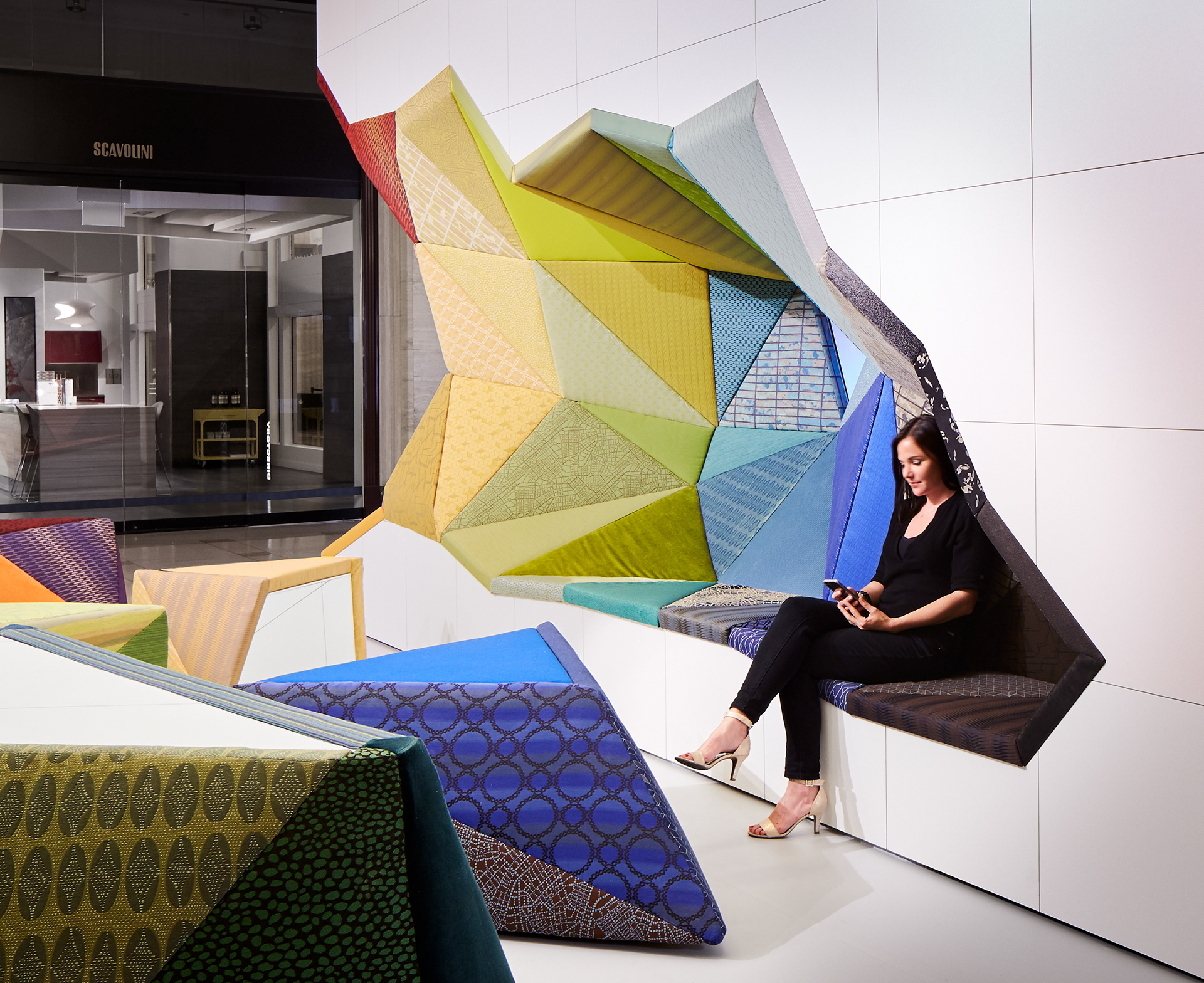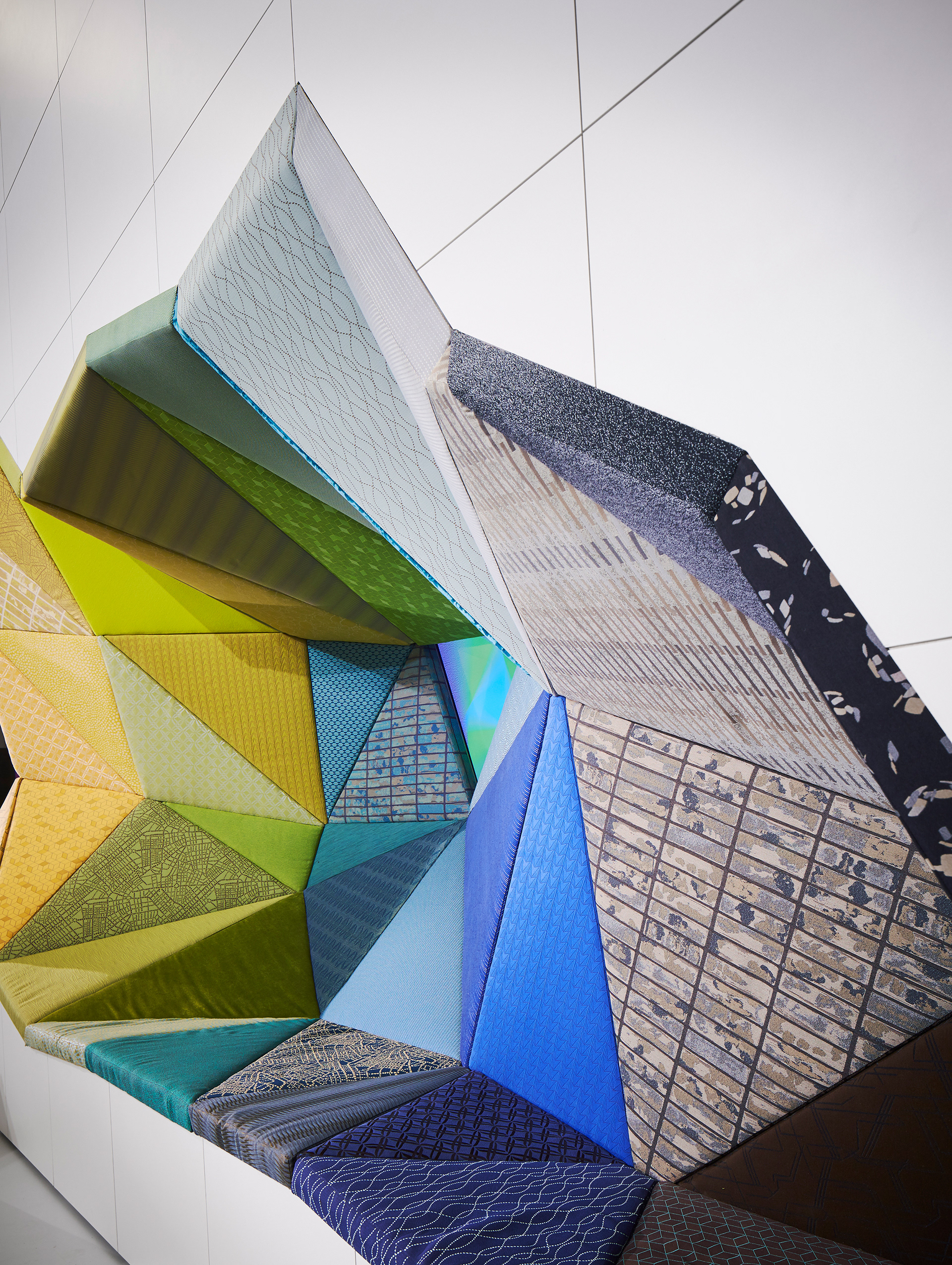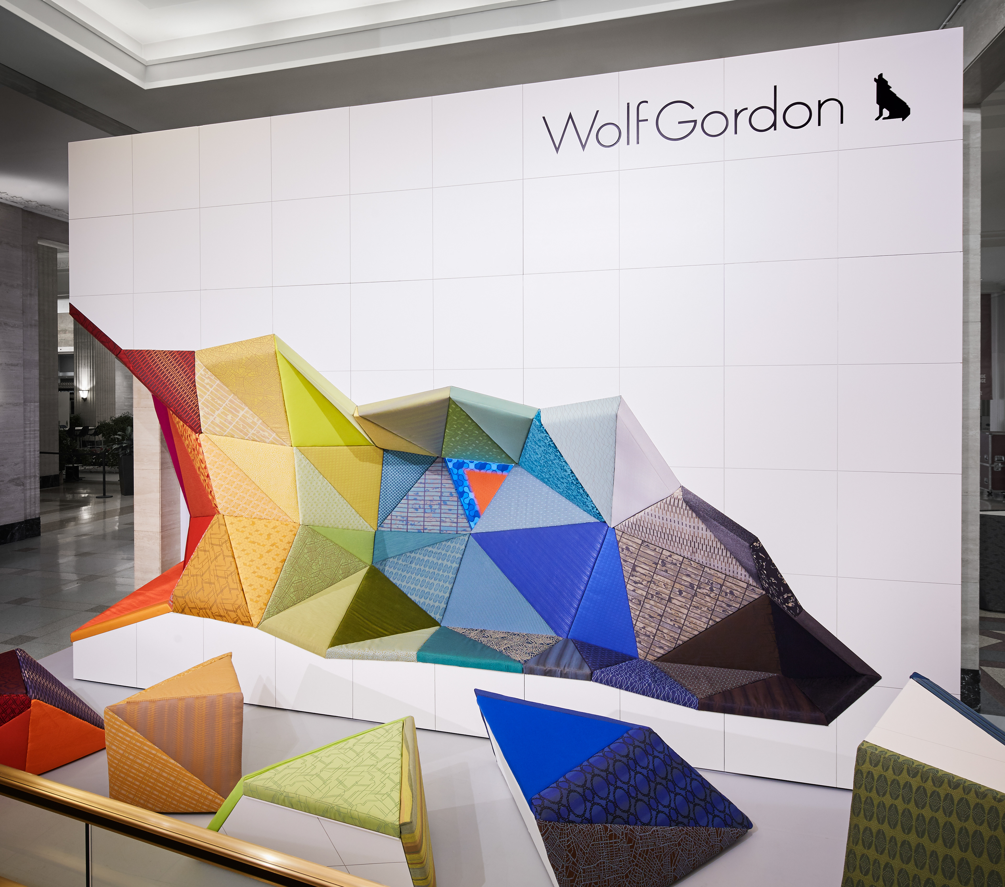 The area will feature an 18 foot long, grotto-like banquette created by extracting asymmetrical forms from the “block”. The residual forms can be positioned as desktops, tables, and stools. Both the excavated seating and forms are upholstered in over 100 Wolf-Gordon textiles arrayed by color. Designed to accommodate a range of workplace functions, Office_Excavate will provide a welcoming space to stop for a chat, coffee break, email check, phone recharge or a serendipitous meeting.