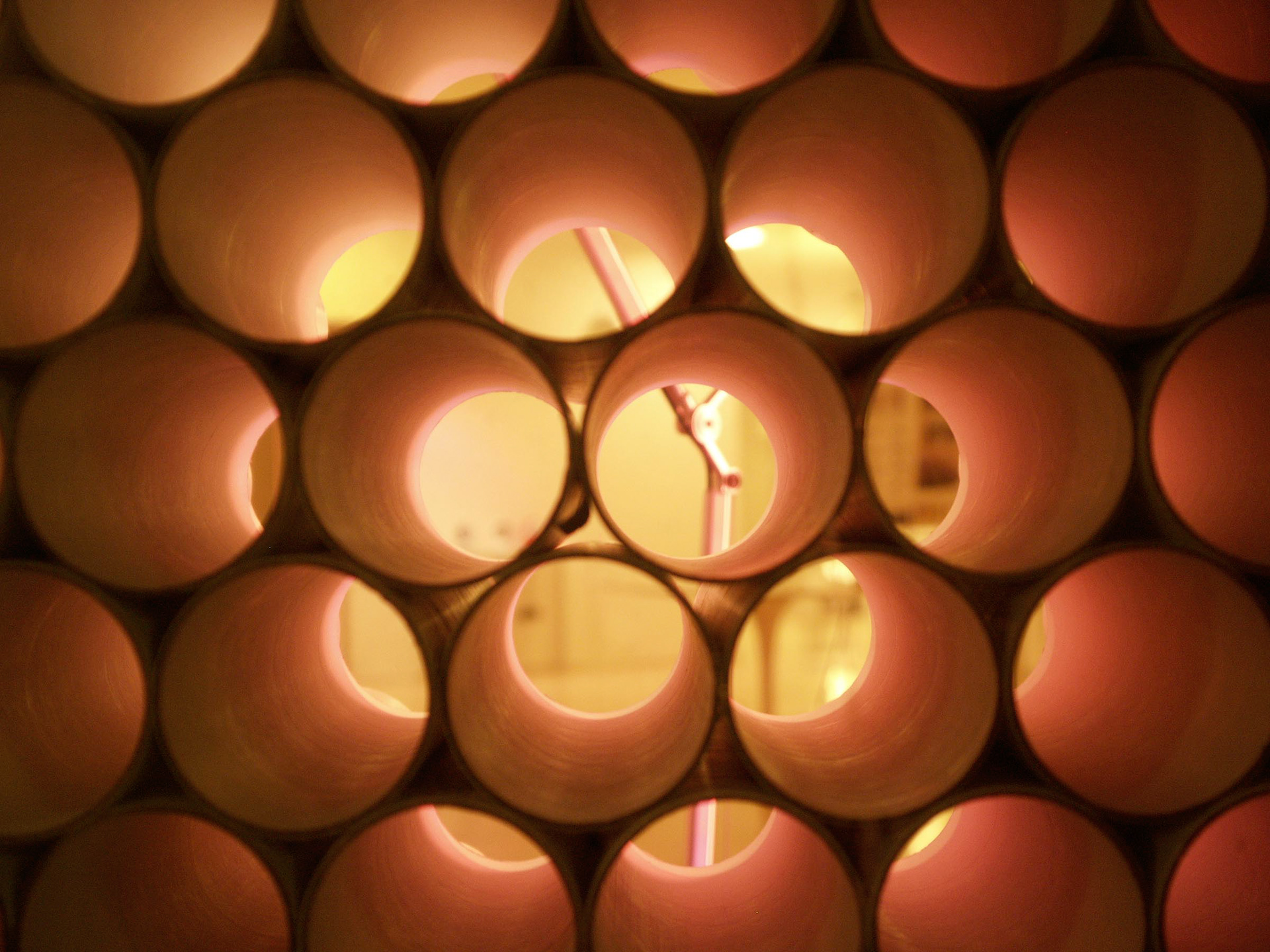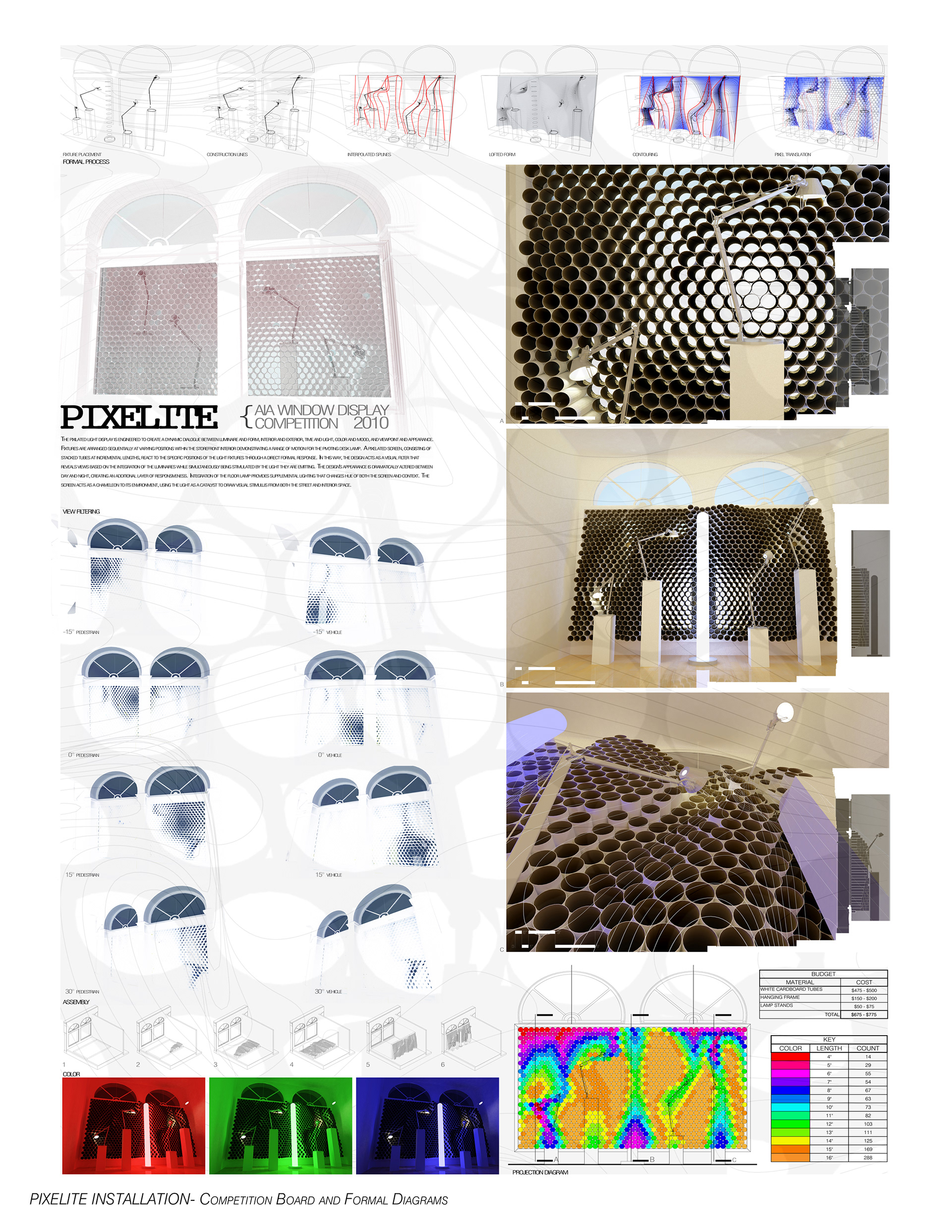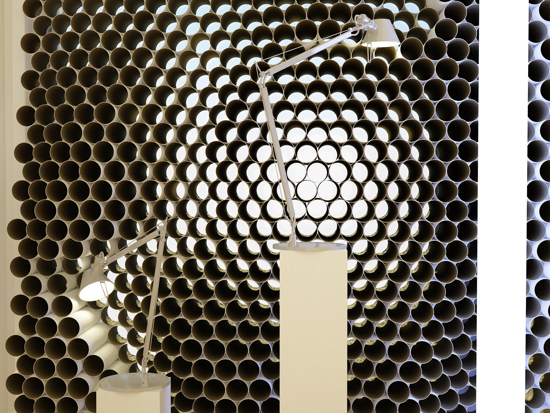 An installation within the Philadelphia Artemide lighting showroom that conforms to the design of the Tolemeo classic lamp, converting light into a pixelated screen.