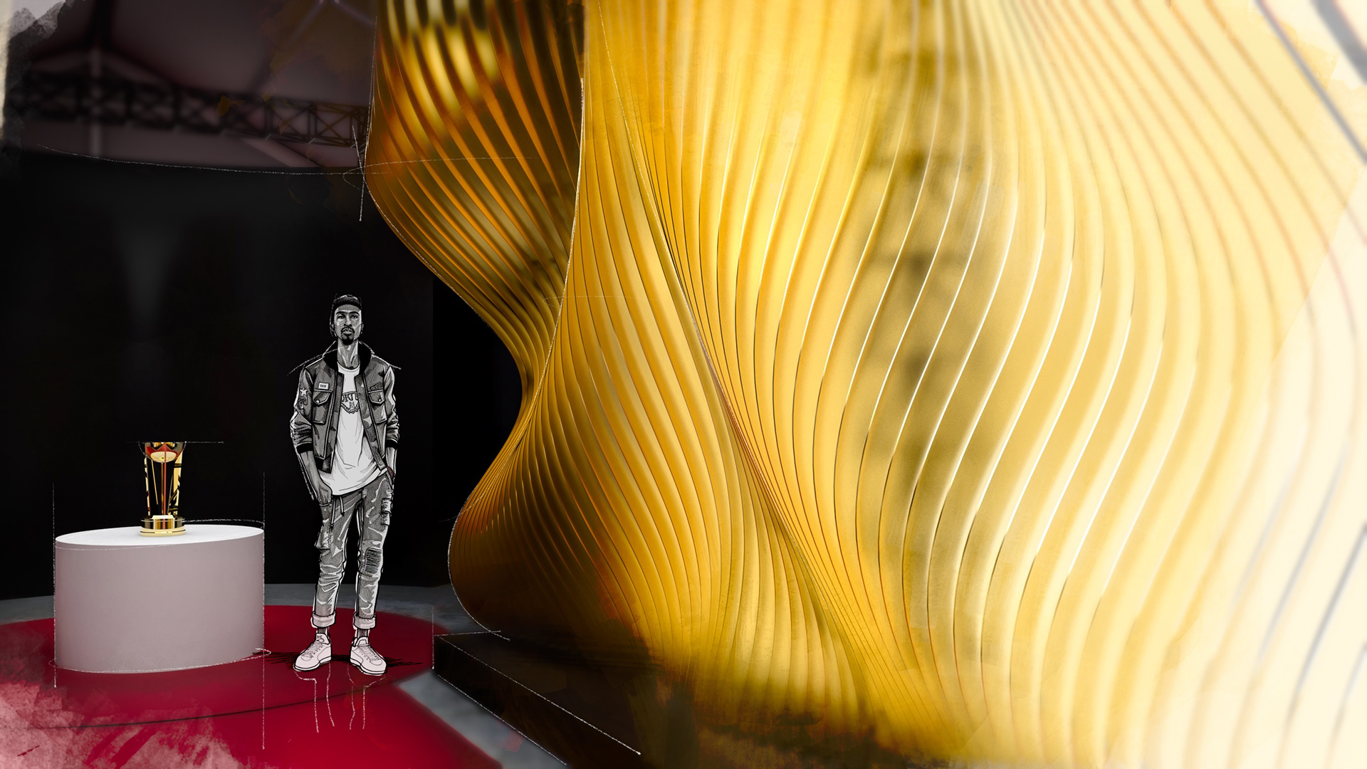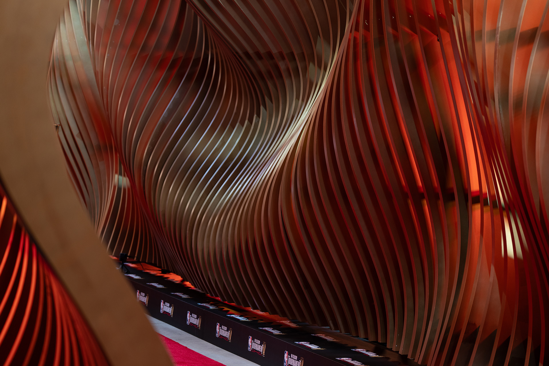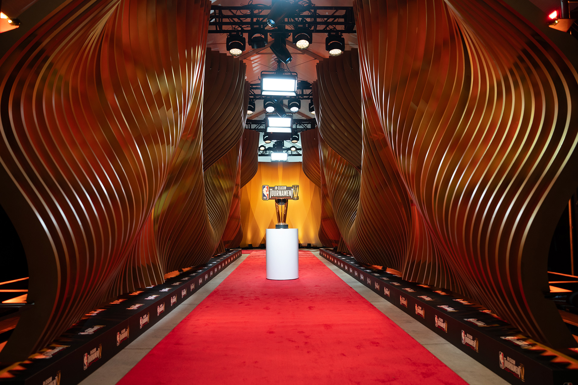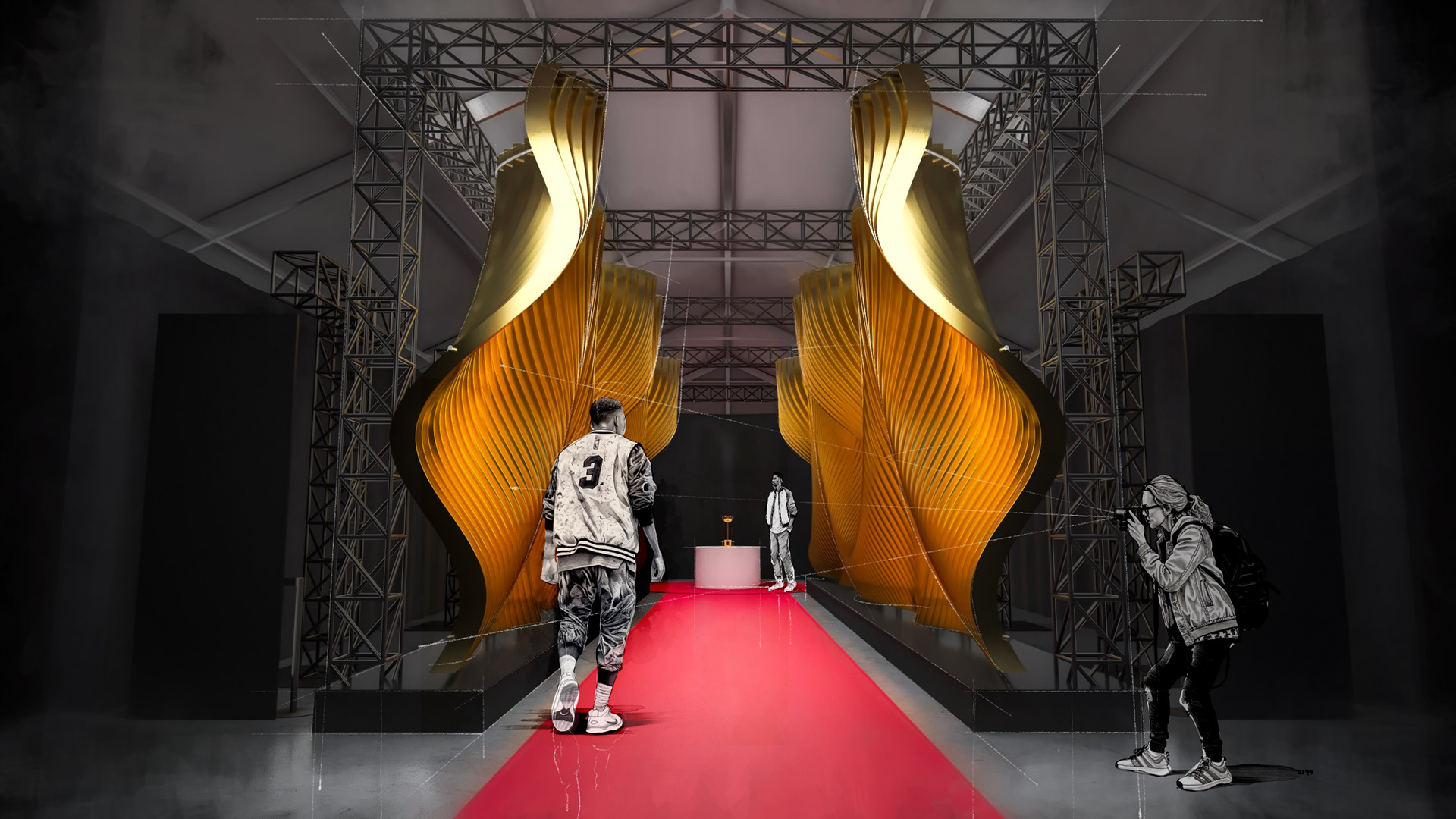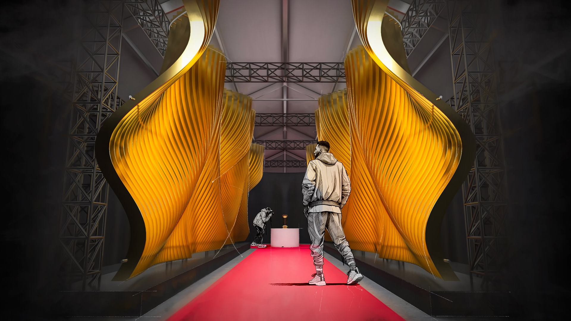 Akin to the swoosh of a net during a perfect shot, our installation captures the grace and dynamism of the sport. The powerful impact of a basketball, a singular moment of intensity, is translated into a tangible, structural force that resonates throughout the installation. This force creates a ripple effect, an undulating cascade of energy, which emanates from the trophy at the heart of the runway and leaves an indelible mark on its form, shaping an unparalleled runway experience that seamlessly merges the worlds of sports and fashion.
