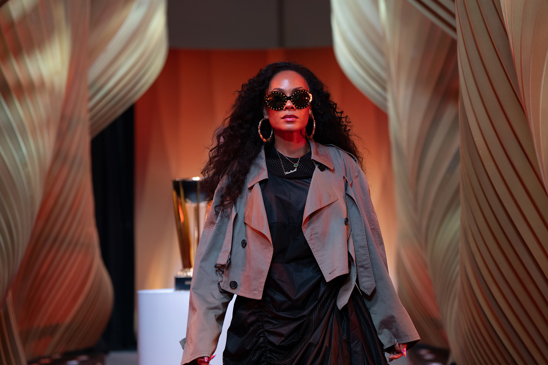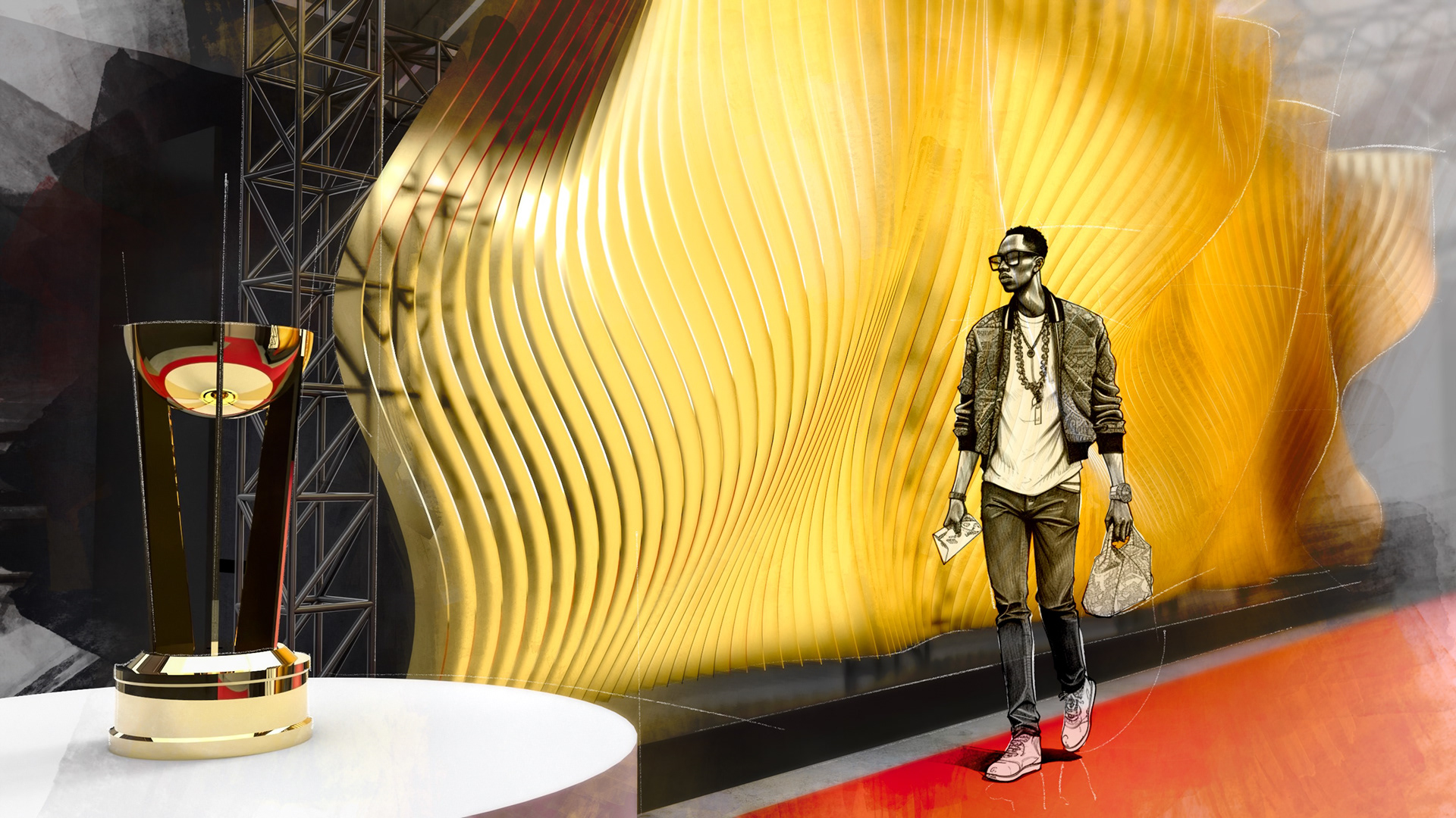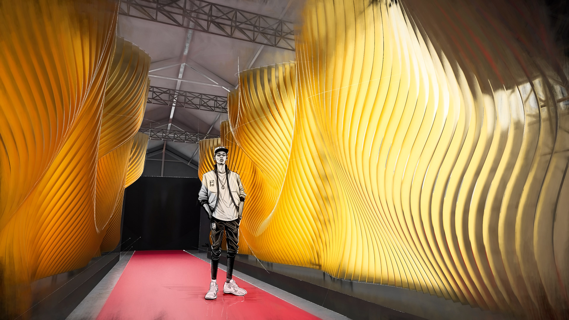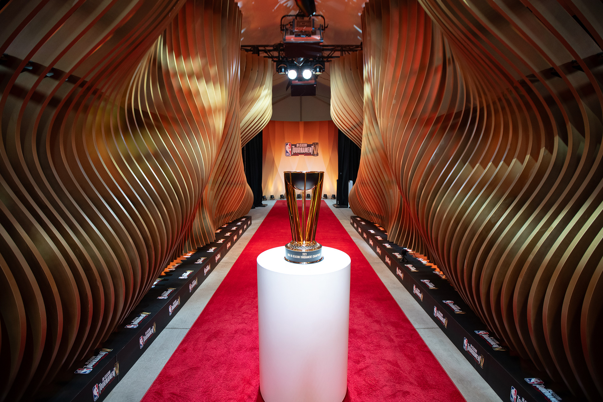 Akin to the swoosh of a net during a perfect shot, our installation captures the grace and dynamism of the sport. The powerful impact of a basketball, a singular moment of intensity, is translated into a tangible, structural force that resonates throughout the installation. This force creates a ripple effect, an undulating cascade of energy, which emanates from the trophy at the heart of the runway and leaves an indelible mark on its form, shaping an unparalleled runway experience that seamlessly merges the worlds of sports and fashion.