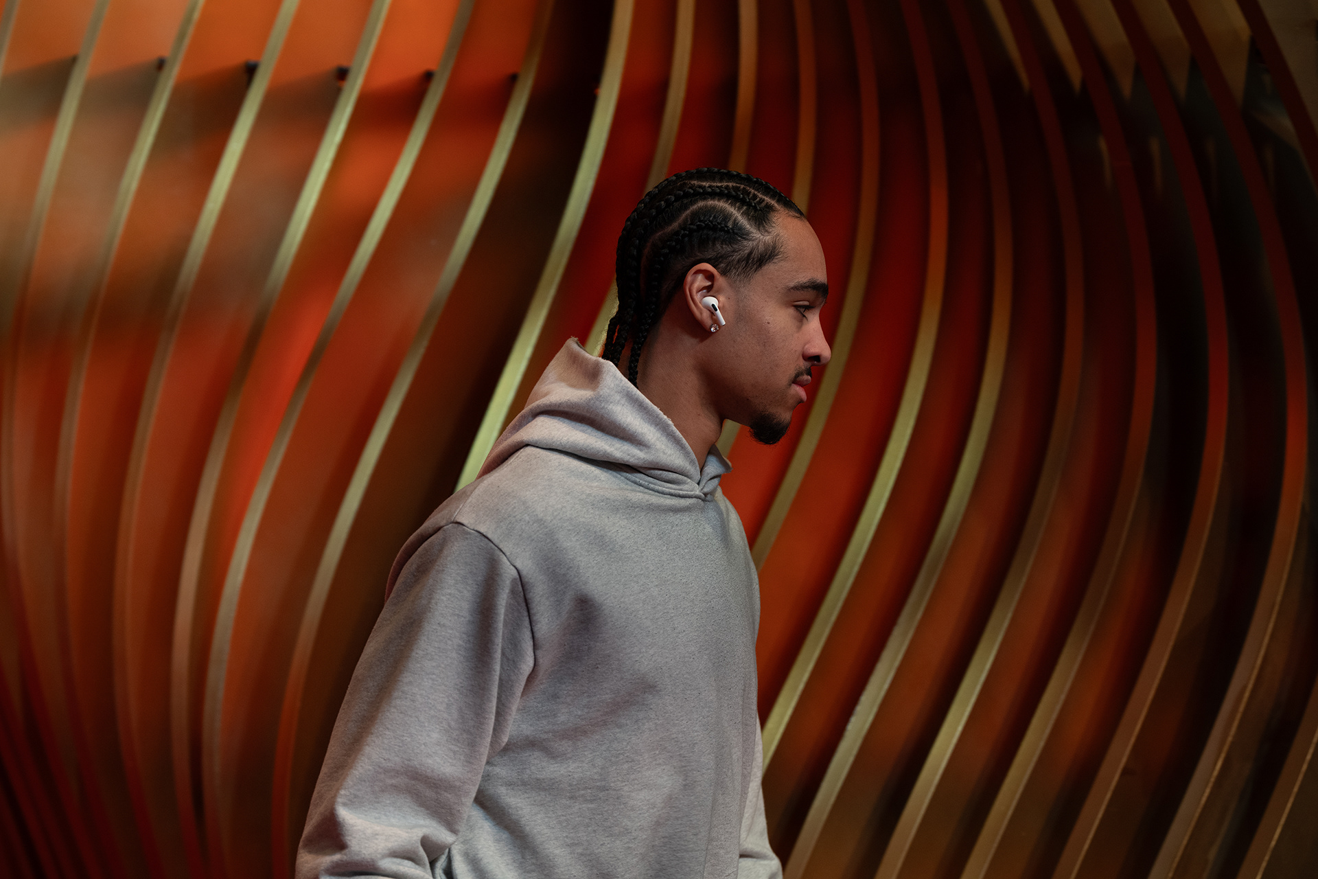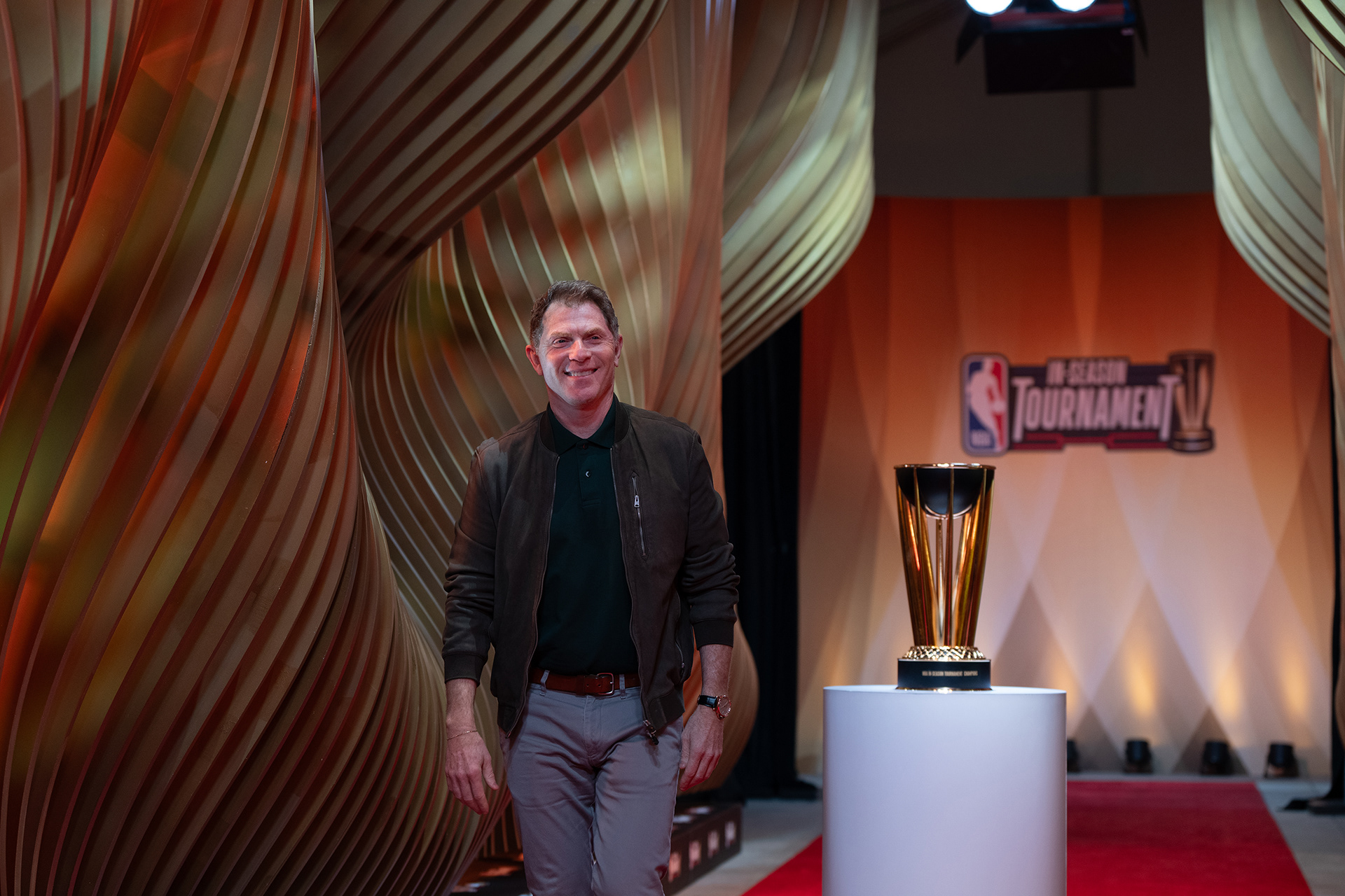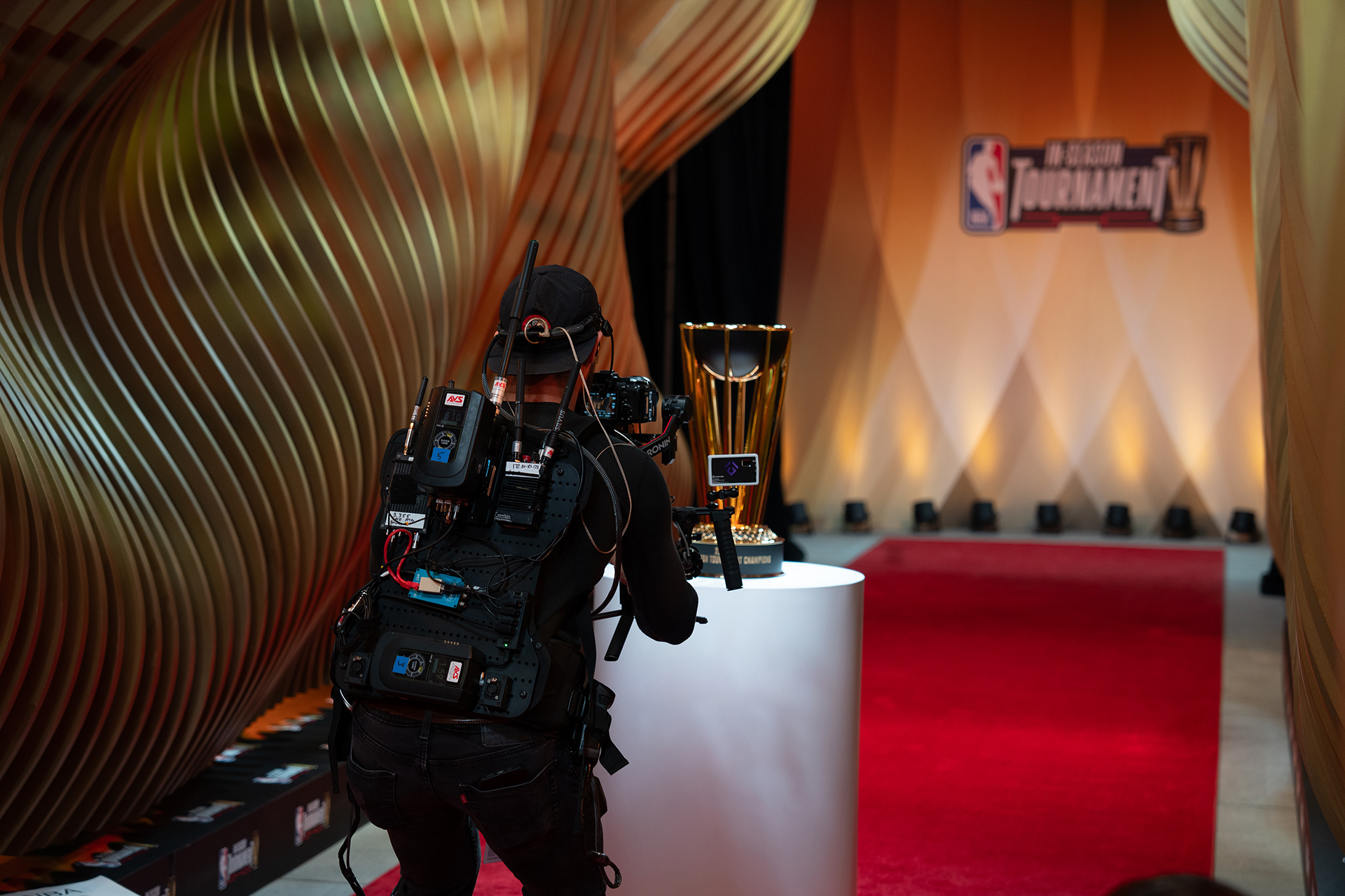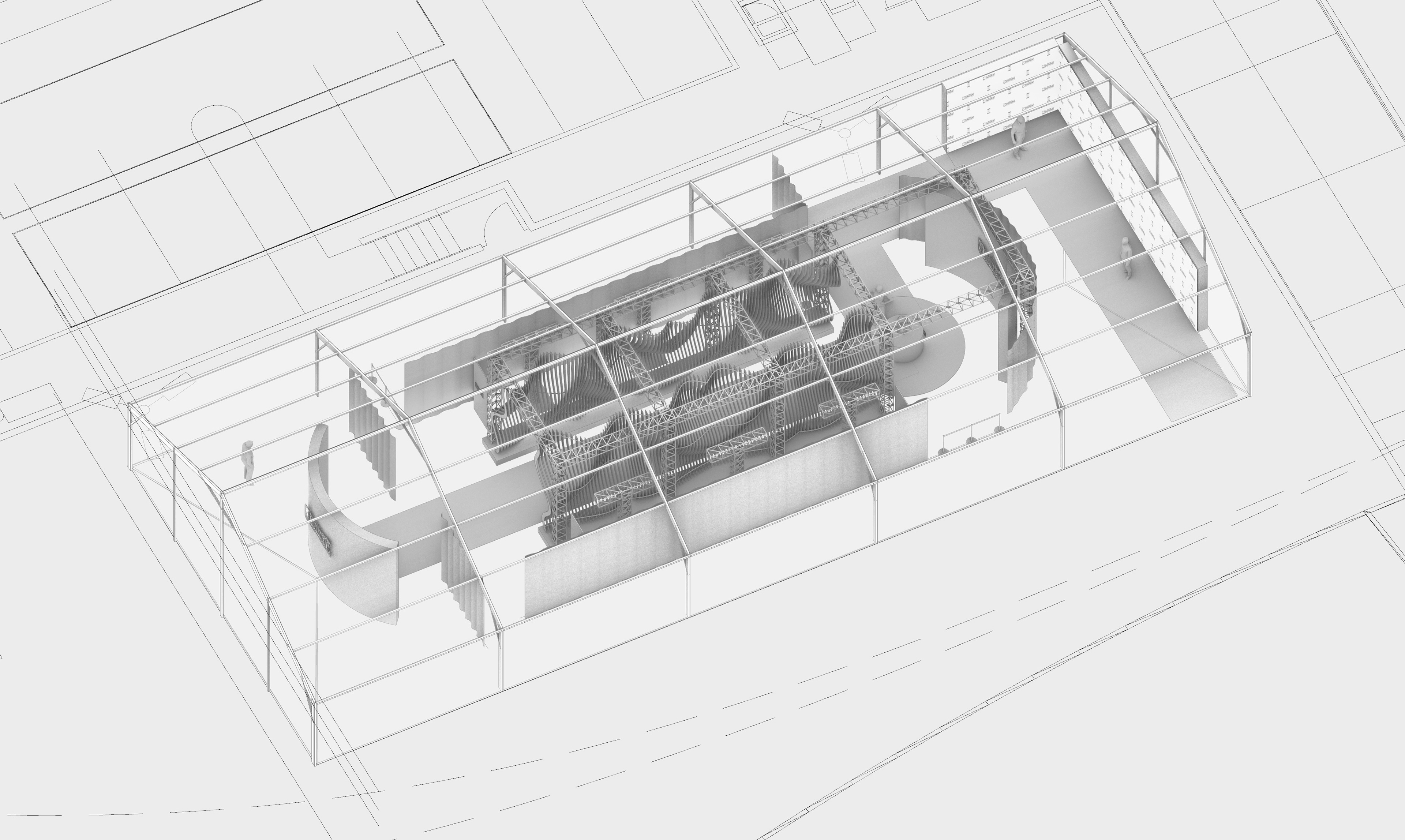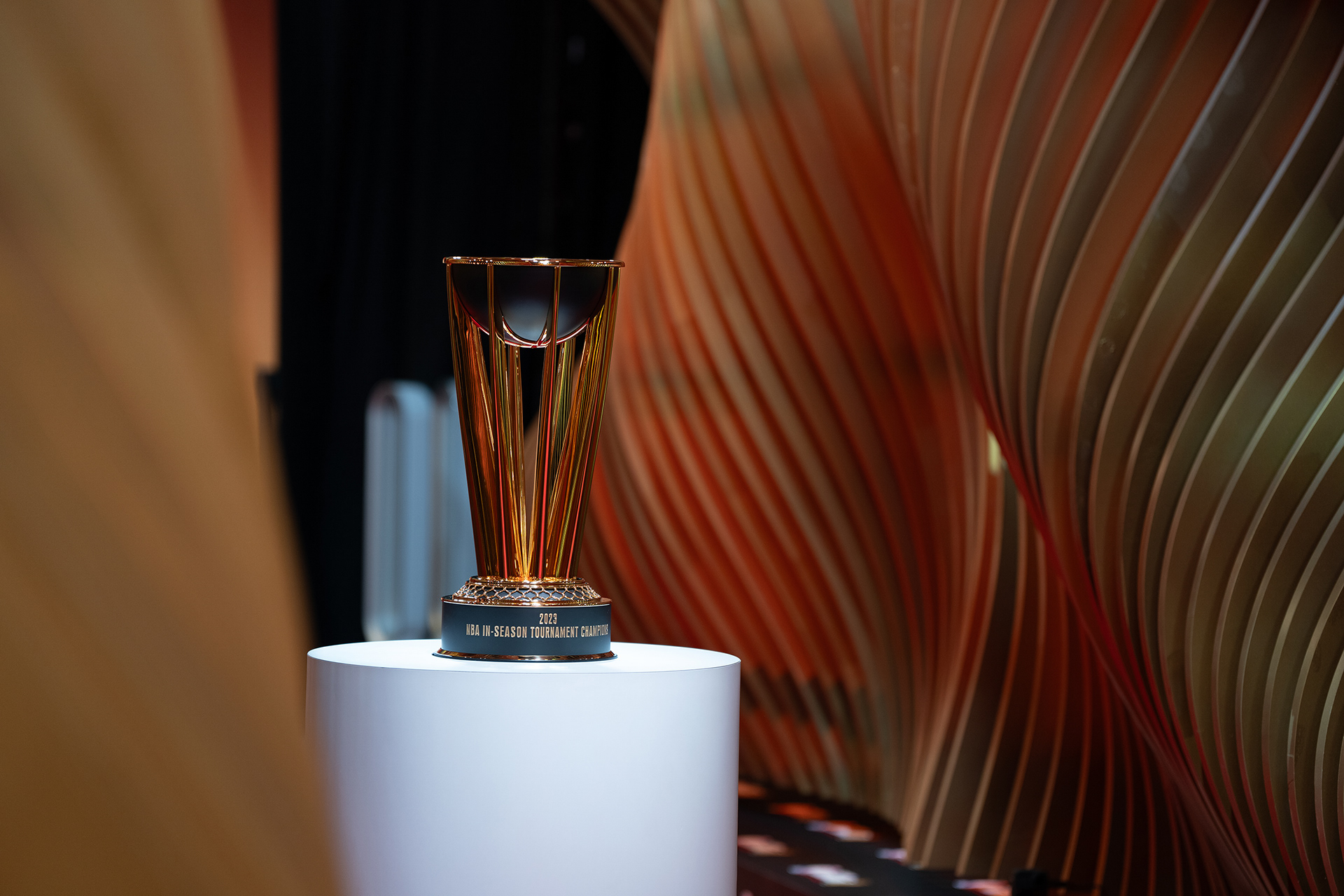 Akin to the swoosh of a net during a perfect shot, our installation captures the grace and dynamism of the sport. The powerful impact of a basketball, a singular moment of intensity, is translated into a tangible, structural force that resonates throughout the installation. This force creates a ripple effect, an undulating cascade of energy, which emanates from the trophy at the heart of the runway and leaves an indelible mark on its form, shaping an unparalleled runway experience that seamlessly merges the worlds of sports and fashion.