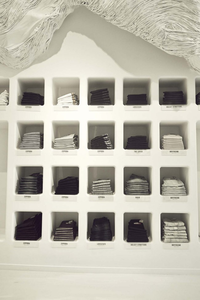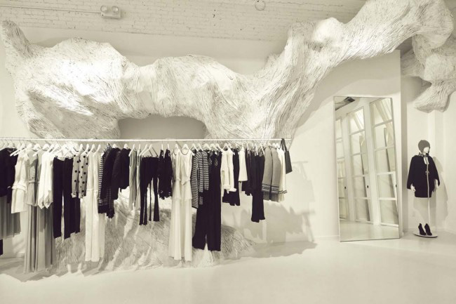 A 2000 sf space in Soho was transformed into the new Sass+Bide flagship store. The main gesture was created by a gigantic driftwood-inspired sculpture. The form was developed through many iterations of both clay and digital modeling. The finalized digital model was translated into production through computer-routed ribs which created the underlying forms for the structural armature. Steel chicken wire was built up as a foundation for fiberglass soaked fabric pieces that created exterior skin of the form. The piece was then sliced up, disassembled, and installed on site by a team of extremely talented sculptures and fabricators.