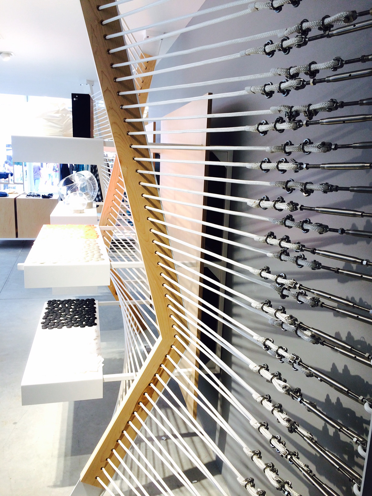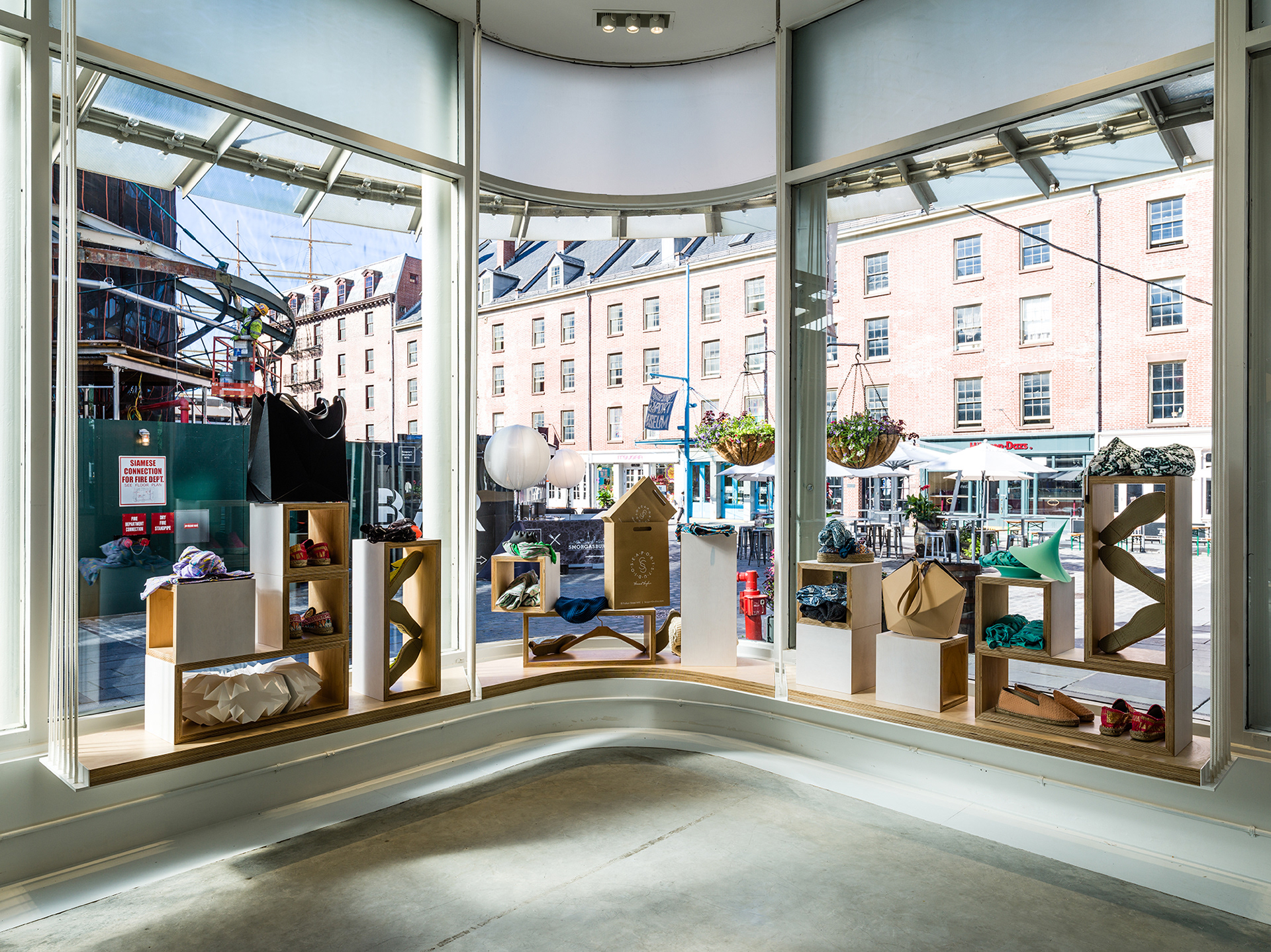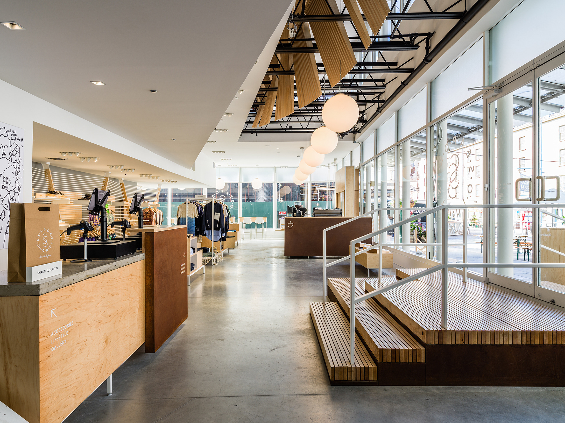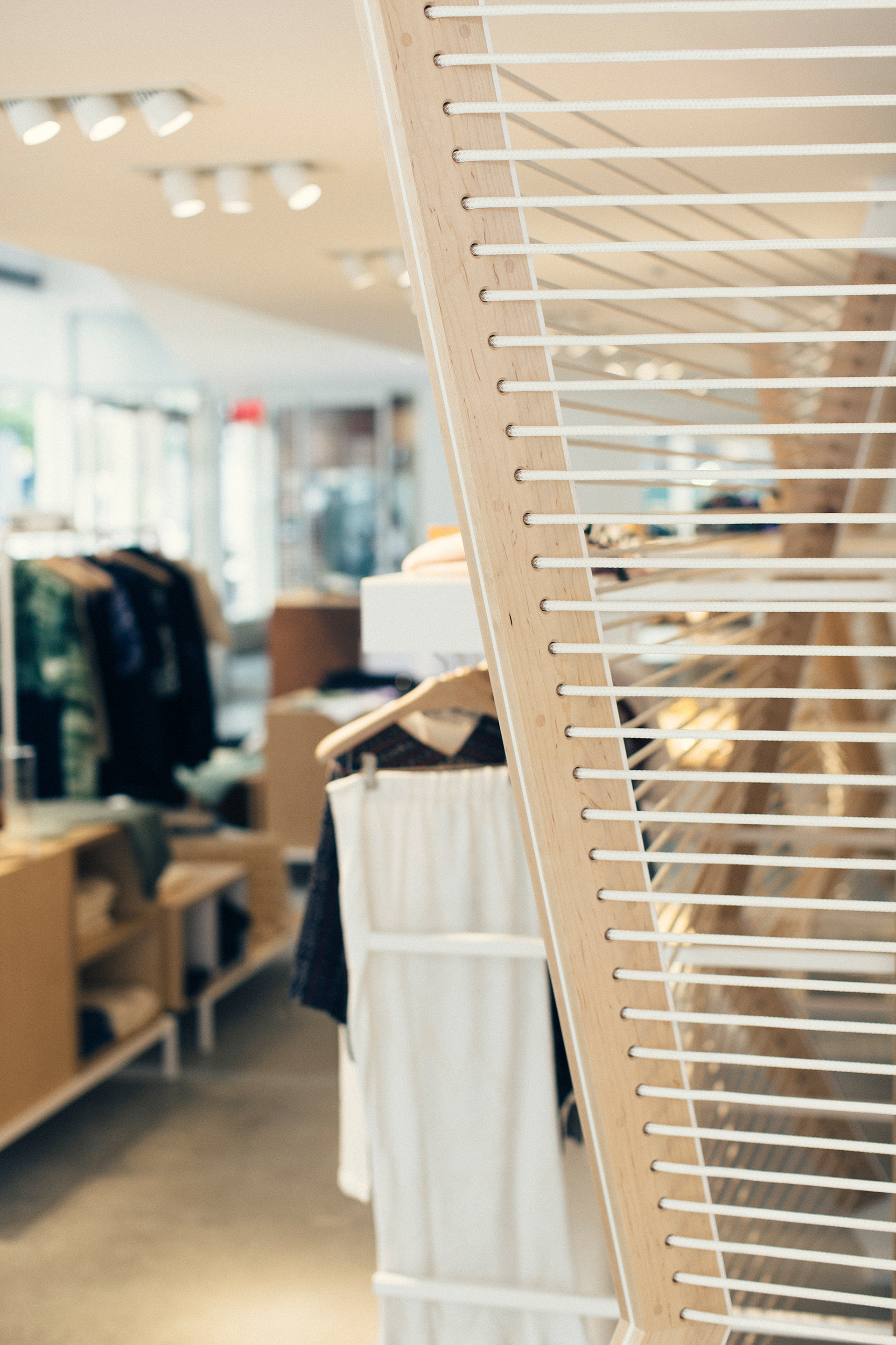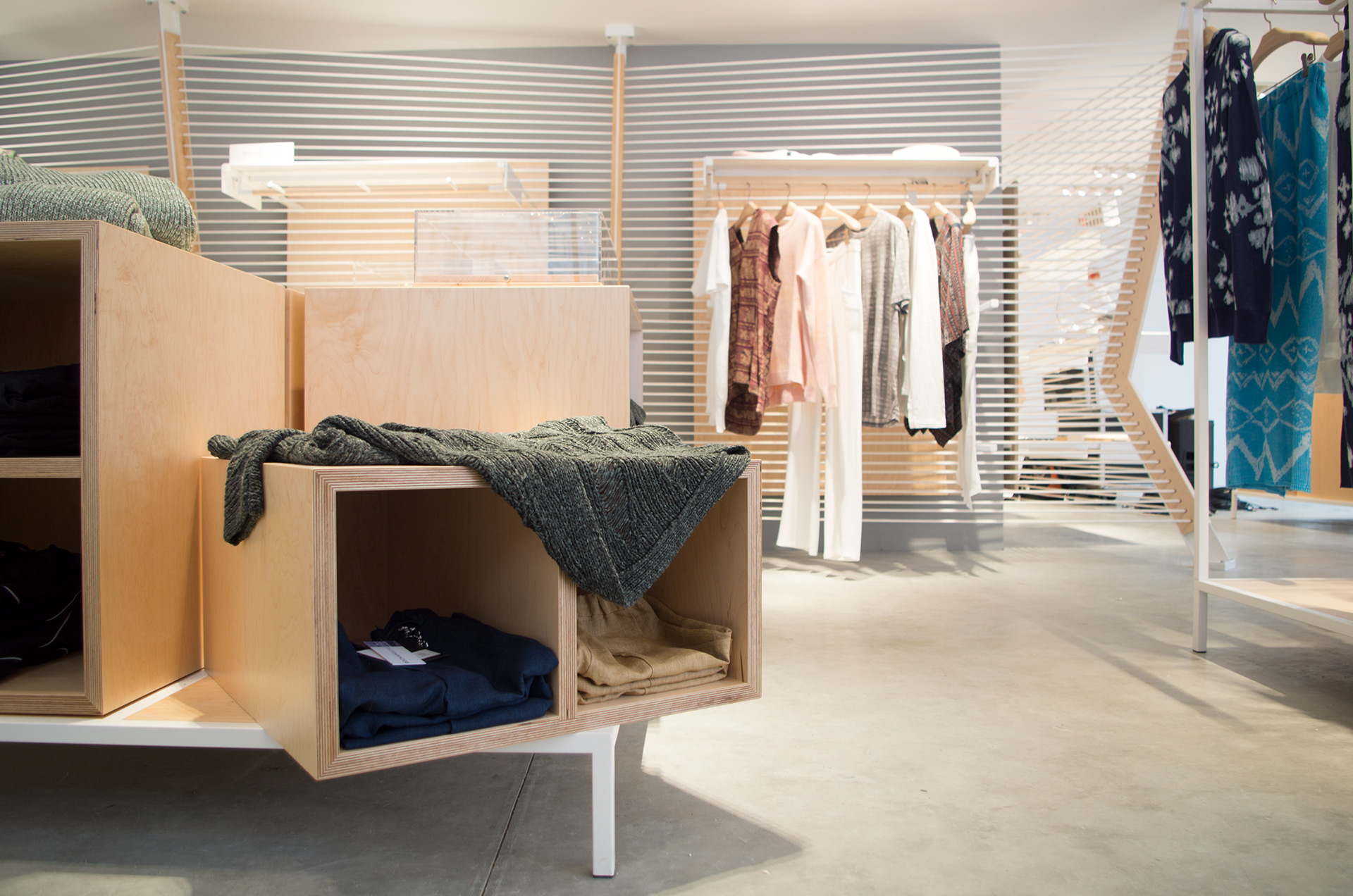2015, "Seaport Studios partners with independent brands that represent the highest standards of contemporary style, and invites them to showcase their designs in a curated retail space through storewide takeovers, installations and events." -SeaportStudios.com The Seaport's history is inextricably linked with nautical history. We wanted to reference some of those details and vocabularies in the architecture. The space subtly alludes to the maritime history of the Seaport by using materials, details, and tectonics that are reminiscent of the nautical trade. The key was filtering the nautical direction through a contemporary architectural execution to create a beautiful retail environment. The result is a space that is an abstracted homage to the site's nautical past, and clean canvas for showcasing art and fashion. For display, we created an adaptable infrastructure for showcasing a variety of designers. A range of components and display fixtures were designed to create a consistent kit of parts that could configure to adapt to every retailer. The store uses a minimal palette of natural materials to create a warm industrial aesthetic. This creates a canvas for the showcased products to be the accents highlighted within the space.