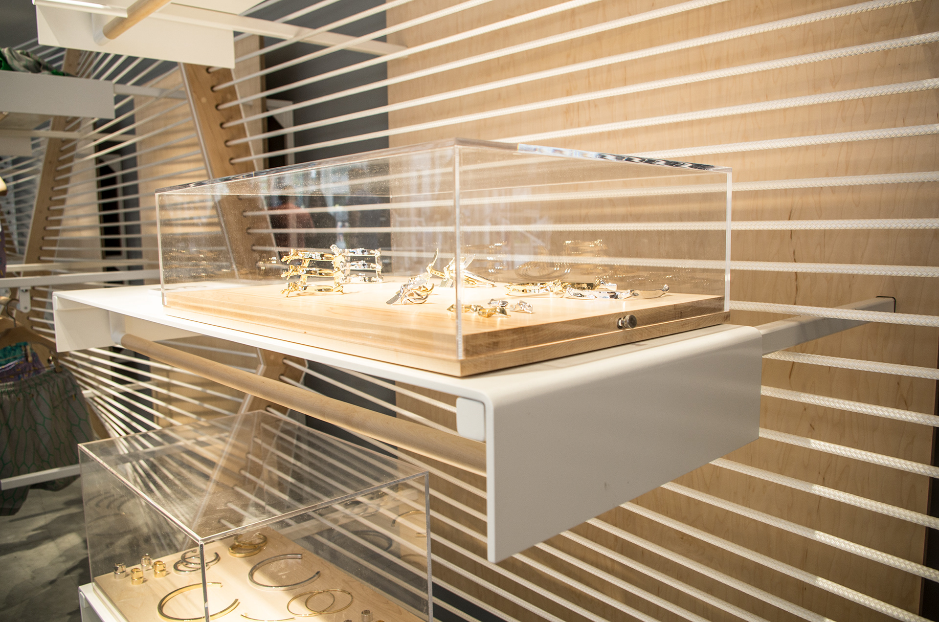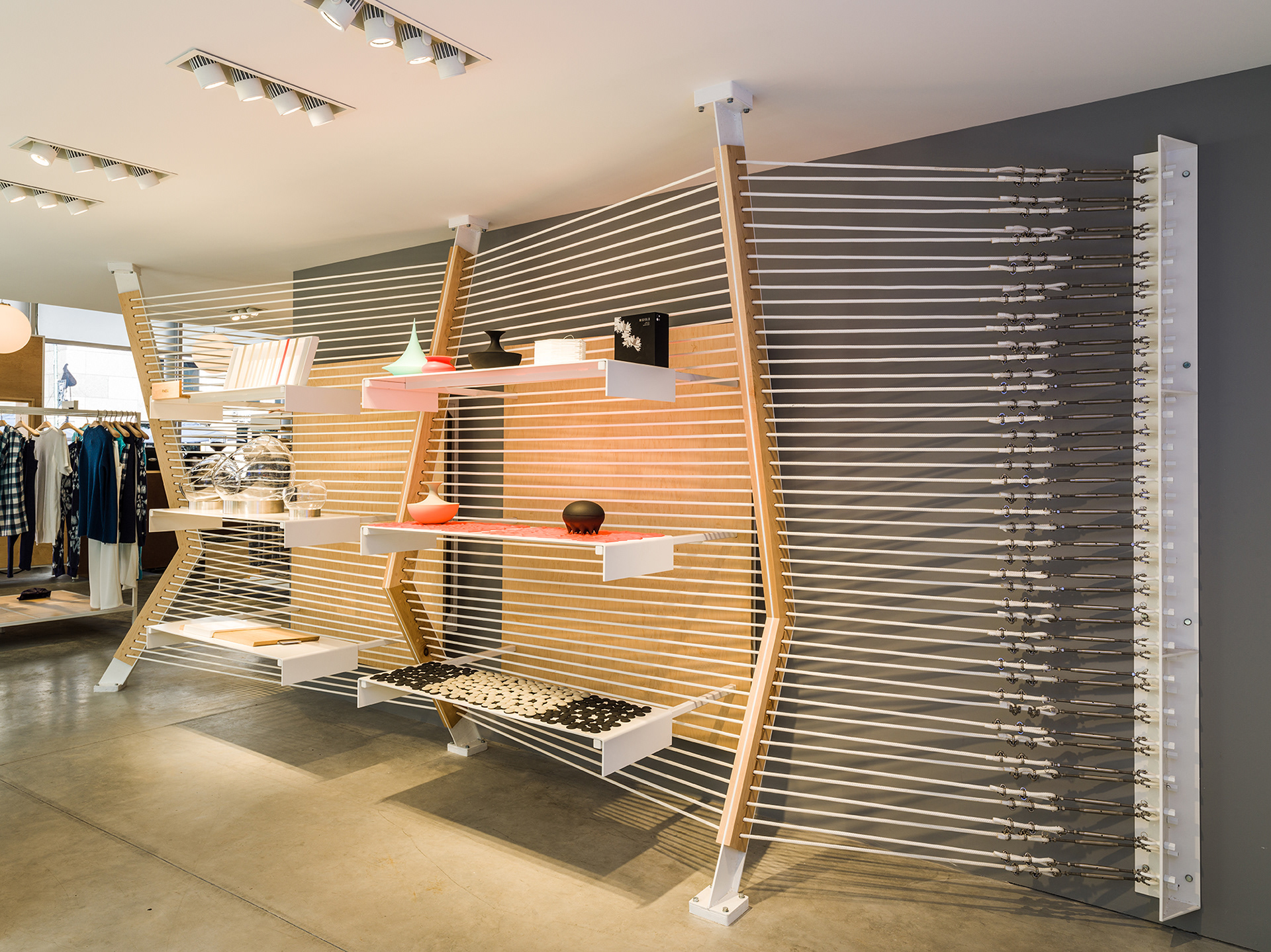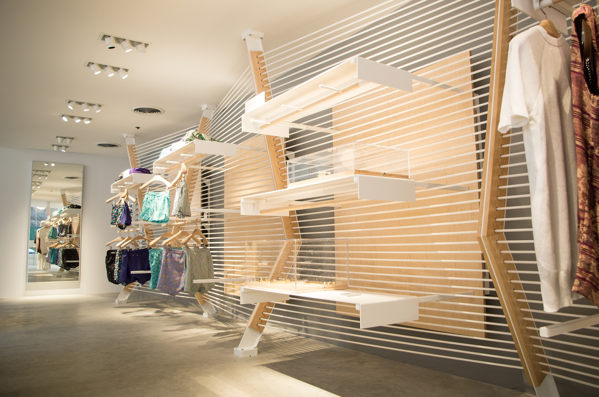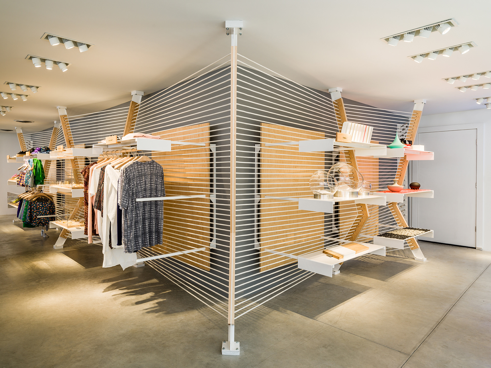 2015, "Seaport Studios partners with independent brands that represent the highest standards of contemporary style, and invites them to showcase their designs in a curated retail space through storewide takeovers, installations and events." -SeaportStudios.com The Seaport's history is inextricably linked with nautical history. We wanted to reference some of those details and vocabularies in the architecture. The space subtly alludes to the maritime history of the Seaport by using materials, details, and tectonics that are reminiscent of the nautical trade. The key was filtering the nautical direction through a contemporary architectural execution to create a beautiful retail environment. The result is a space that is an abstracted homage to the site's nautical past, and clean canvas for showcasing art and fashion. For display, we created an adaptable infrastructure for showcasing a variety of designers. A range of components and display fixtures were designed to create a consistent kit of parts that could configure to adapt to every retailer. The store uses a minimal palette of natural materials to create a warm industrial aesthetic. This creates a canvas for the showcased products to be the accents highlighted within the space.