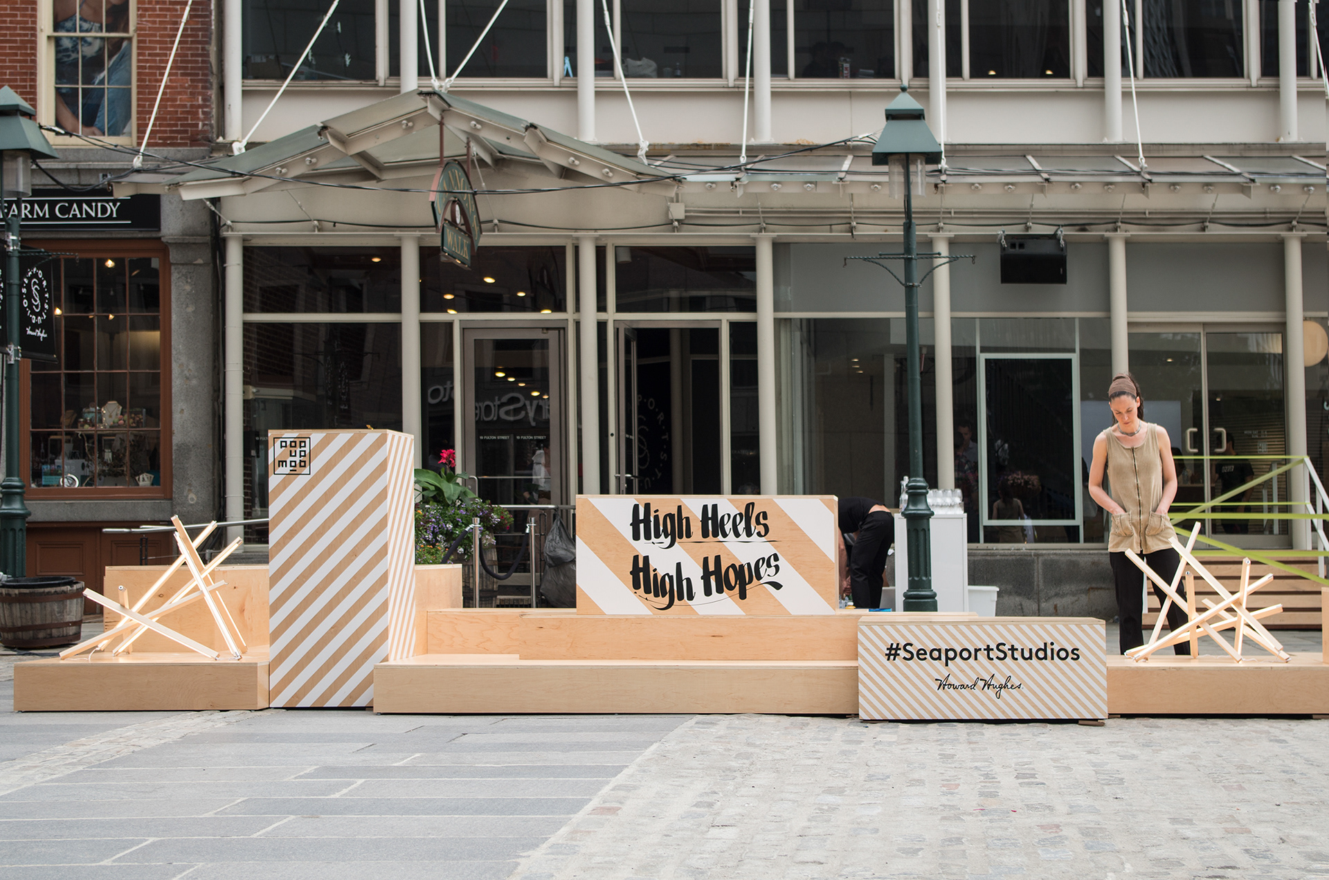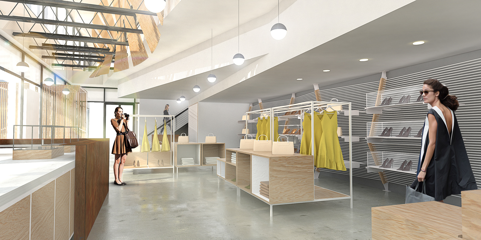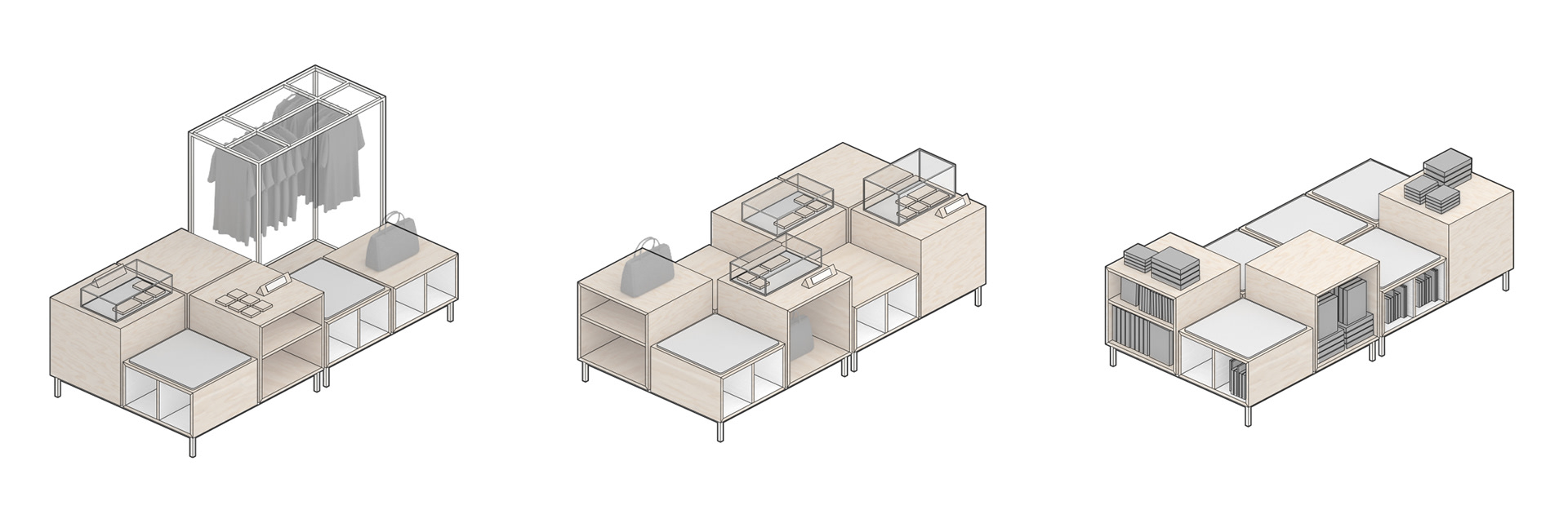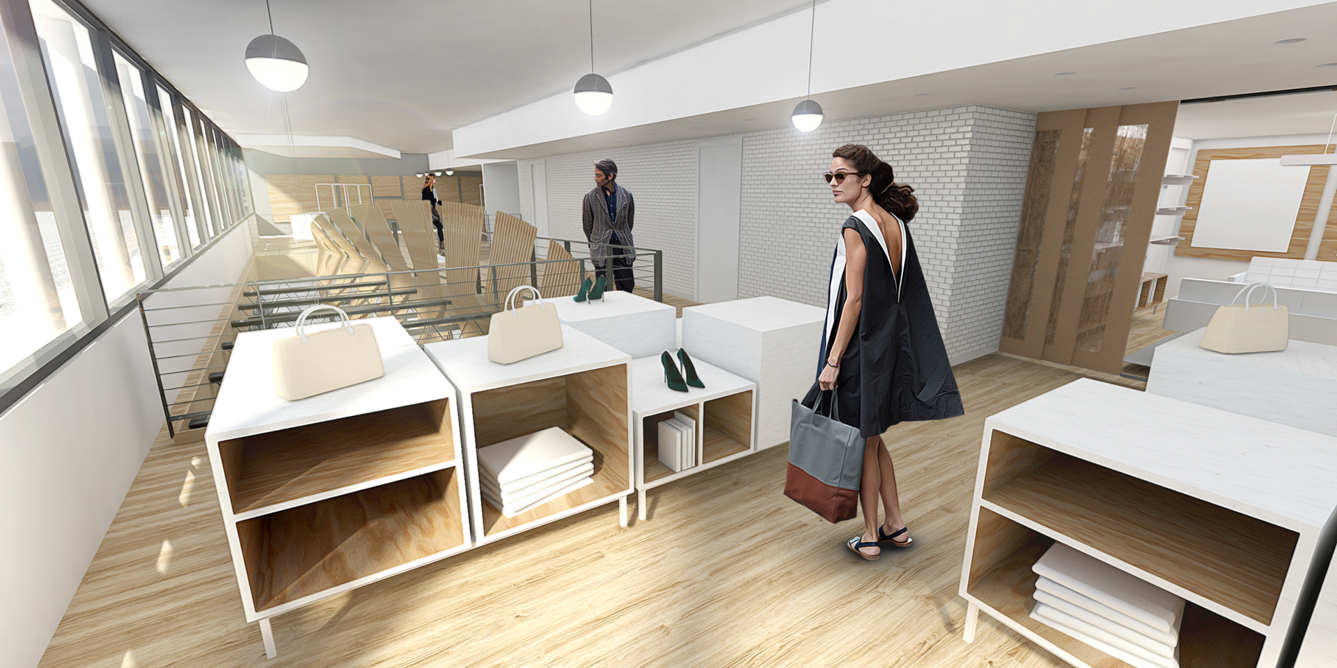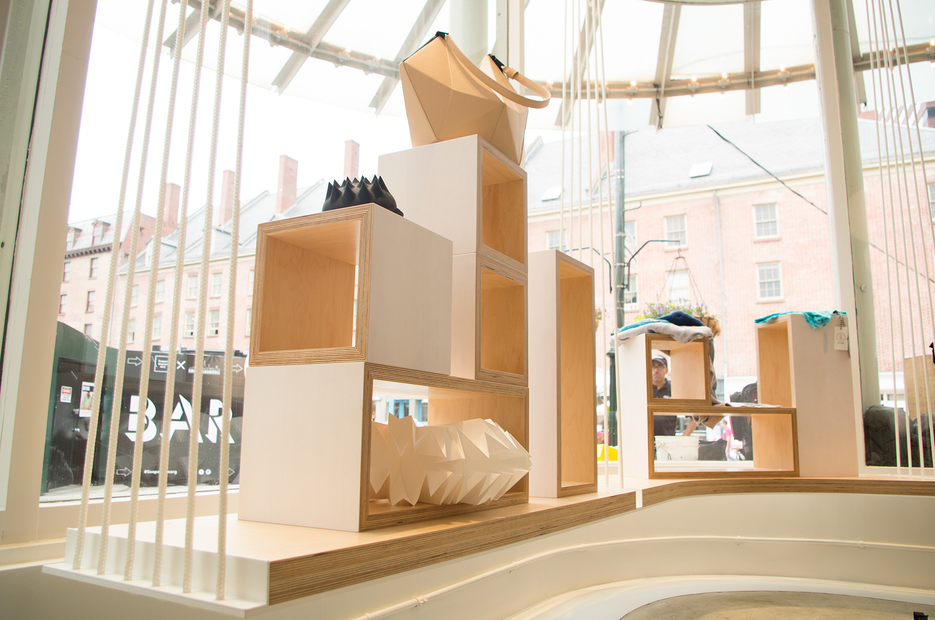 2015, "Seaport Studios partners with independent brands that represent the highest standards of contemporary style, and invites them to showcase their designs in a curated retail space through storewide takeovers, installations and events." -SeaportStudios.com The Seaport's history is inextricably linked with nautical history. We wanted to reference some of those details and vocabularies in the architecture. The space subtly alludes to the maritime history of the Seaport by using materials, details, and tectonics that are reminiscent of the nautical trade. The key was filtering the nautical direction through a contemporary architectural execution to create a beautiful retail environment. The result is a space that is an abstracted homage to the site's nautical past, and clean canvas for showcasing art and fashion. For display, we created an adaptable infrastructure for showcasing a variety of designers. A range of components and display fixtures were designed to create a consistent kit of parts that could configure to adapt to every retailer. The store uses a minimal palette of natural materials to create a warm industrial aesthetic. This creates a canvas for the showcased products to be the accents highlighted within the space.