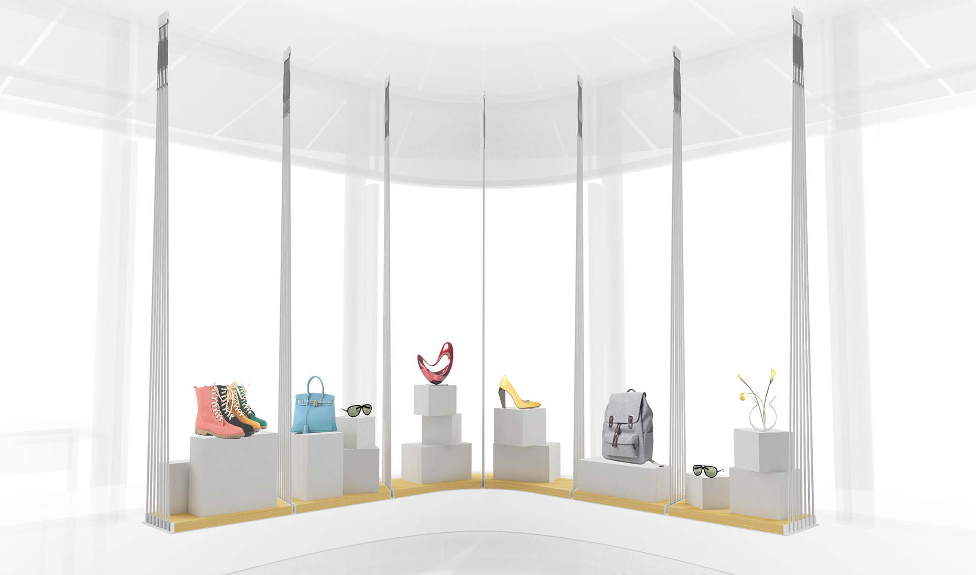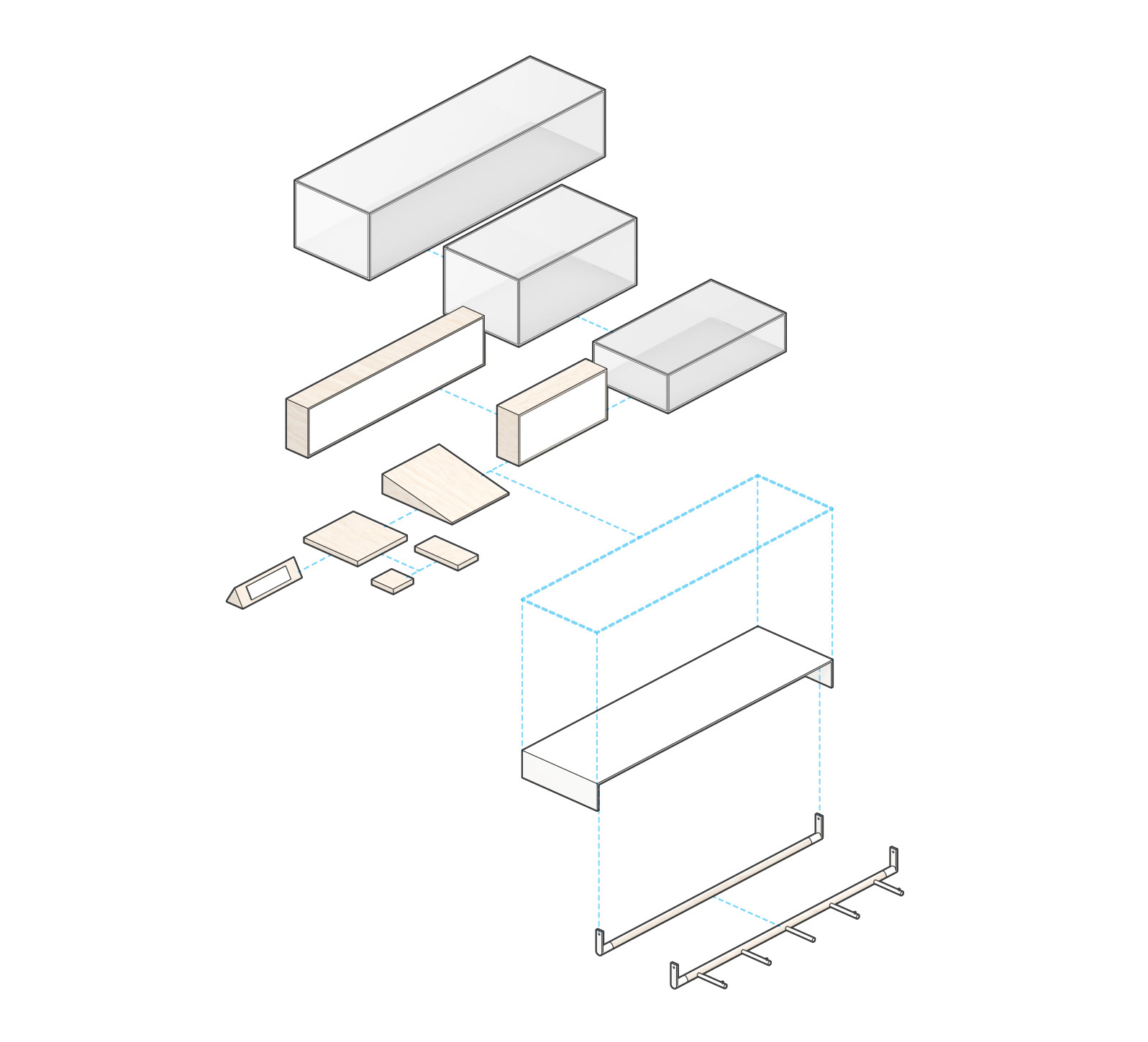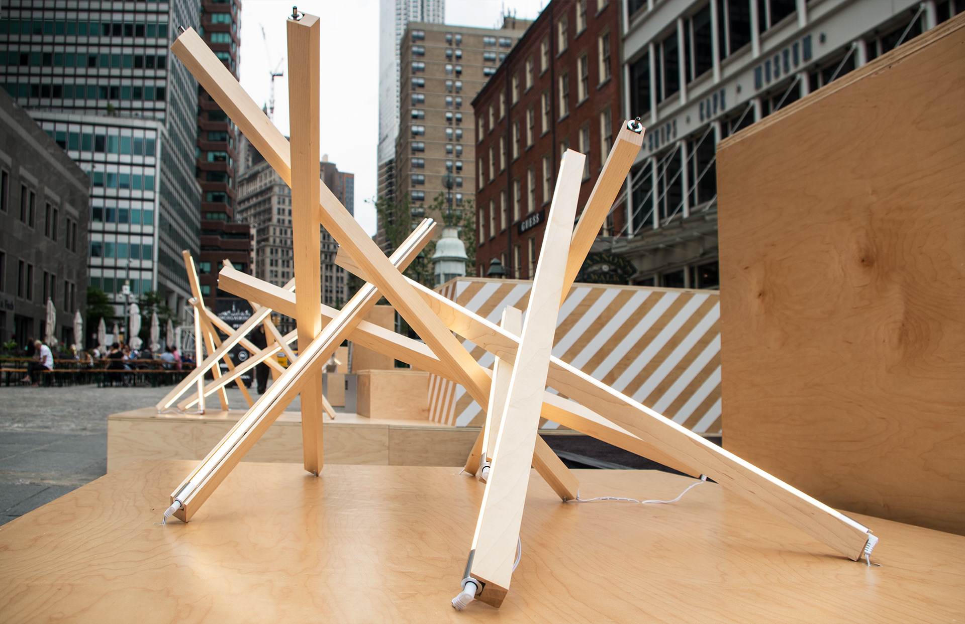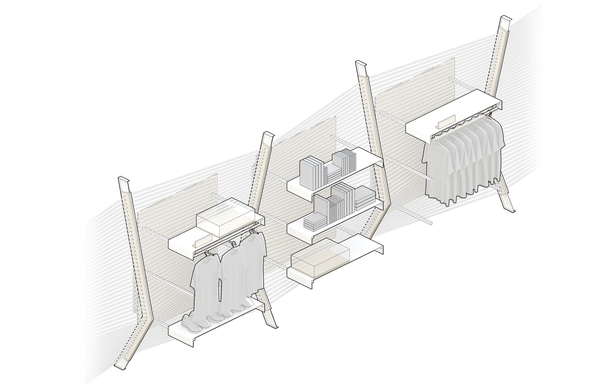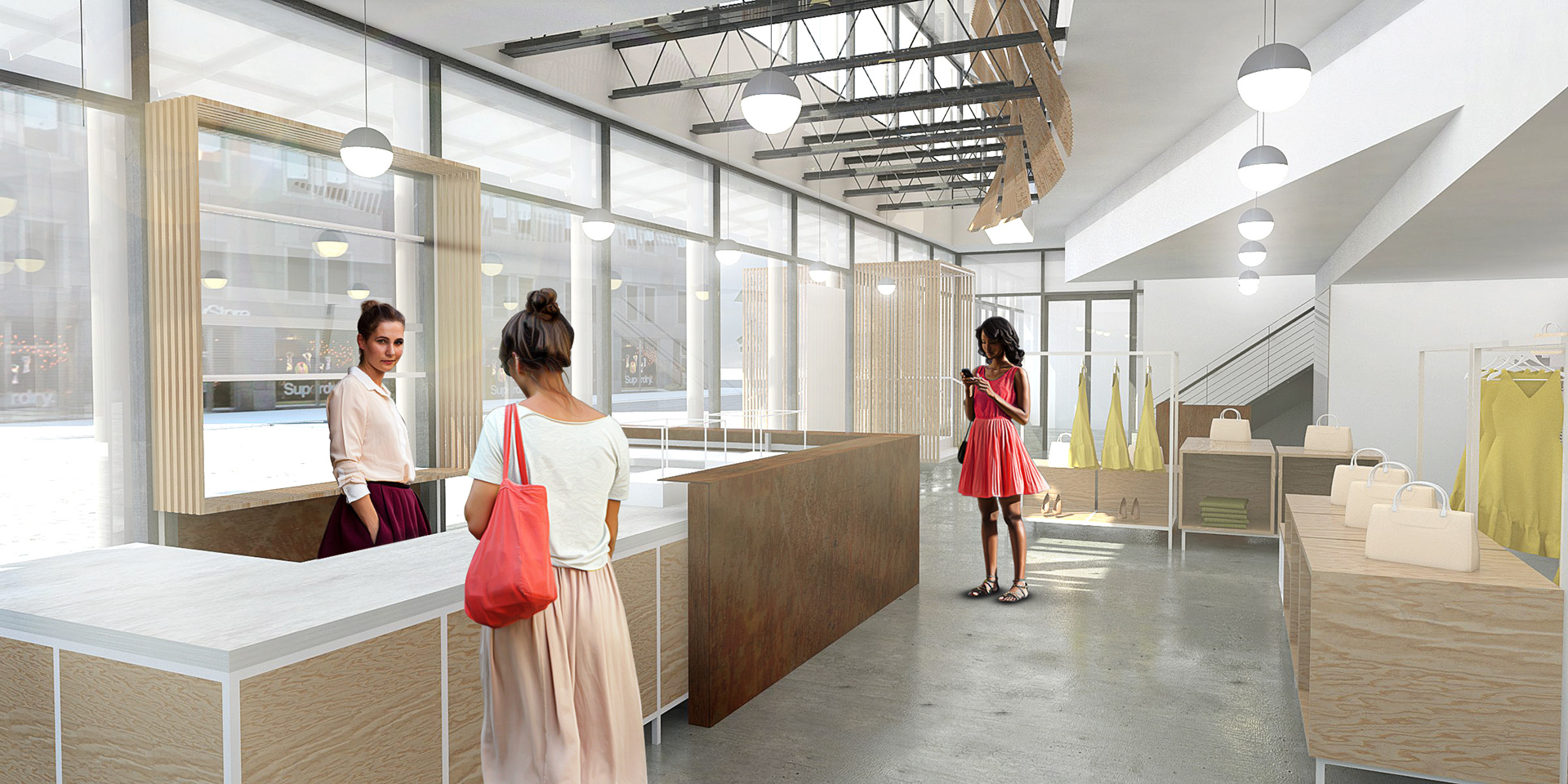 2015, "Seaport Studios partners with independent brands that represent the highest standards of contemporary style, and invites them to showcase their designs in a curated retail space through storewide takeovers, installations and events." -SeaportStudios.com The Seaport's history is inextricably linked with nautical history. We wanted to reference some of those details and vocabularies in the architecture. The space subtly alludes to the maritime history of the Seaport by using materials, details, and tectonics that are reminiscent of the nautical trade. The key was filtering the nautical direction through a contemporary architectural execution to create a beautiful retail environment. The result is a space that is an abstracted homage to the site's nautical past, and clean canvas for showcasing art and fashion. For display, we created an adaptable infrastructure for showcasing a variety of designers. A range of components and display fixtures were designed to create a consistent kit of parts that could configure to adapt to every retailer. The store uses a minimal palette of natural materials to create a warm industrial aesthetic. This creates a canvas for the showcased products to be the accents highlighted within the space.