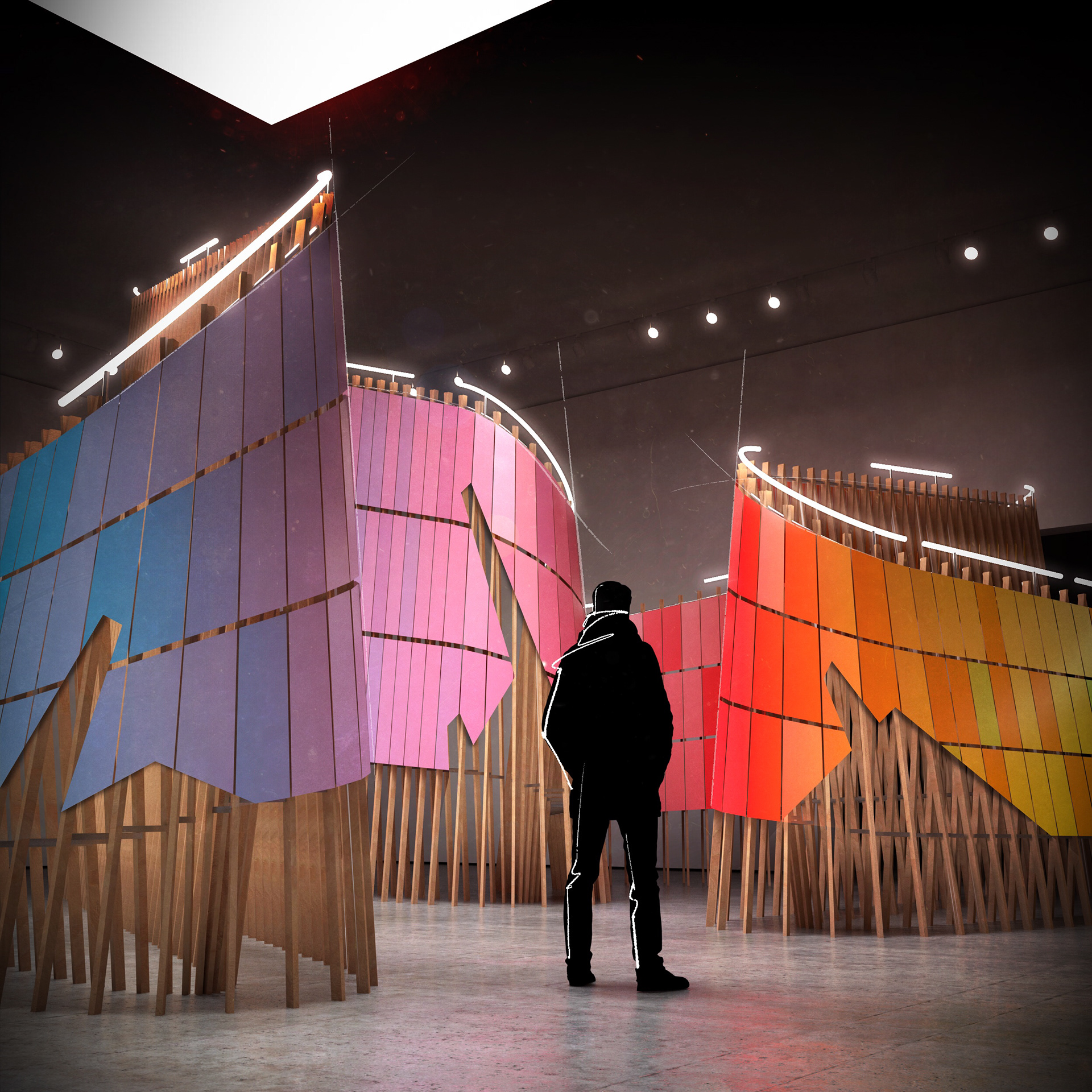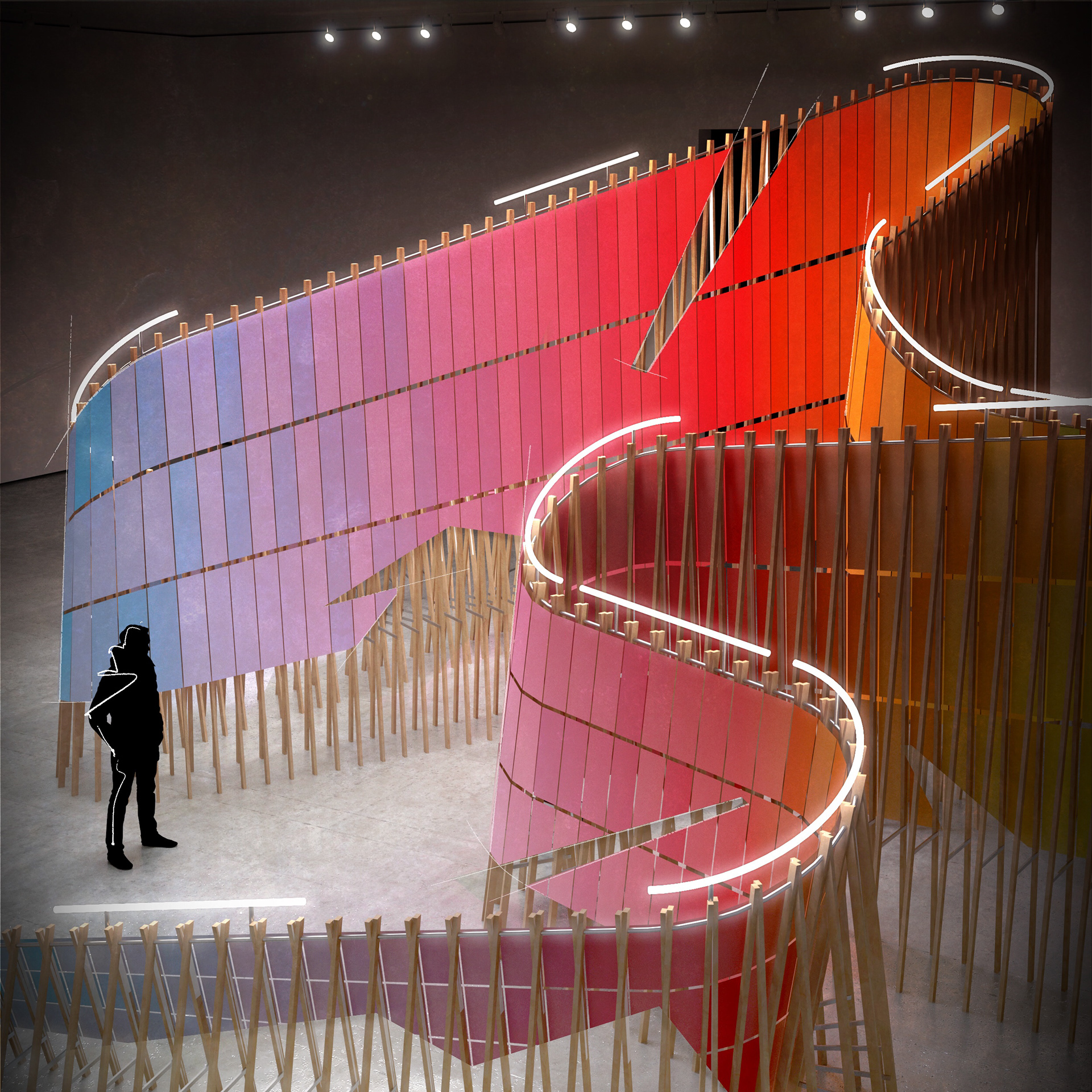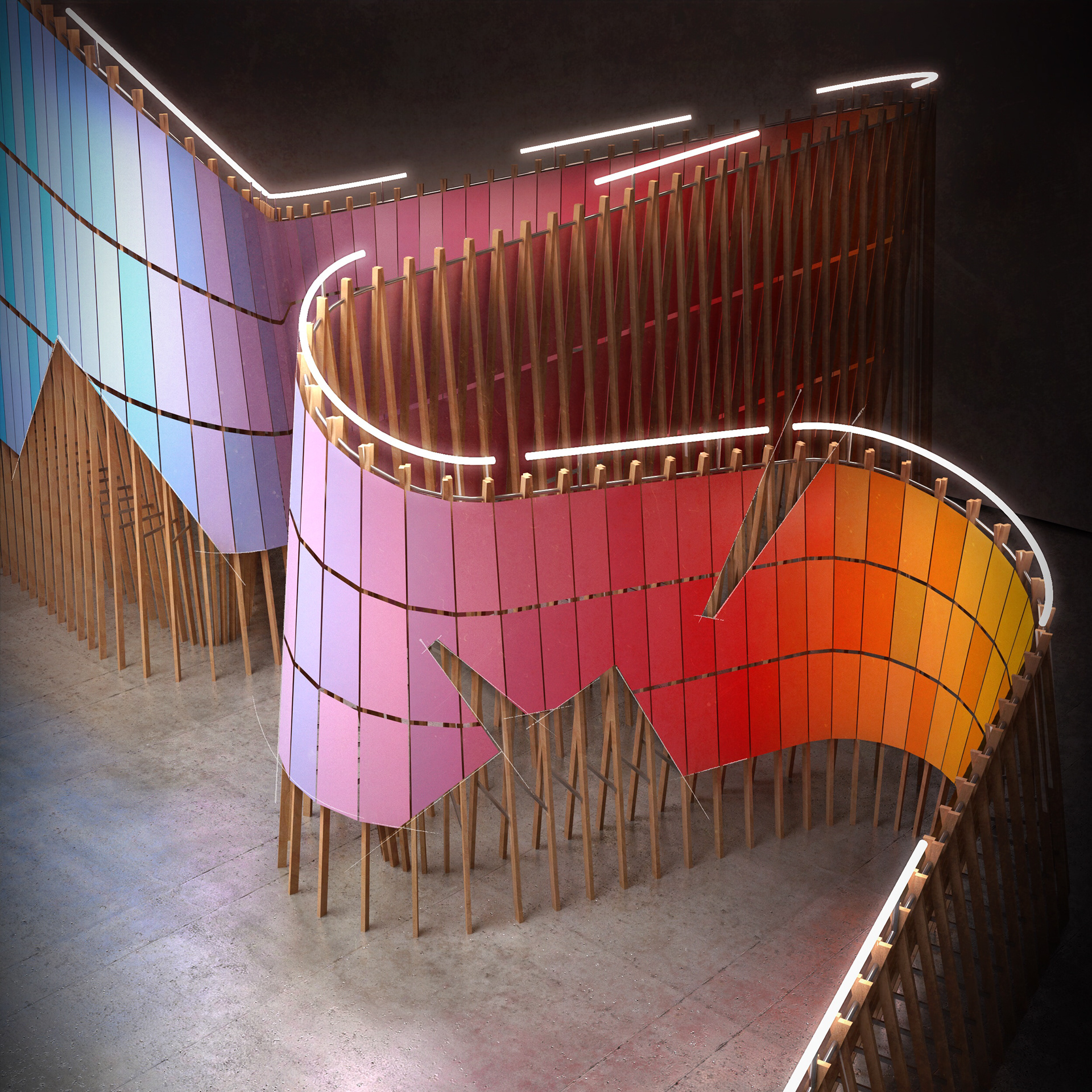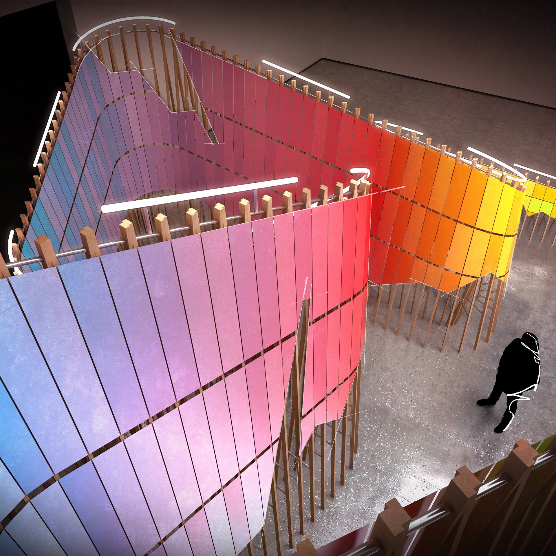 A conceptual proposal for a sculptural partition installation. The design is composed of a sinuous rail that creates a path for an array of a-frame posts. The structure creates a spine for a panelized skin, here shown with a colorful gradient that morphs from warm to cool over the course of the installation. Sections of the surface are sliced and removed to reveal layers and provide a sense of depth. This concept can conform to any space, scale, or take on the functionality a gallery within a gallery.