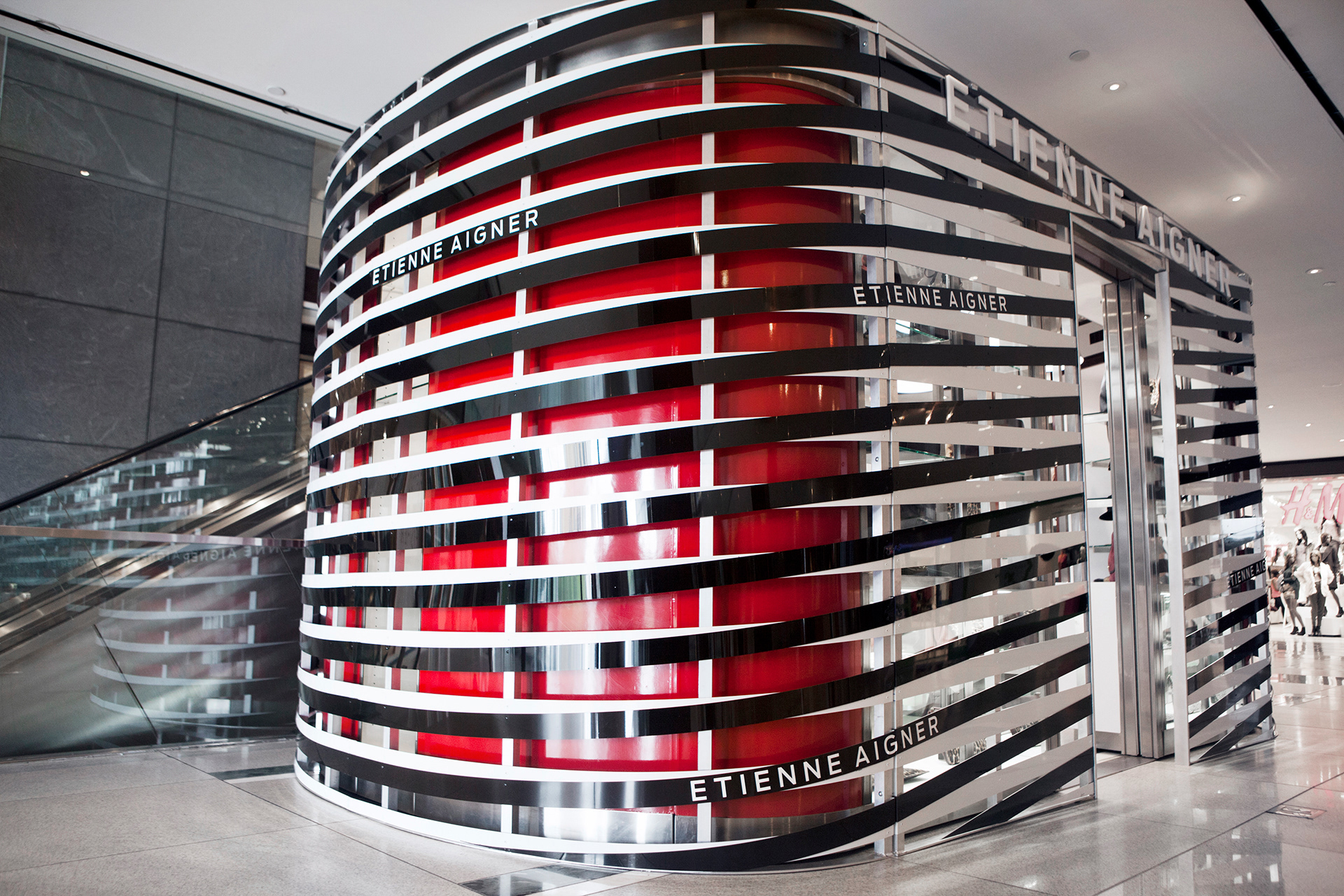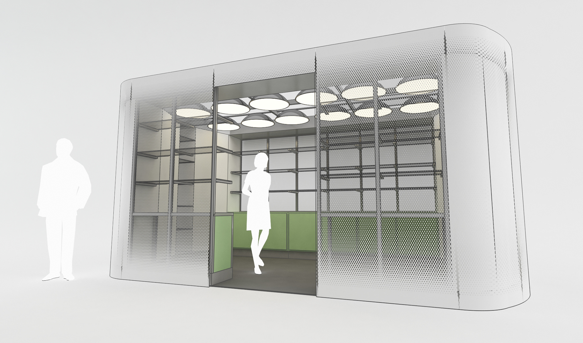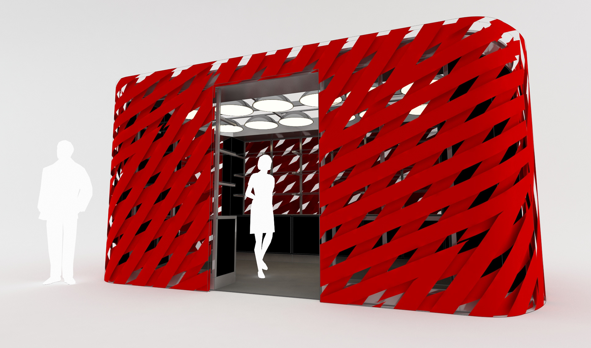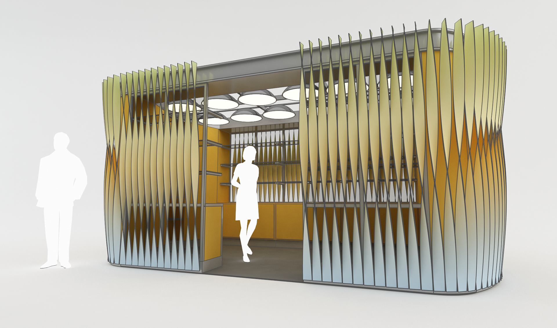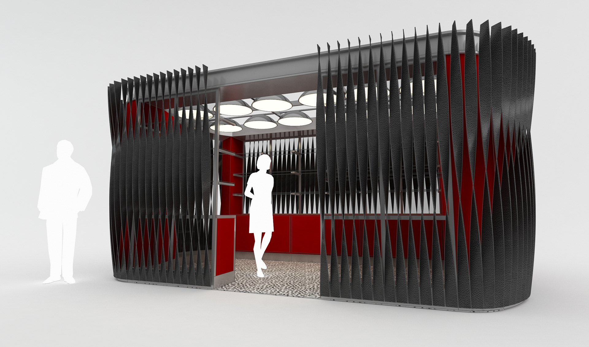 A small concept retail space in Time Warner Center, featuring a layered custom aluminum skin on a refinished existing unit. The skin was developed with parametric tools to create a screen that redefined the exterior, revealing product through strategically placed openings.
