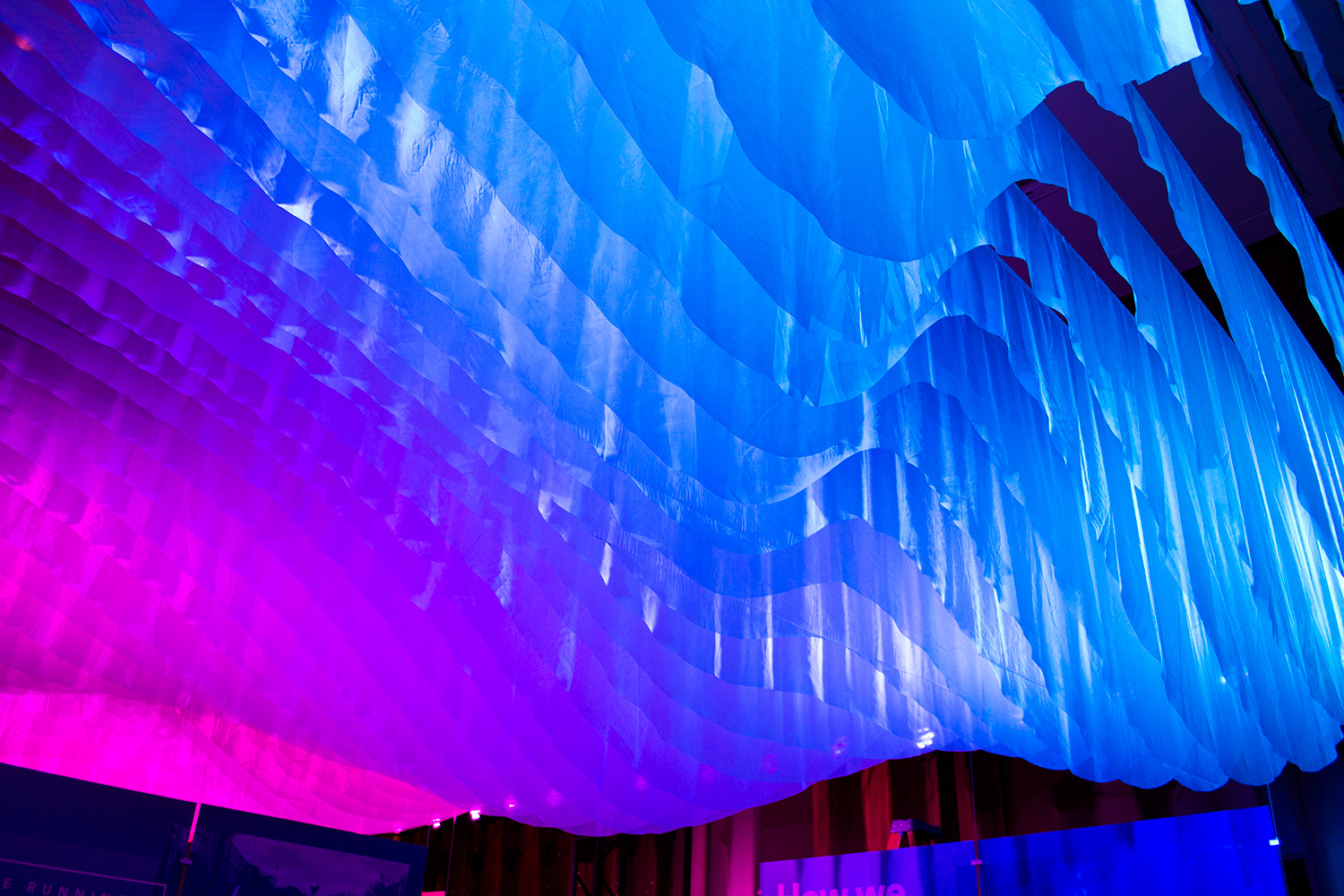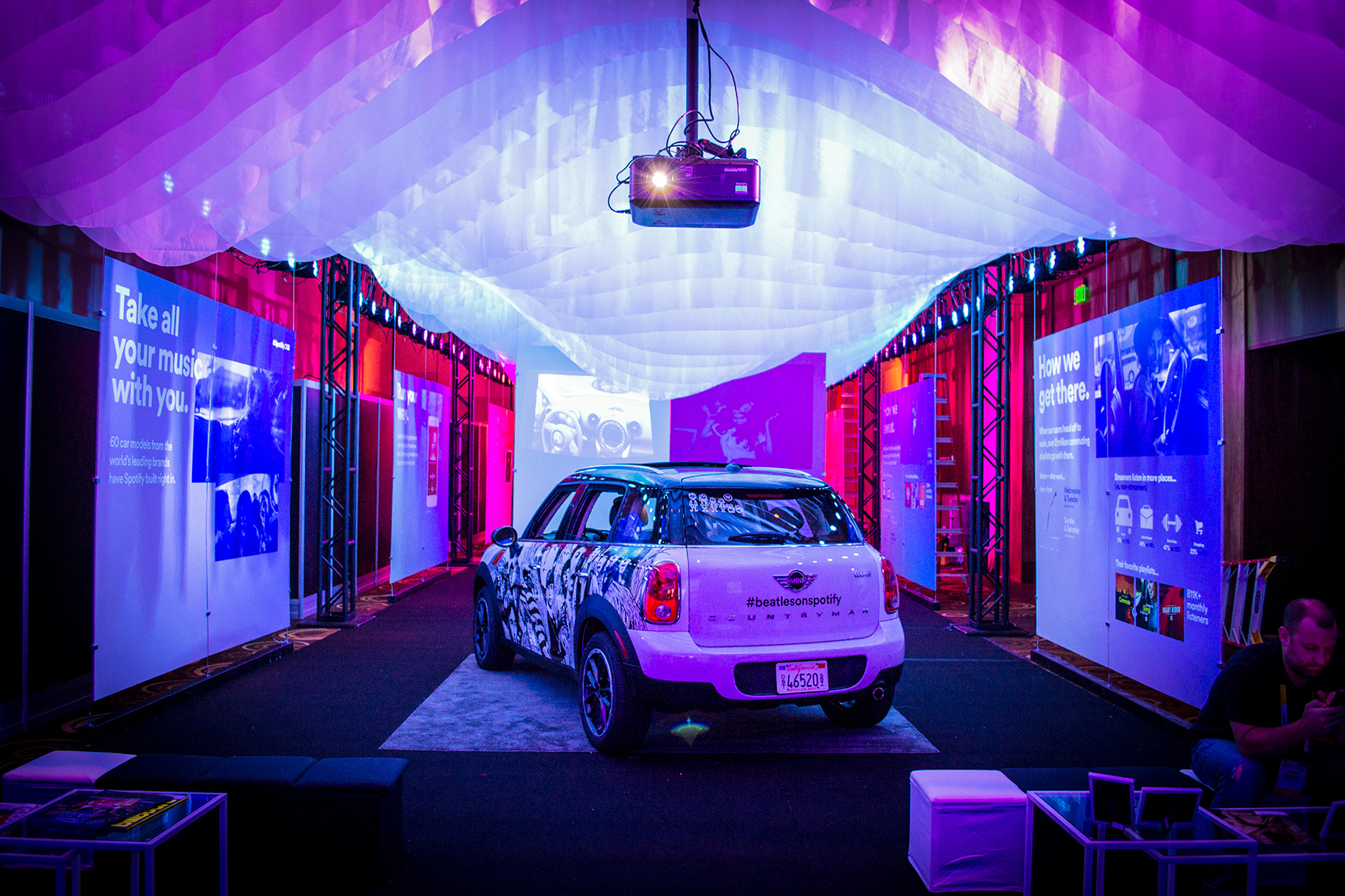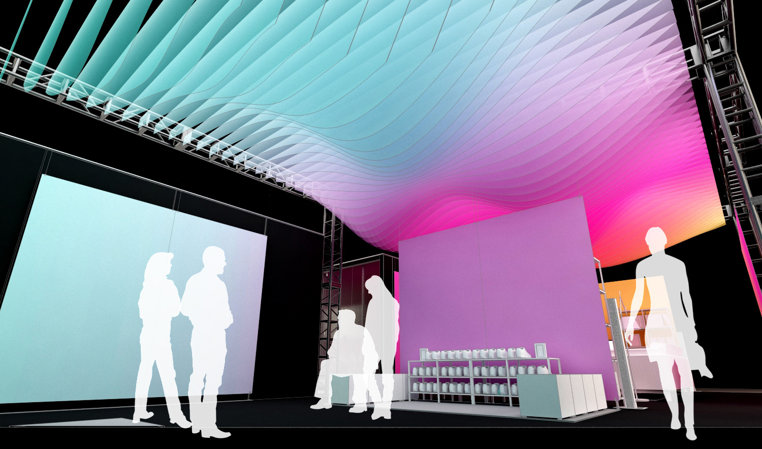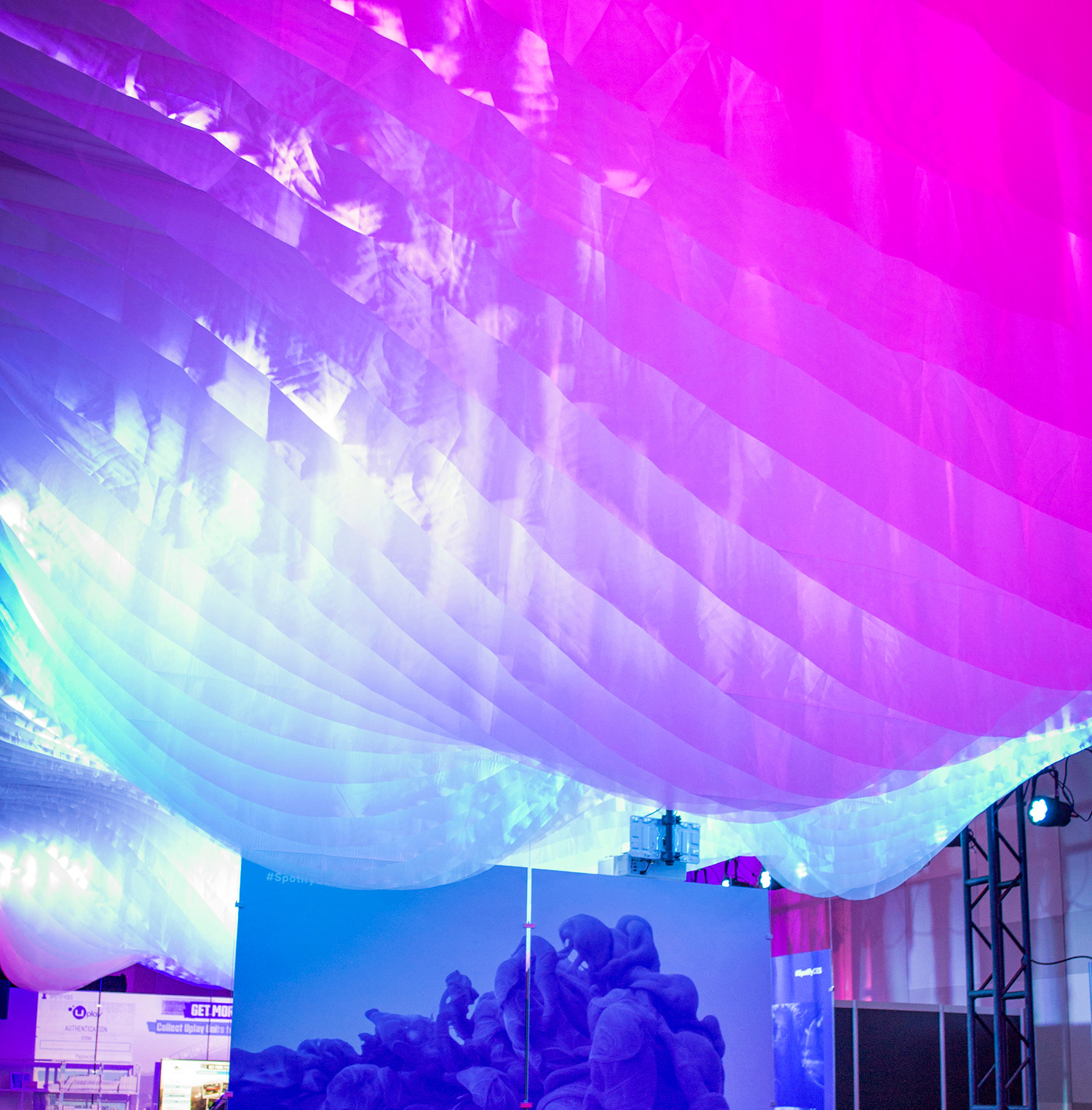 The Spotify experience was imagined as a sequence of open white vignettes along a linear plinth, punctuated by bright accent colors and linked through an undulating "Sky Canopy" above. The Sky Canopy was developed as the visually iconic common thread that links the activations together while expressing the transitioning colors of a sky throughout a day. The design of the installation was developed with parametric design tools to formally "respond" to the activations occurring below, diving down to provide intimacy and soaring upwards to create a sense of grandeur.