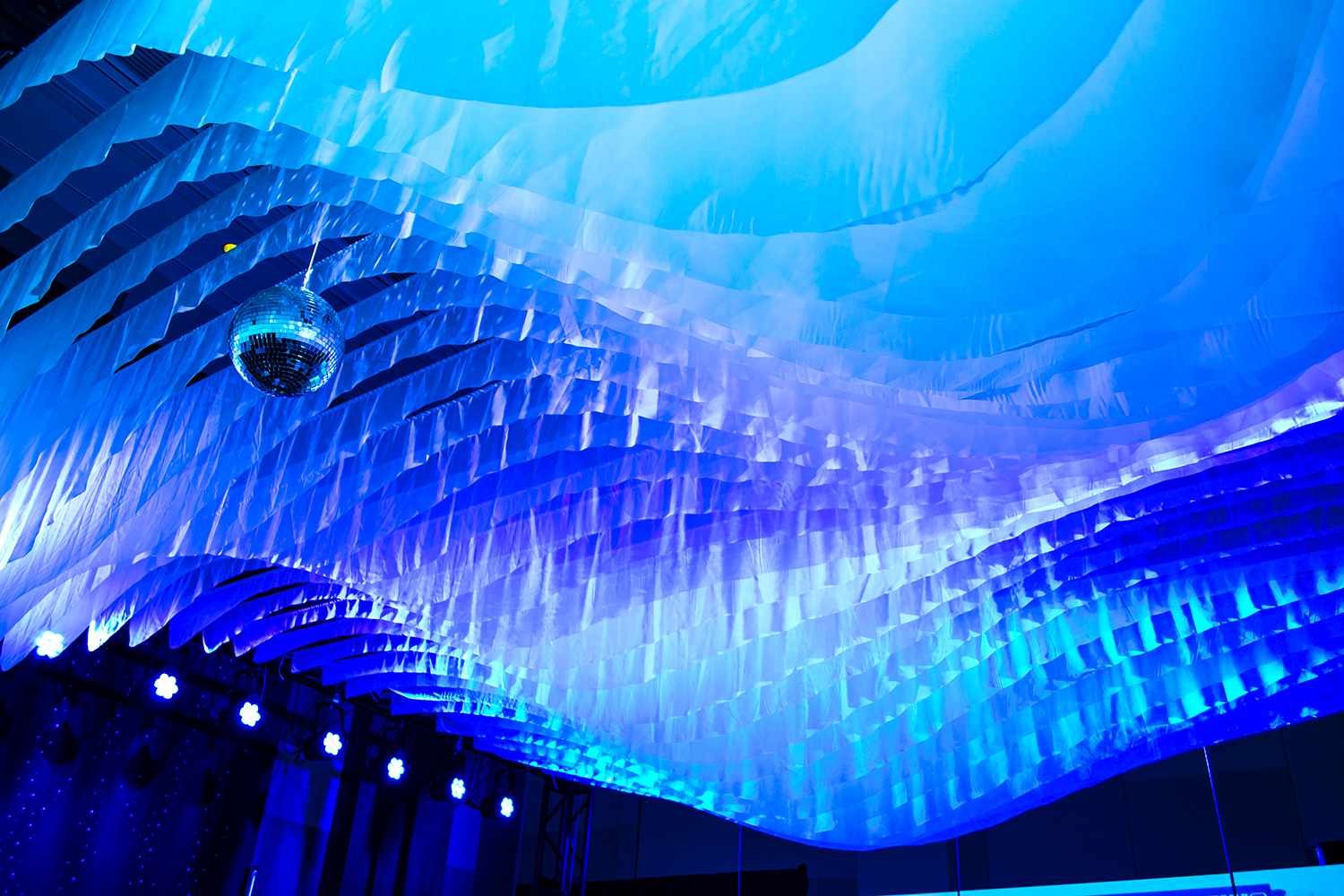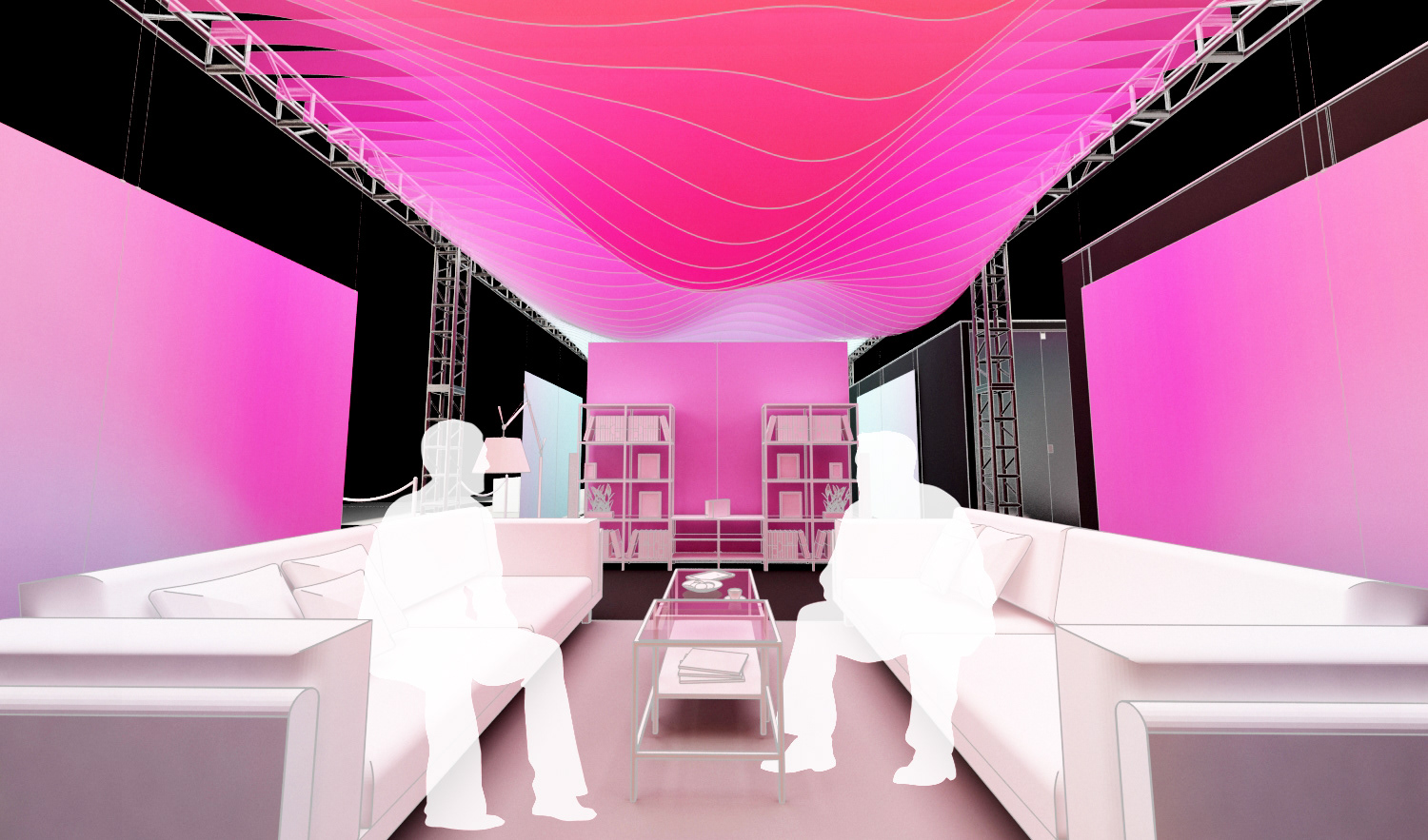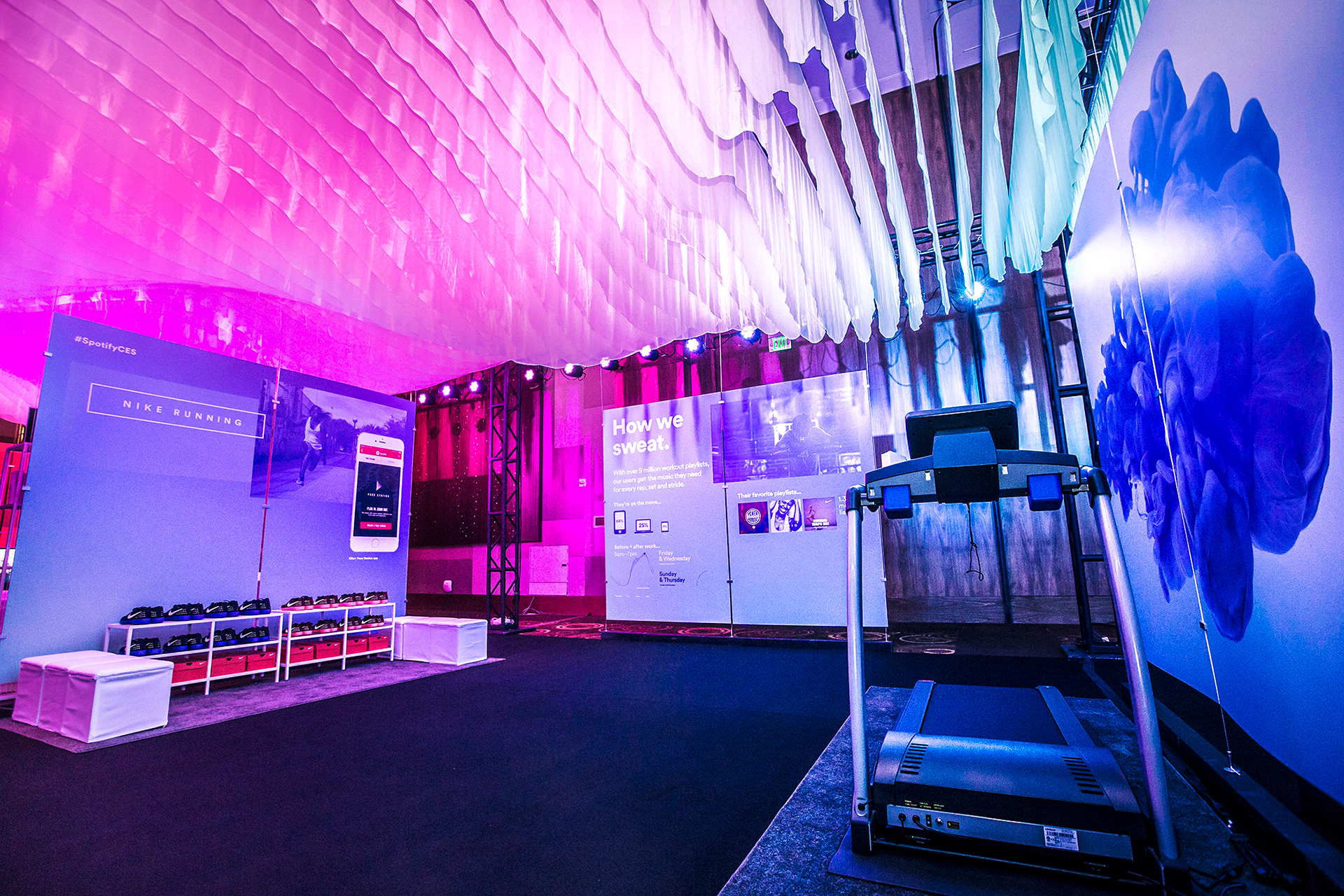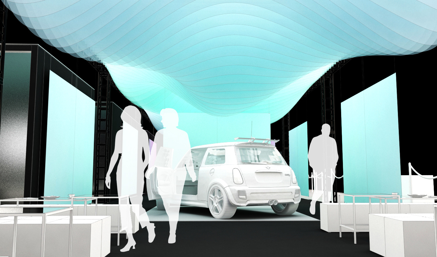 The Spotify experience was imagined as a sequence of open white vignettes along a linear plinth, punctuated by bright accent colors and linked through an undulating "Sky Canopy" above. The Sky Canopy was developed as the visually iconic common thread that links the activations together while expressing the transitioning colors of a sky throughout a day. The design of the installation was developed with parametric design tools to formally "respond" to the activations occurring below, diving down to provide intimacy and soaring upwards to create a sense of grandeur.