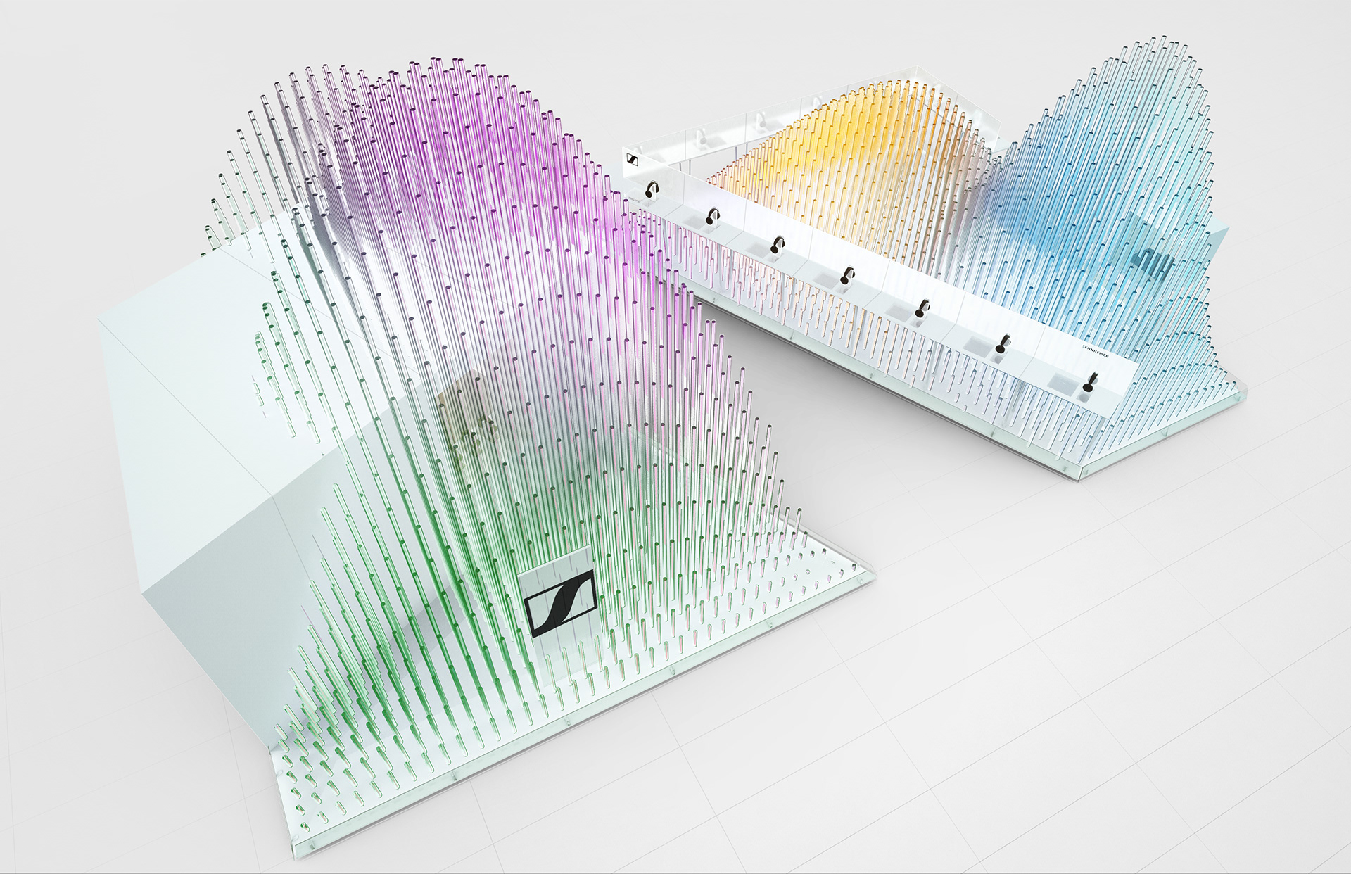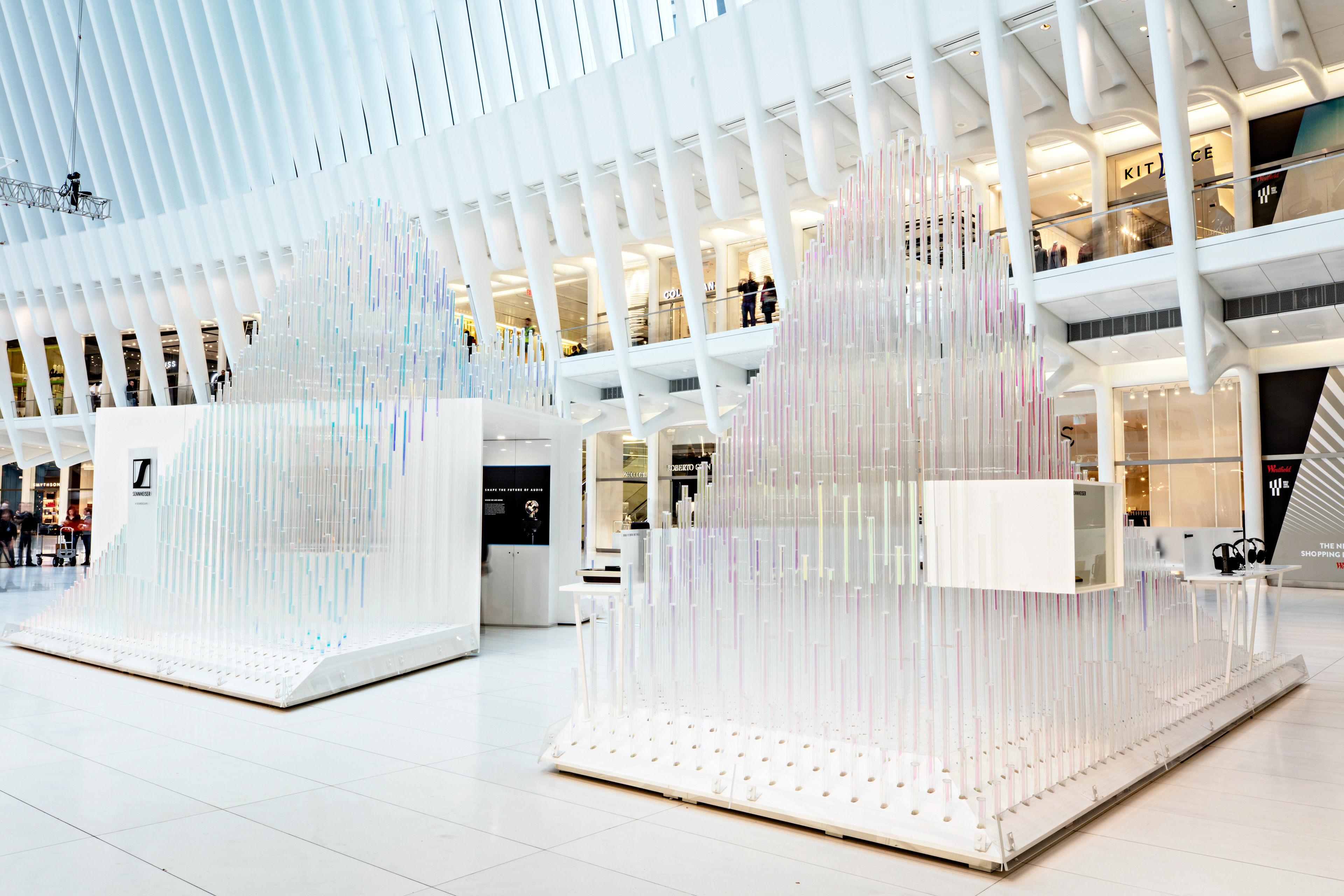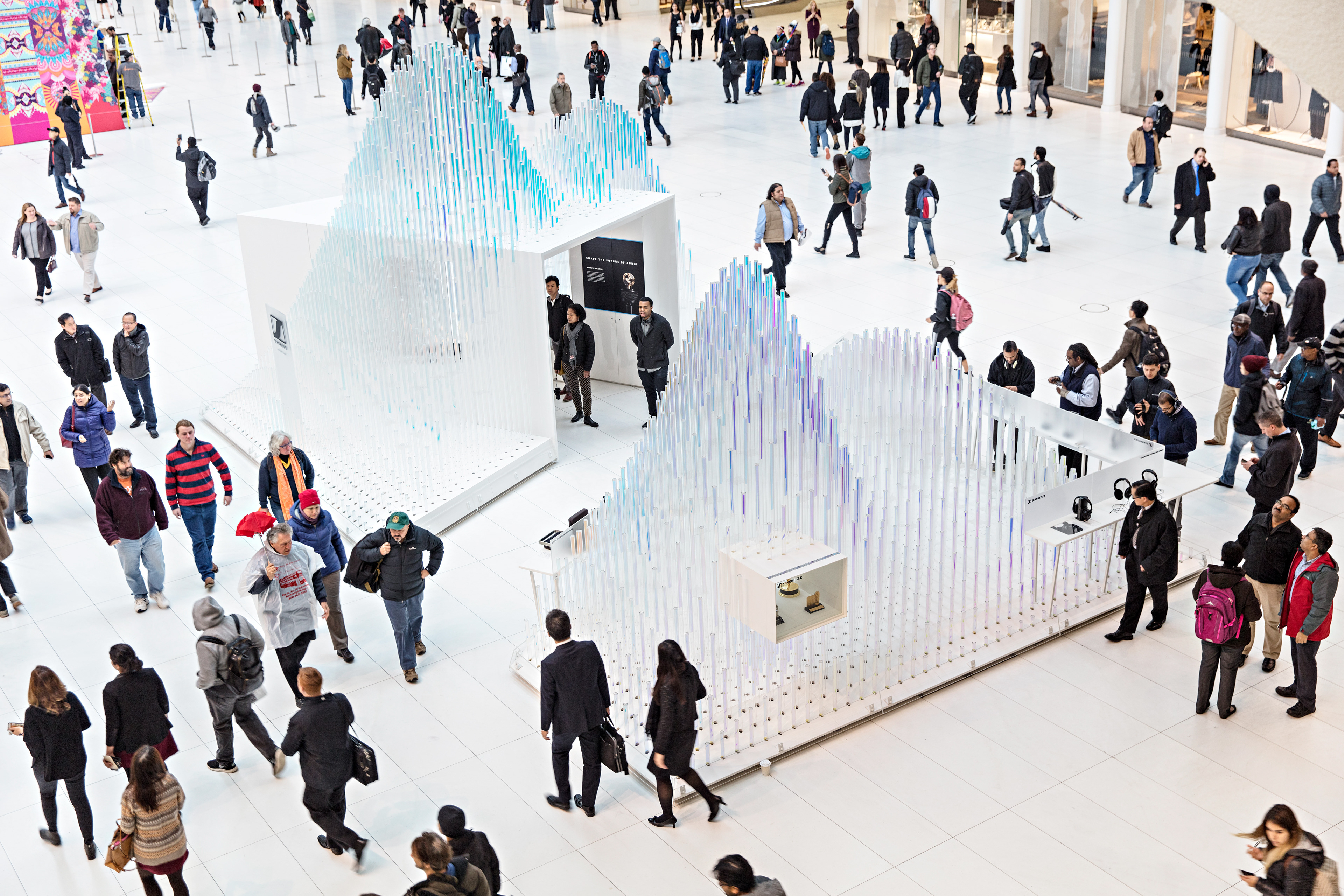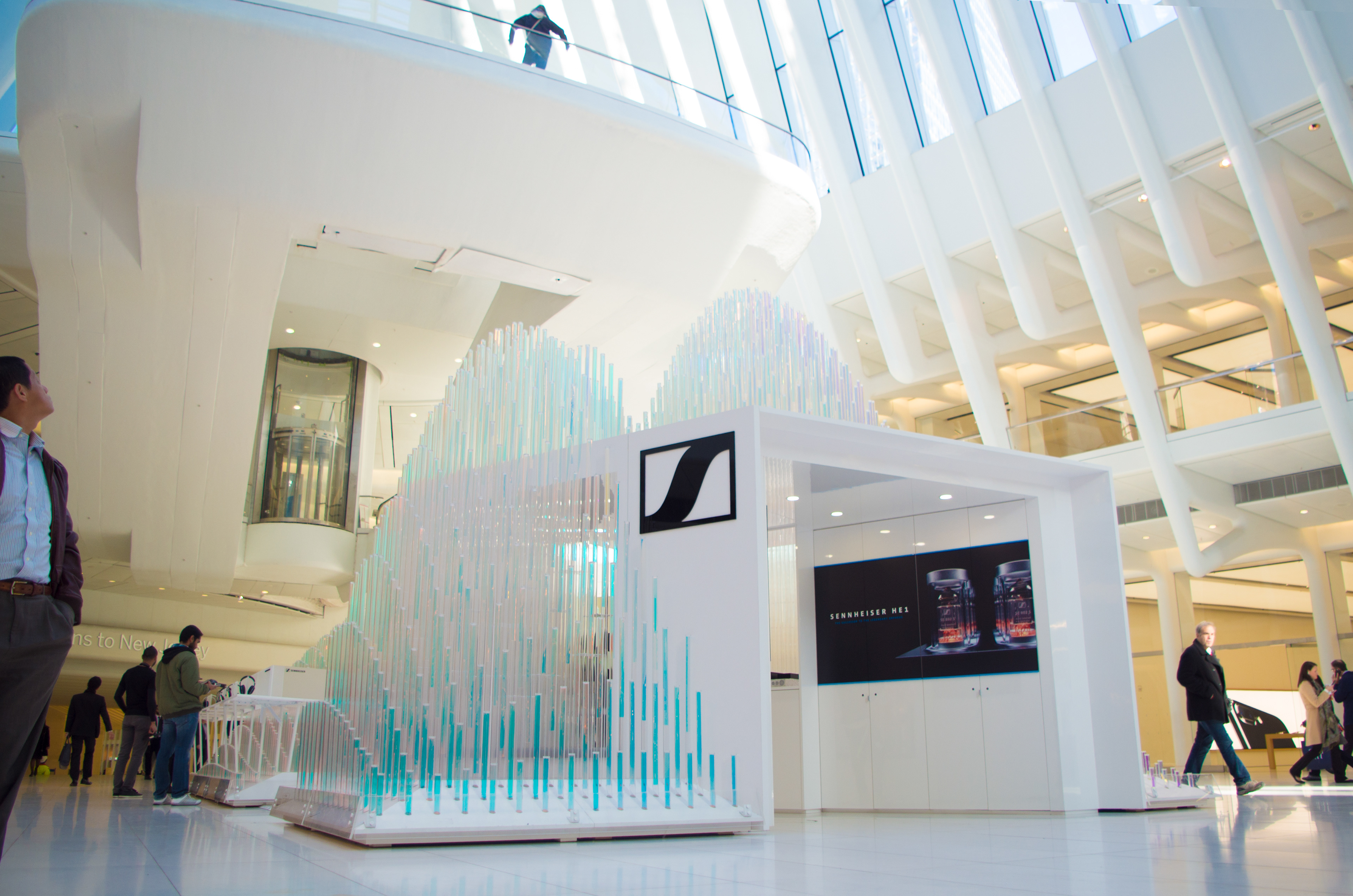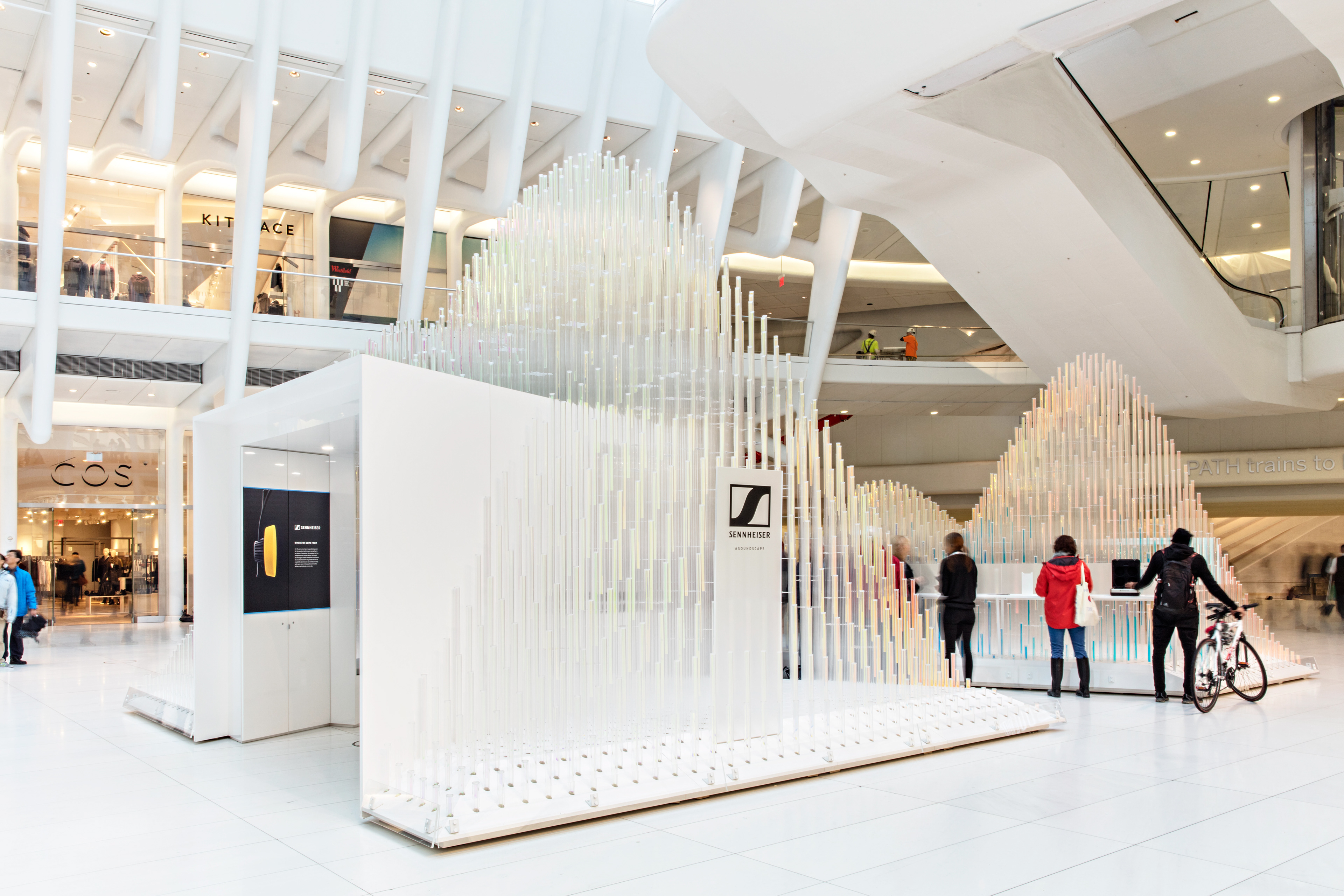 The Sennheiser Soundscape is a design-forward retail landscape in the Oculus at World Trade Center, that aims to formally capture the purity, dynamism, and drama of sound as a hub for premium listening experiences. In the iconic Oculus atrium, the installation is designed to create a complimentary sculptural landmark that conveys the German brand’s design and engineering-forward emphasis. The architectural landscape is created with over 2000 undulating “sound rods”. Each plexi-glass rod houses a dichroic coated glass insert that filters the natural and artificial light within the Oculus into vibrant color that shifts throughout the day and as one walks around and through the installation. The concept was sculpted and developed iteratively to express key qualities of sound such as order and chaos, power and intensity, science and rationality, and emotion. Using parametric 3D modeling tools, the installation was developed digitally to mirror Sennheiser’s engineering-forward approach. This process allowed for quick iterative changes to thousands of elements, creating a seemingly complex execution from simple formulaic rules.