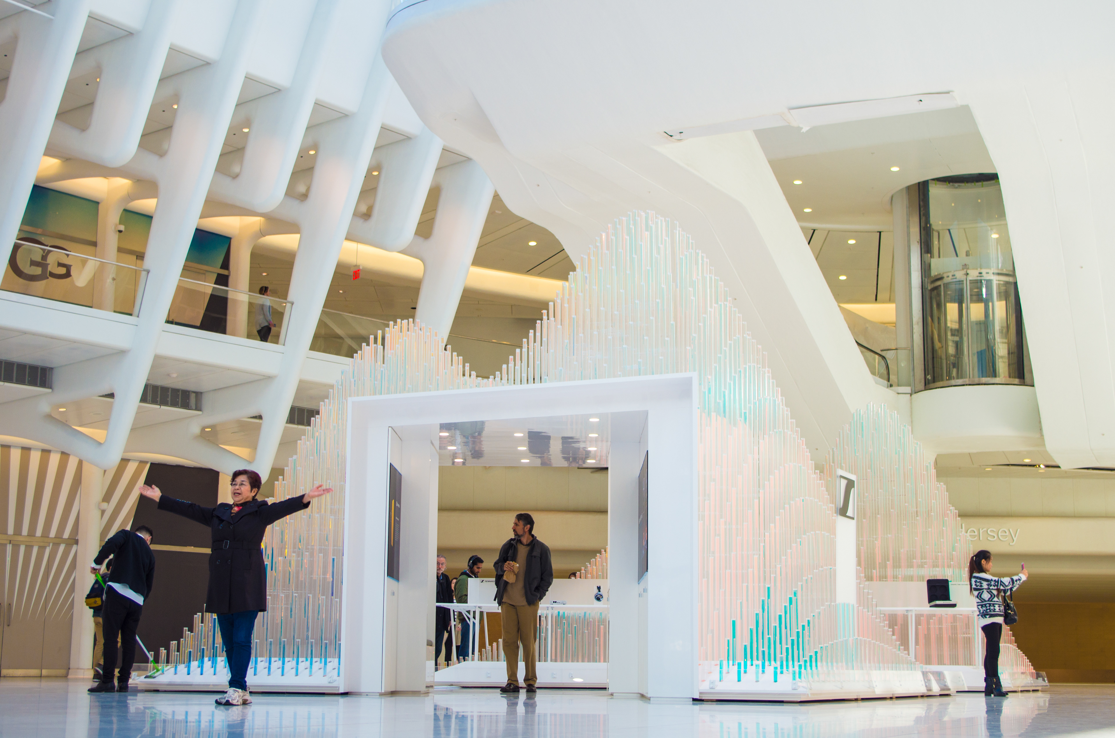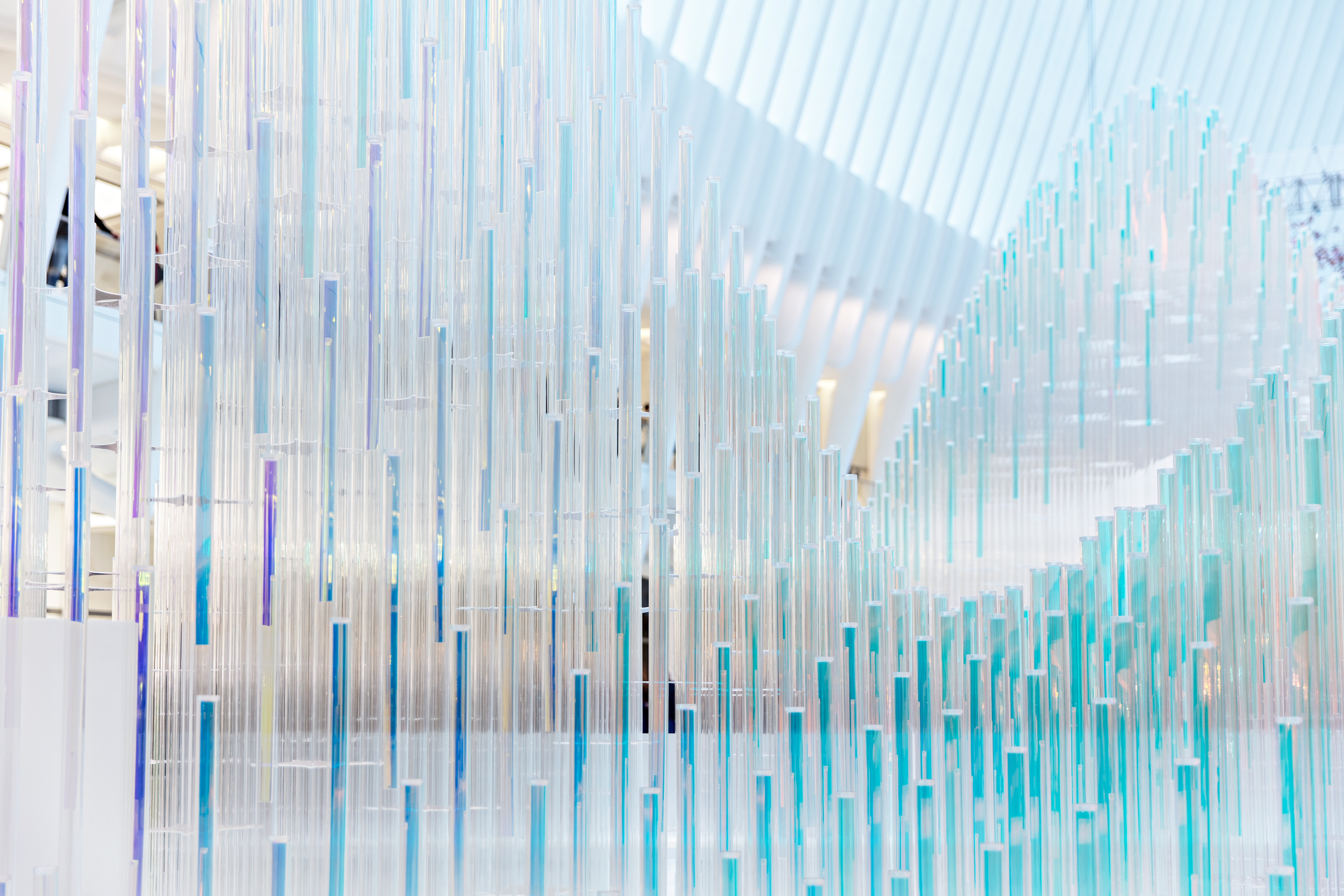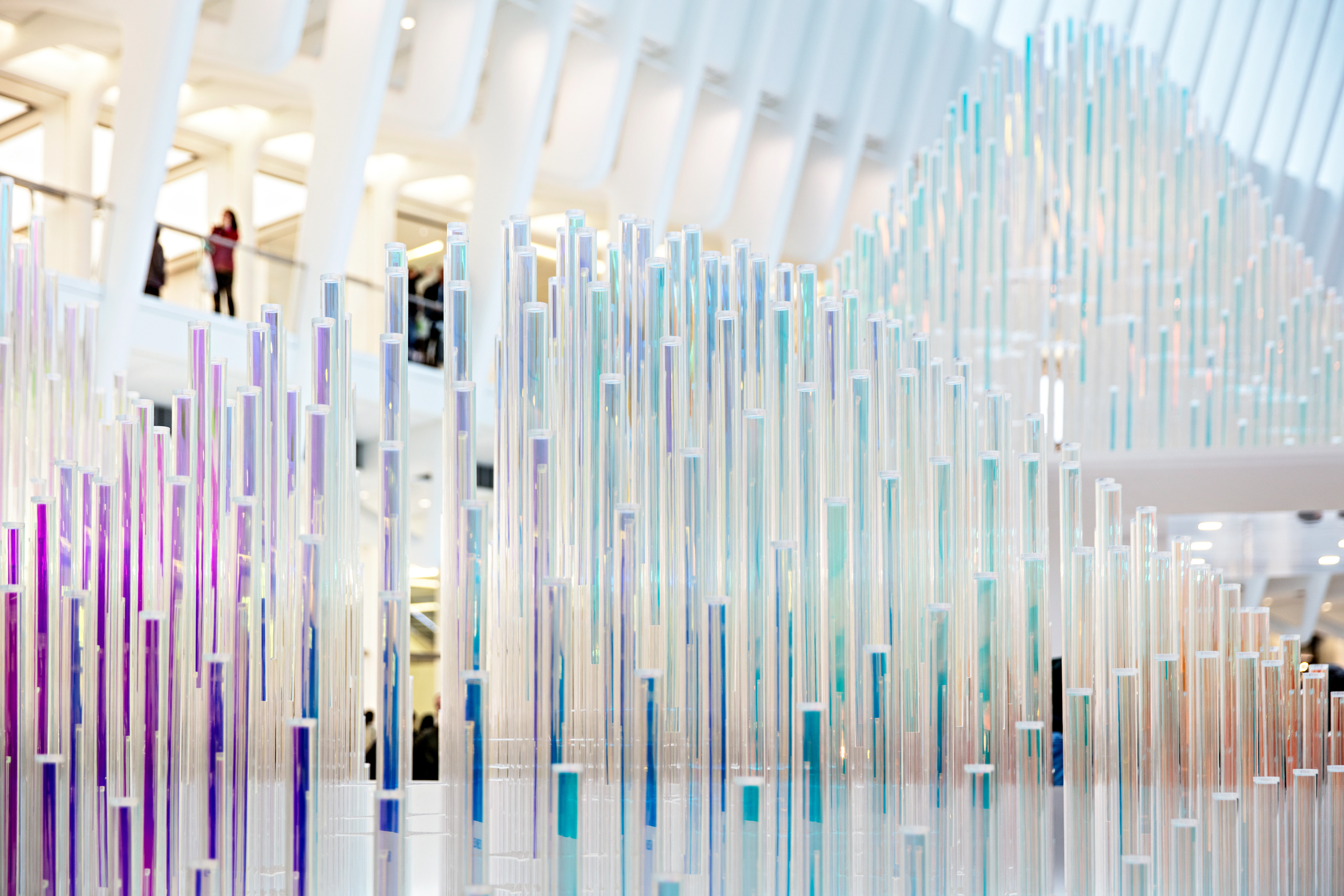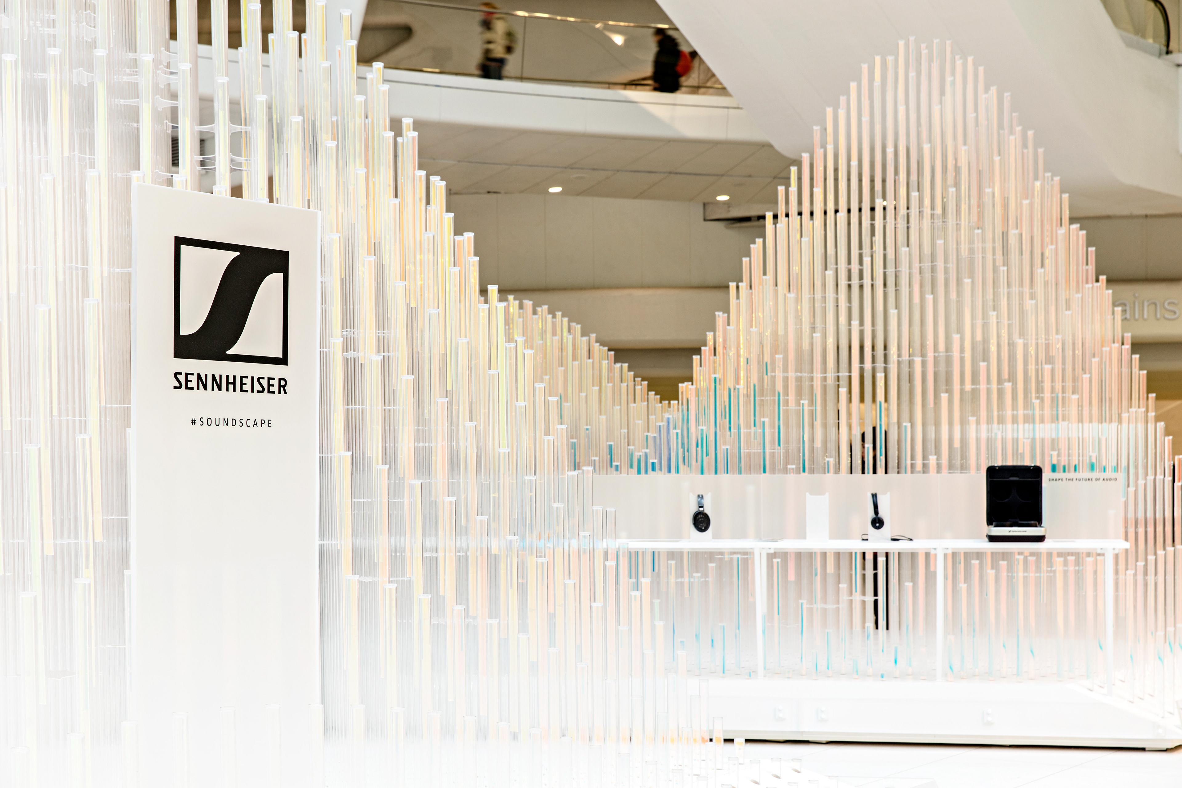 The Sennheiser Soundscape is a design-forward retail landscape in the Oculus at World Trade Center, that aims to formally capture the purity, dynamism, and drama of sound as a hub for premium listening experiences. In the iconic Oculus atrium, the installation is designed to create a complimentary sculptural landmark that conveys the German brand’s design and engineering-forward emphasis. The architectural landscape is created with over 2000 undulating “sound rods”. Each plexi-glass rod houses a dichroic coated glass insert that filters the natural and artificial light within the Oculus into vibrant color that shifts throughout the day and as one walks around and through the installation. The concept was sculpted and developed iteratively to express key qualities of sound such as order and chaos, power and intensity, science and rationality, and emotion. Using parametric 3D modeling tools, the installation was developed digitally to mirror Sennheiser’s engineering-forward approach. This process allowed for quick iterative changes to thousands of elements, creating a seemingly complex execution from simple formulaic rules.