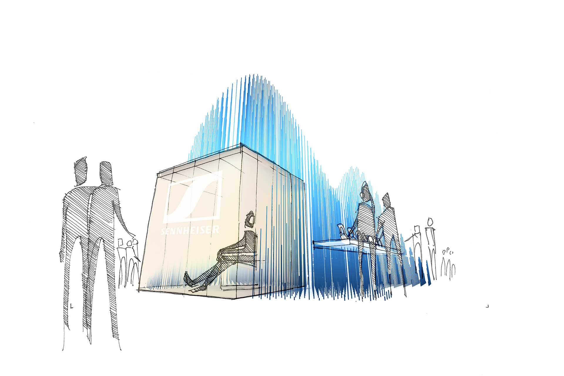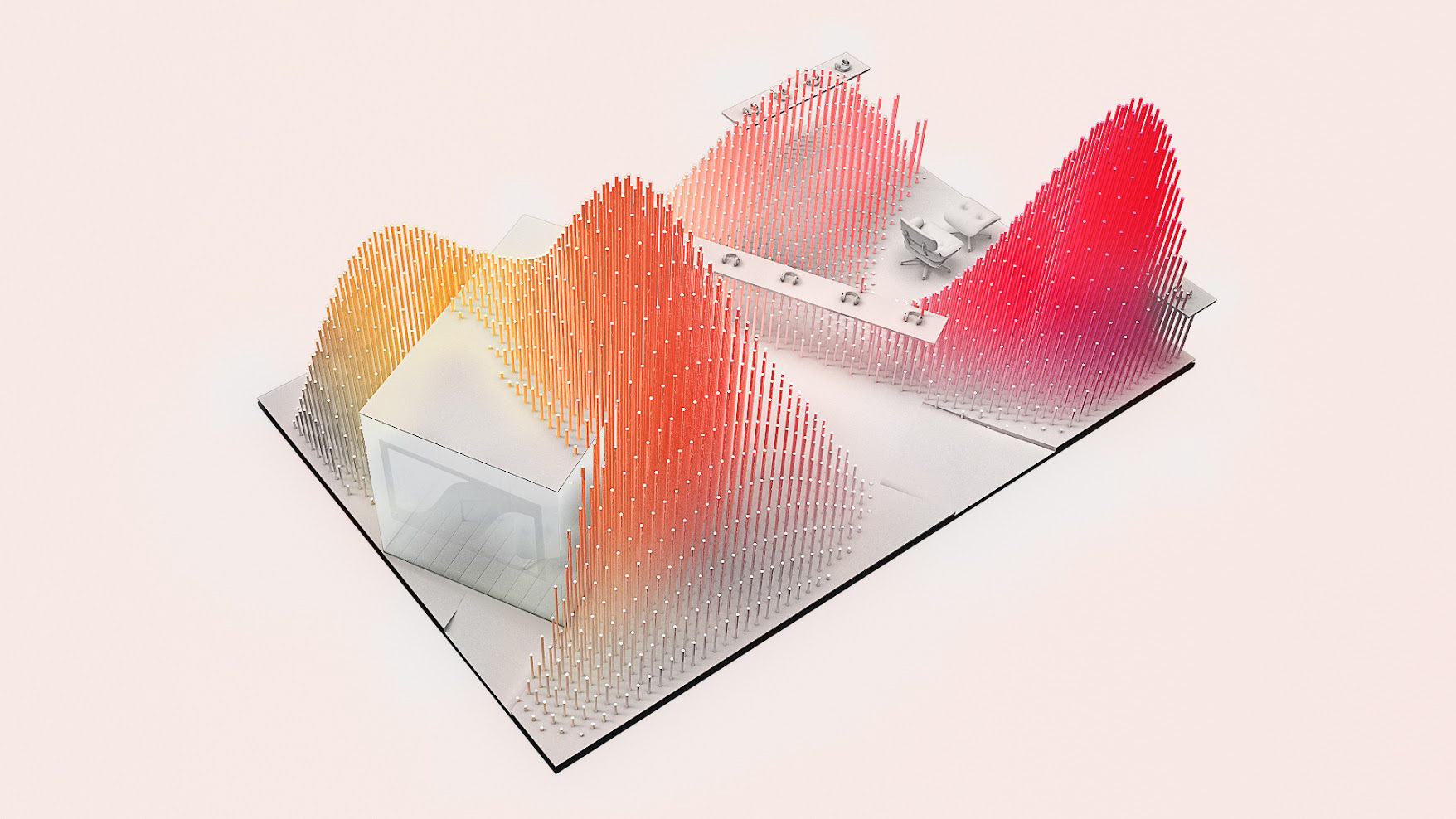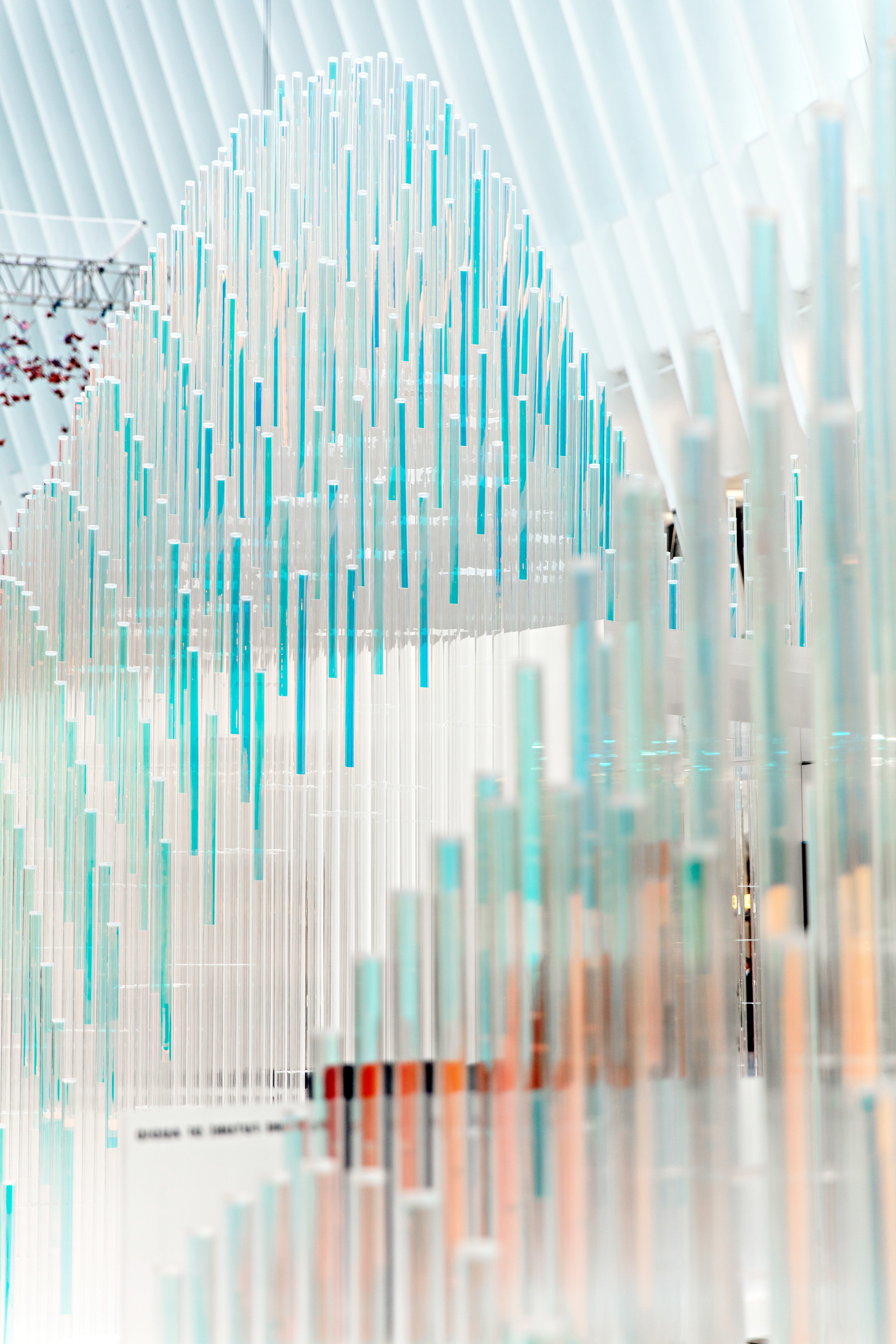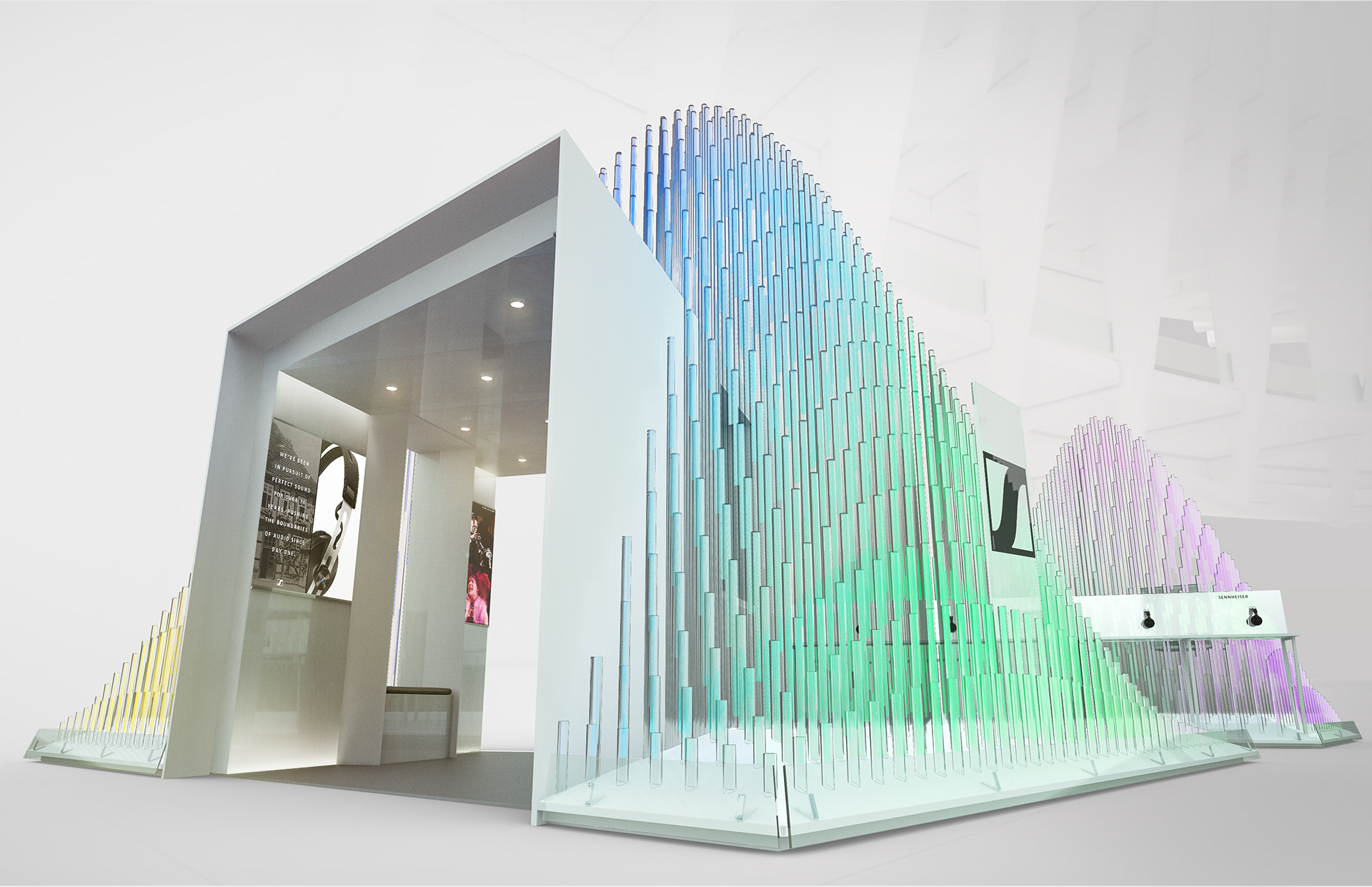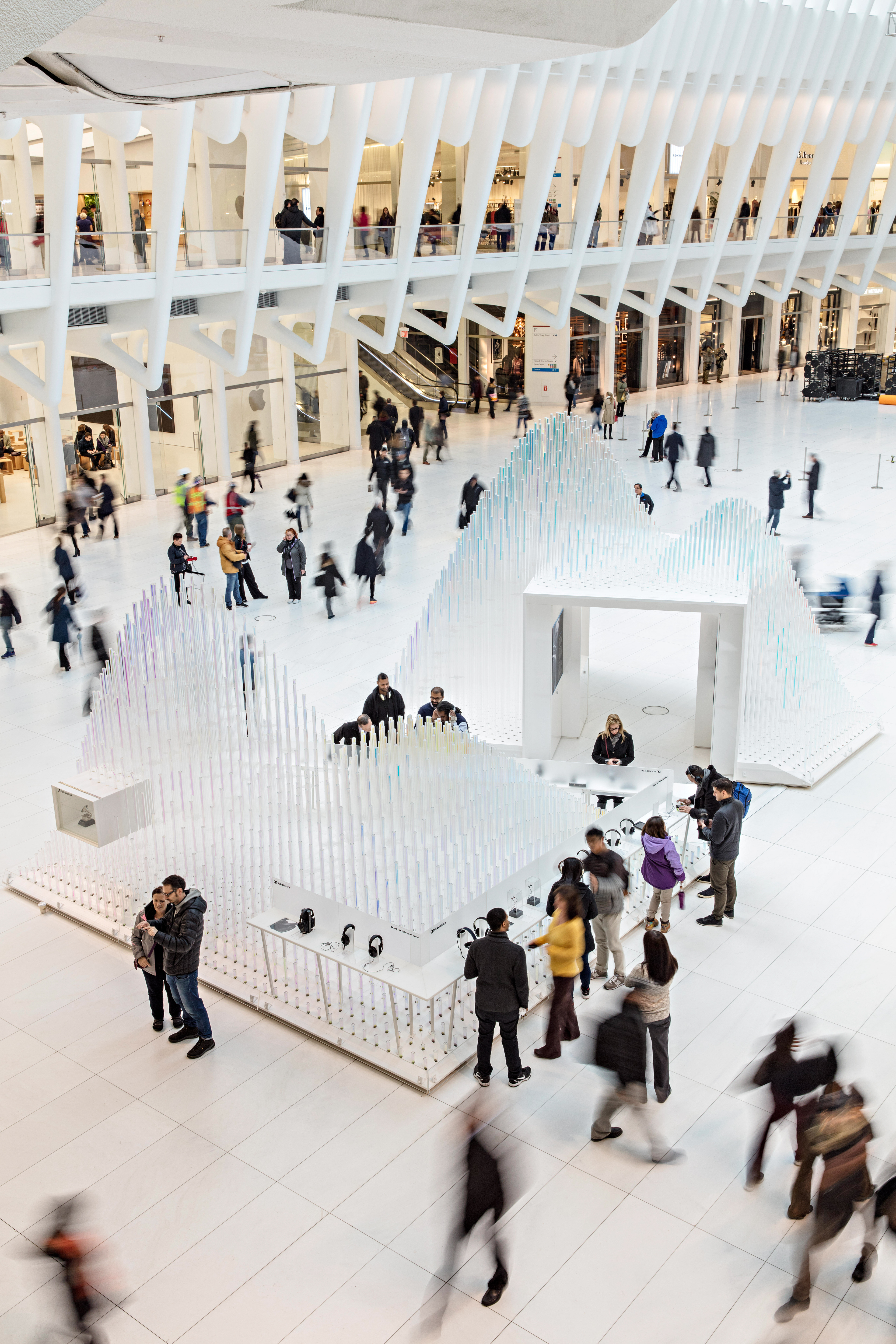 The Sennheiser Soundscape is a design-forward retail landscape in the Oculus at World Trade Center, that aims to formally capture the purity, dynamism, and drama of sound as a hub for premium listening experiences. In the iconic Oculus atrium, the installation is designed to create a complimentary sculptural landmark that conveys the German brand’s design and engineering-forward emphasis. The architectural landscape is created with over 2000 undulating “sound rods”. Each plexi-glass rod houses a dichroic coated glass insert that filters the natural and artificial light within the Oculus into vibrant color that shifts throughout the day and as one walks around and through the installation. The concept was sculpted and developed iteratively to express key qualities of sound such as order and chaos, power and intensity, science and rationality, and emotion. Using parametric 3D modeling tools, the installation was developed digitally to mirror Sennheiser’s engineering-forward approach. This process allowed for quick iterative changes to thousands of elements, creating a seemingly complex execution from simple formulaic rules.