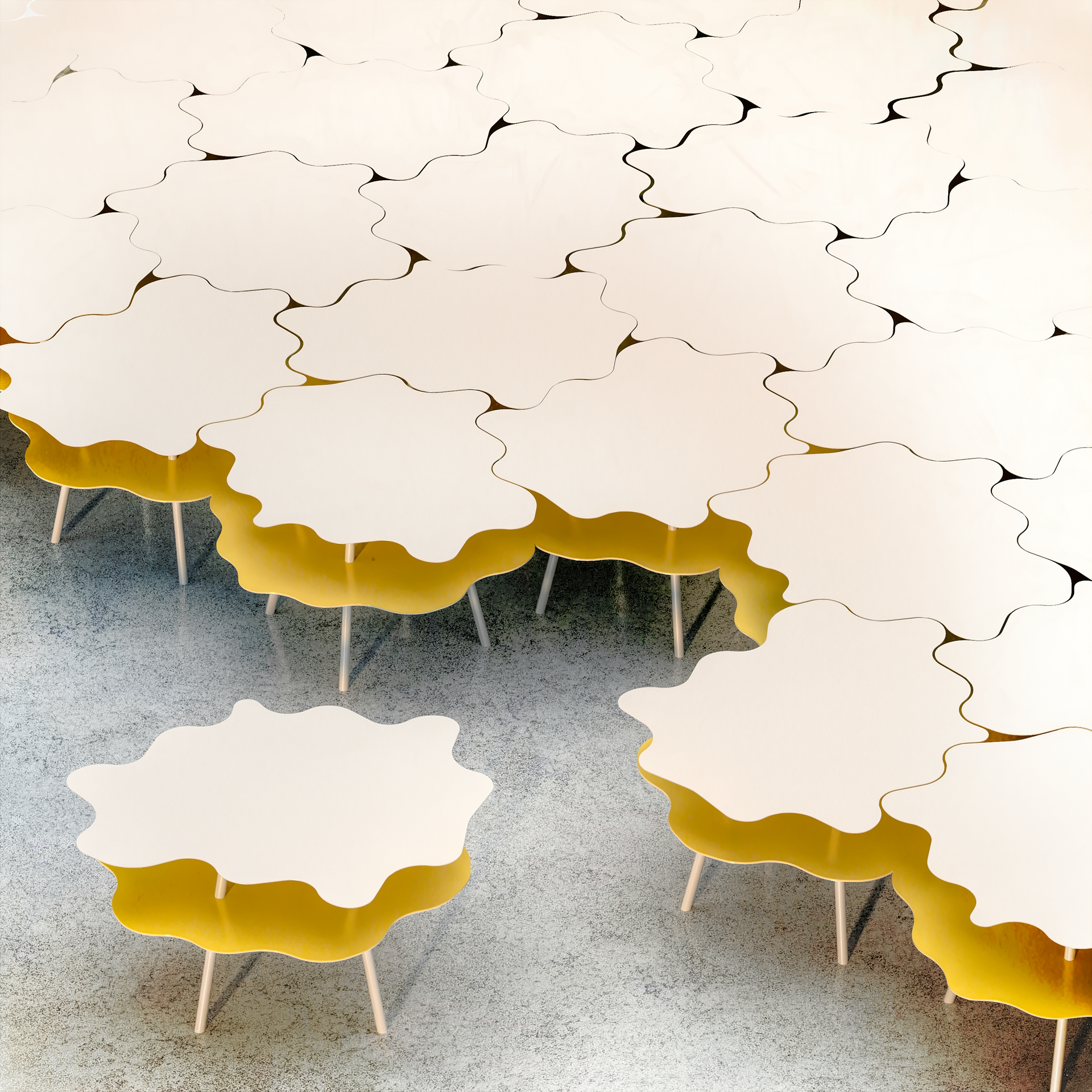 Inspiration for the table draws from several disciplines - techniques of pattern-making in the context of textile design inform the motif with an offset repeat that’s difficult to visually detect, and the idea of a tessellation is both geometric and artistic. Applying these properties using computational and parametric tools allows us to hone the shape in a multitude of iterations. The result is two tessellations occurring in conjunction to create the ultimate side or accent table. Both surfaces are carefully designed to create space for storage and display that nest together infinitely in all directions.