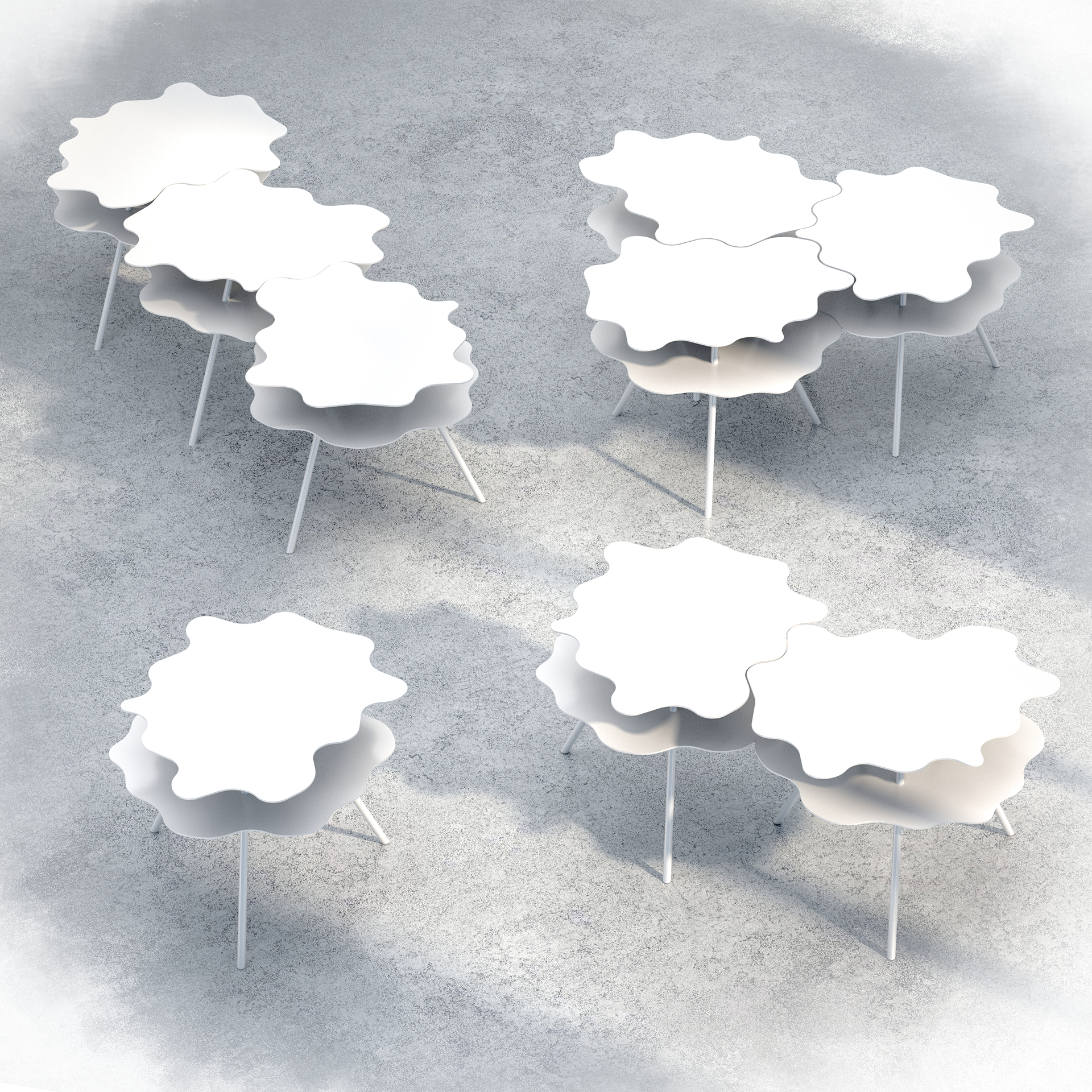 The Ba Table as an individual piece is an expressive layered sculpture, an undulating splash captured in metal. When more tables are introduced the single table grows to a kit of parts with infinite compositions. The hexagonal organization allows each table to retain its expressiveness while providing maximum flexibility to configure in a variety of ways: a circular pod, long linear table, zig-zag, or grand pyramid, to name a few. The table is designed to feel random and gestural but is utterly precise, which makes the adaptability surprising.